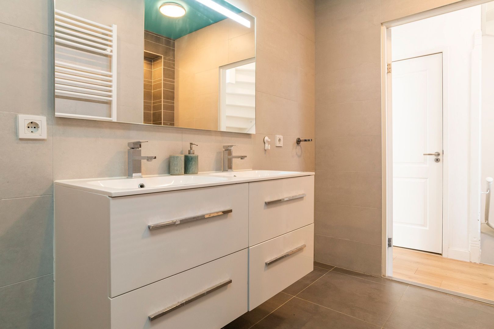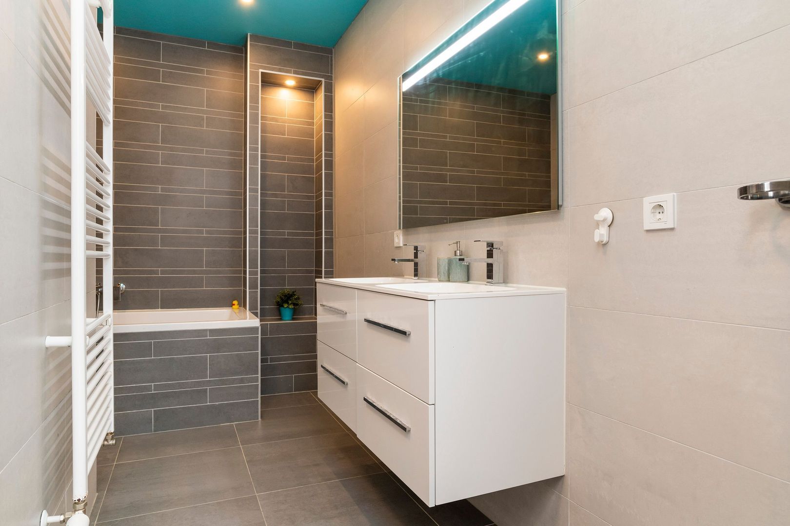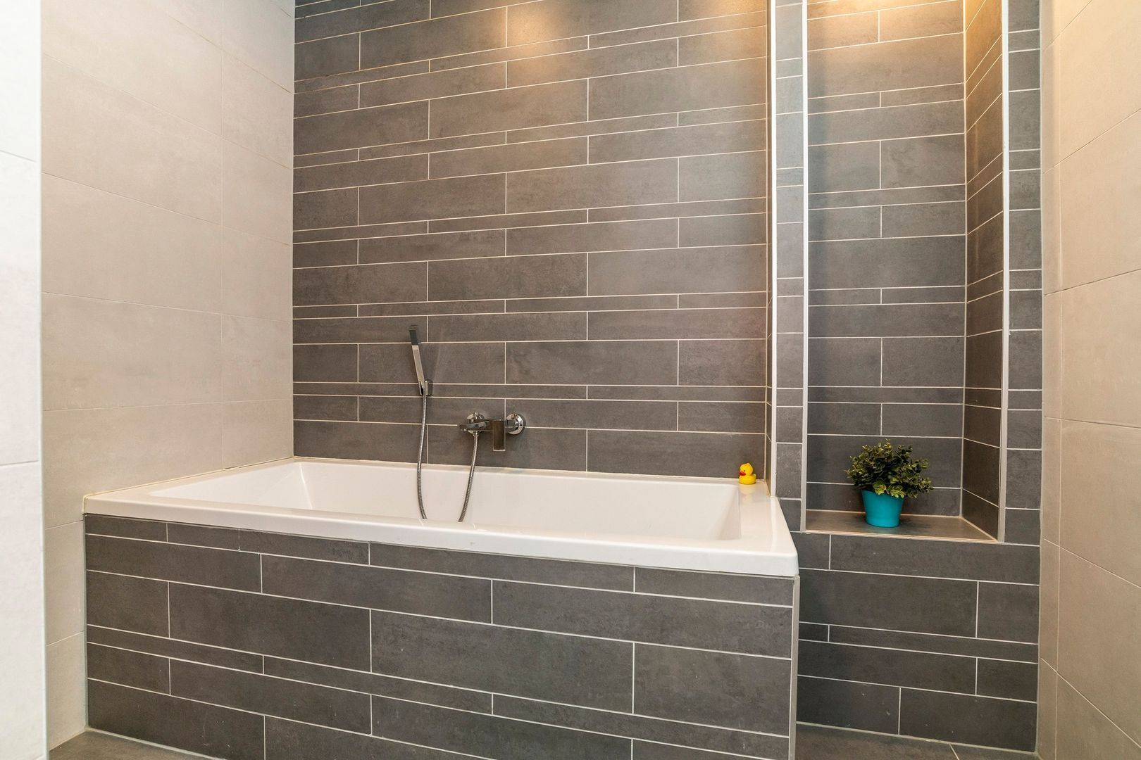 Tussengelegen moderne badkamer met ligbad, douche, wc en dubbele wastafel.