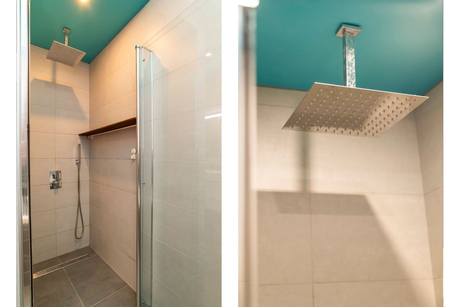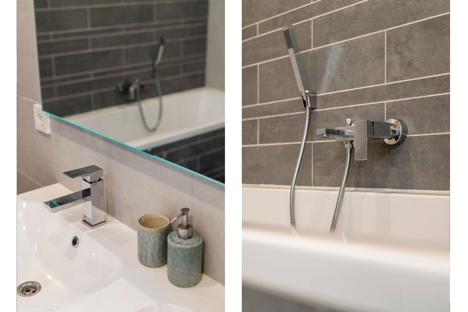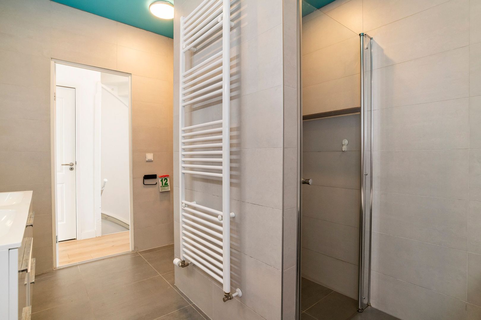 Tussengelegen moderne badkamer met ligbad, douche, wc en dubbele wastafel.