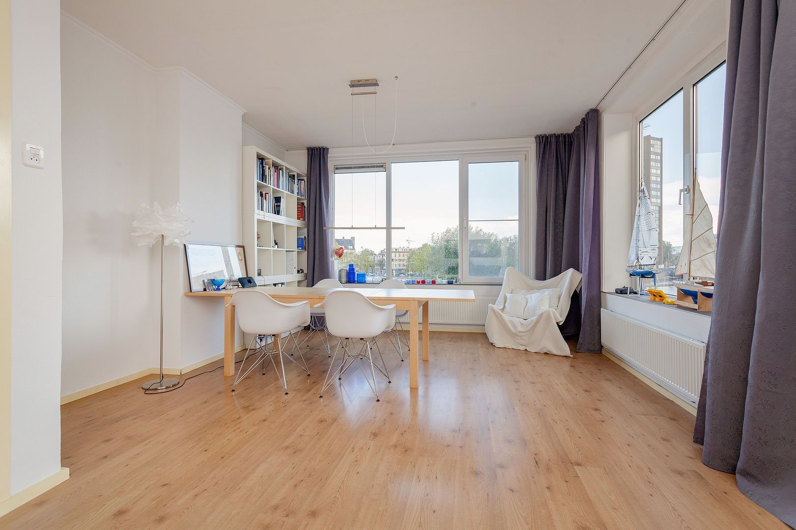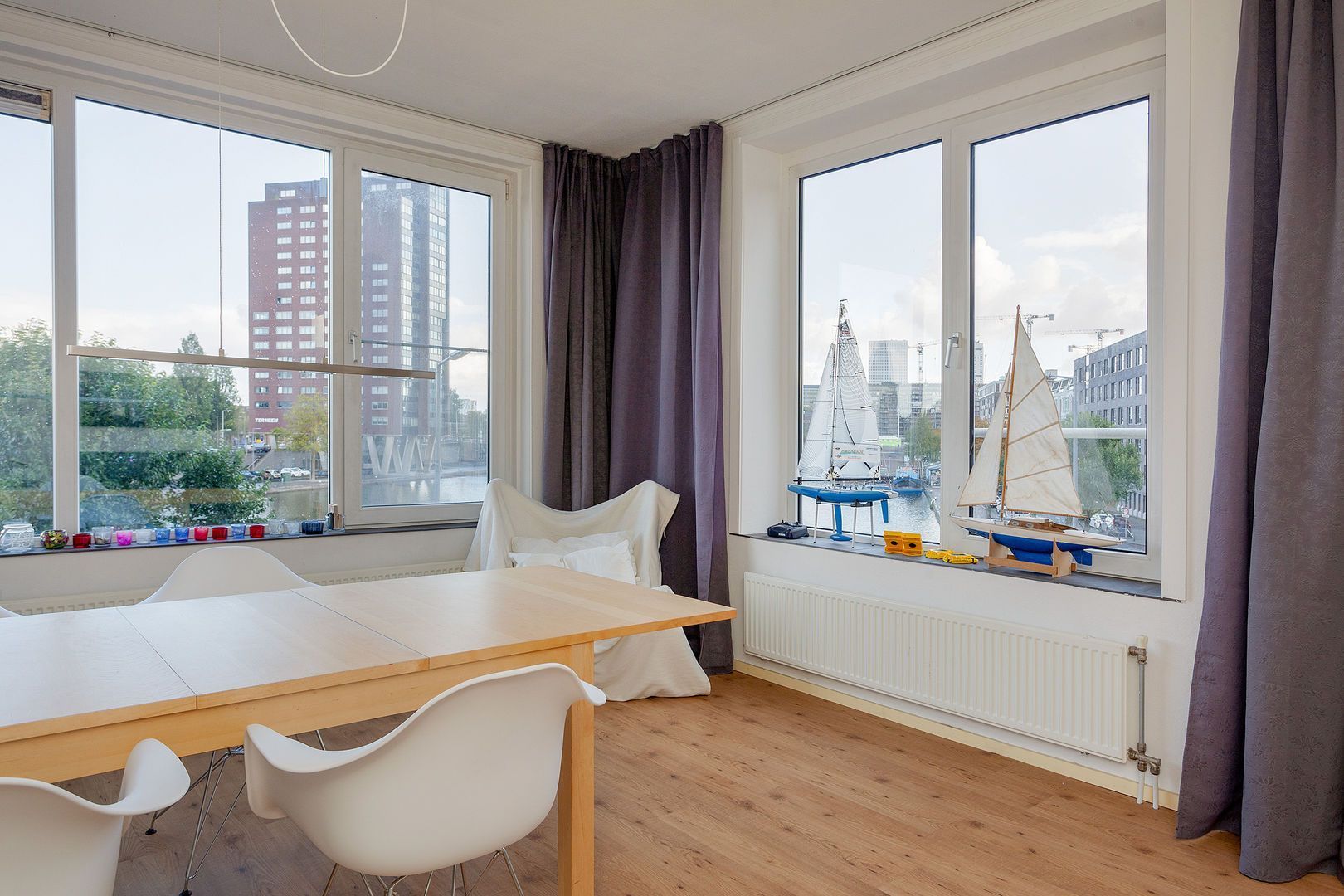 Prachtig op de hoek gelegen woonkamer (1) ca. 30 m2 met vrij uitzicht over de Coolhaven en het stadscentrum.