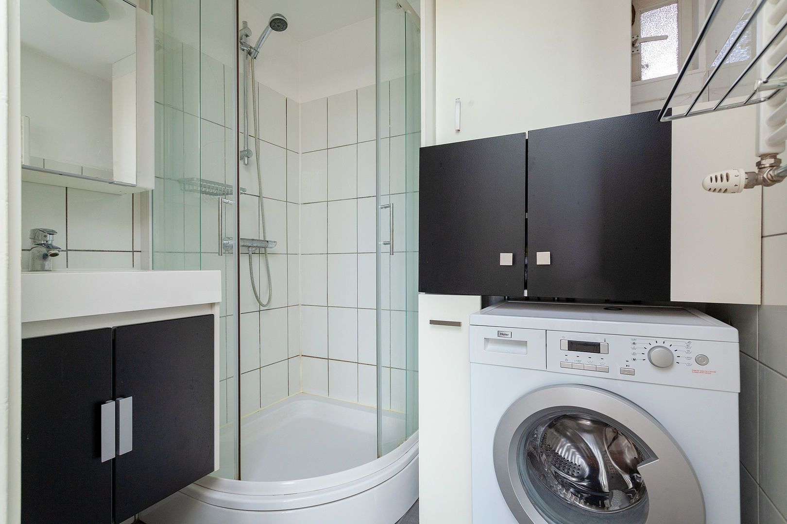 Nette badkamer met douche, wastafel, designradiator en een aansluiting voor wasapparatuur.