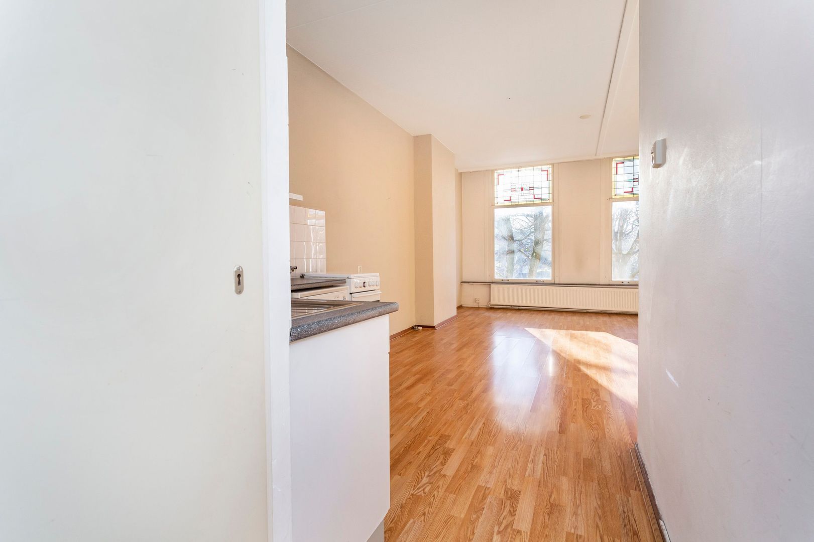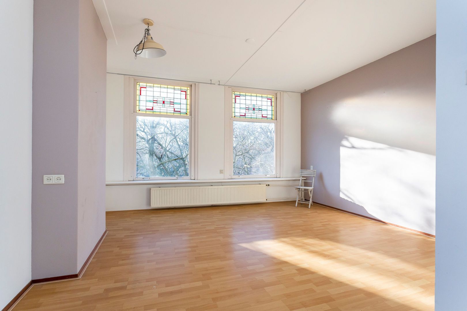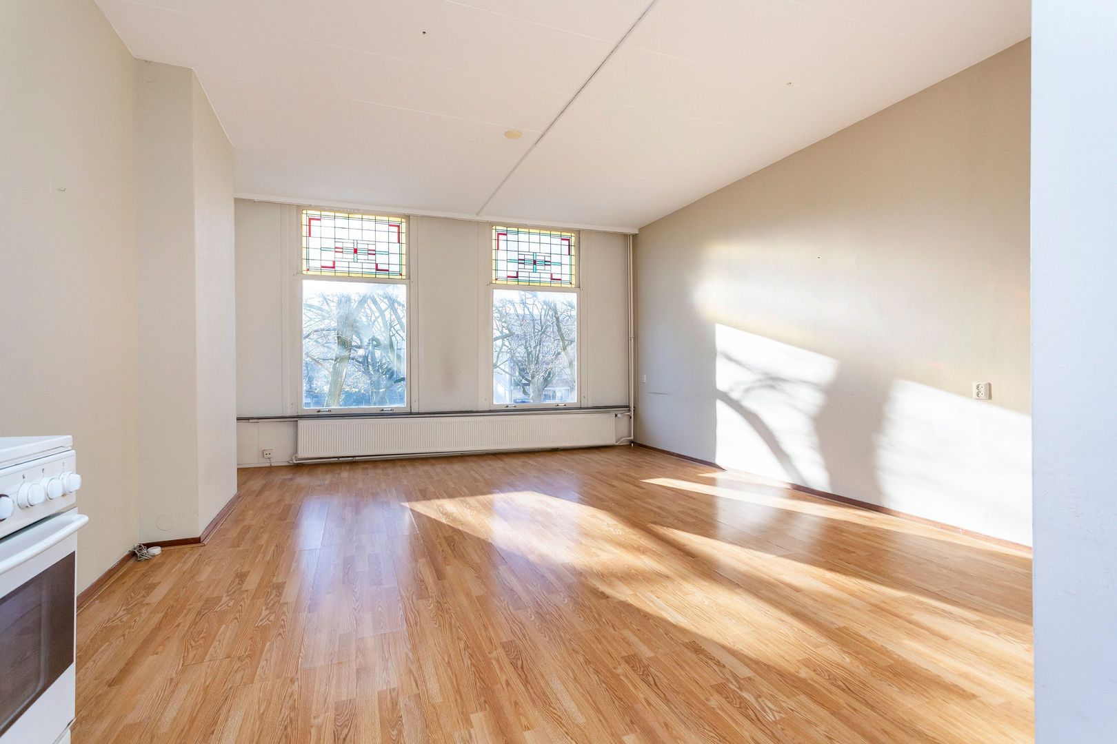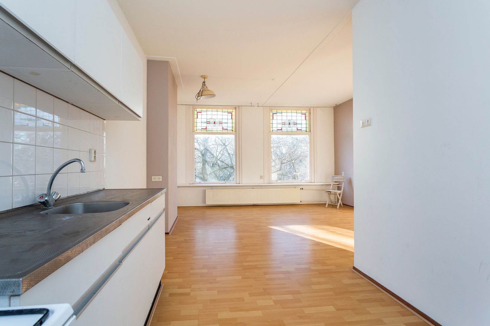 Overloop, L-vormige kamer ca. 35m², aan singelzijde, met grandioos 3 ramen breed zicht over de singel. Toiletruimte. Open keukenruimte met eenvoudig keukenblok.