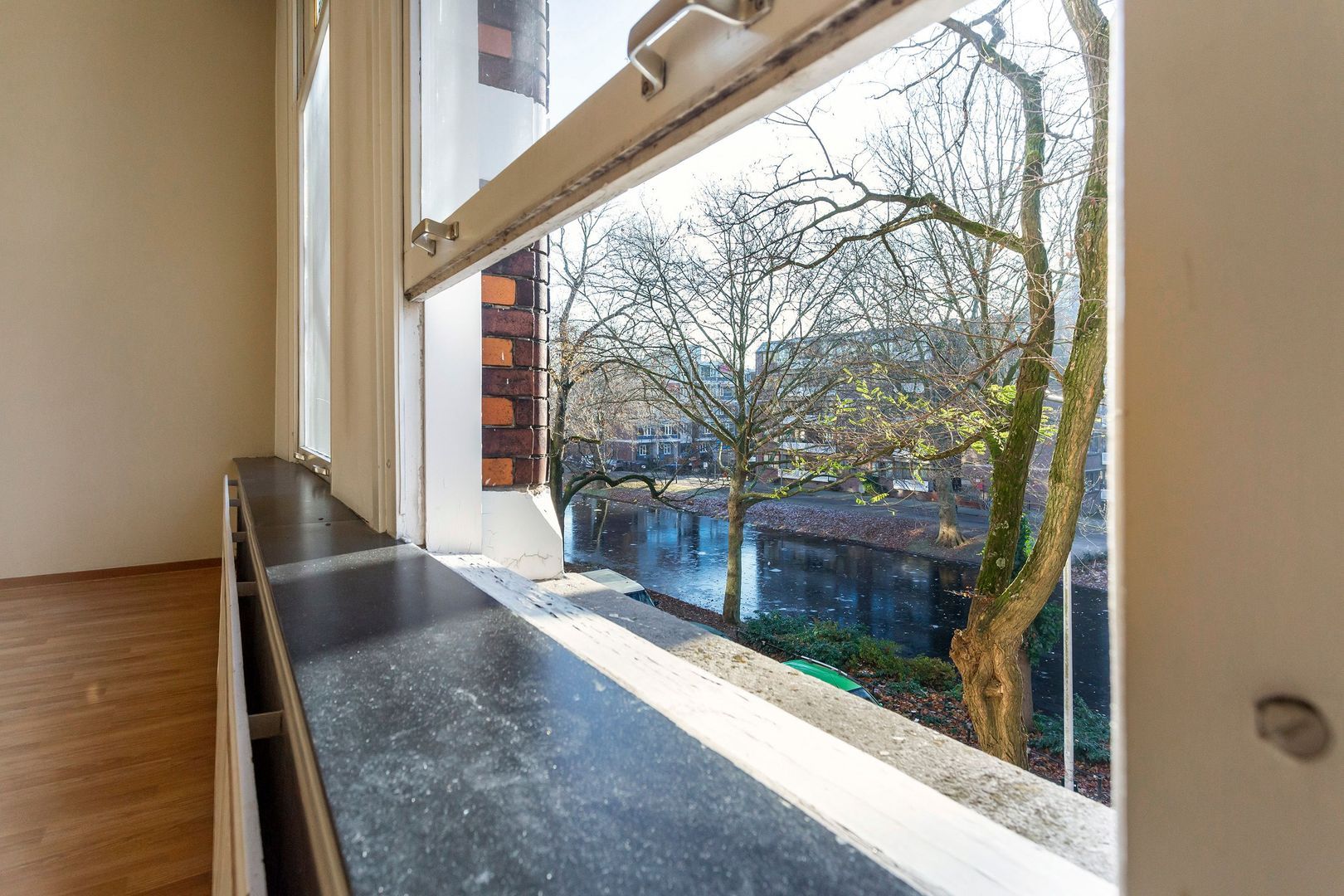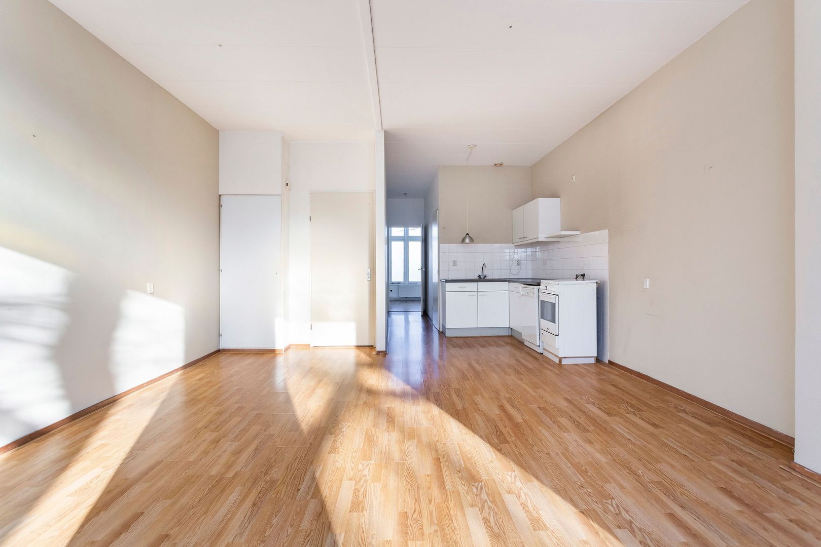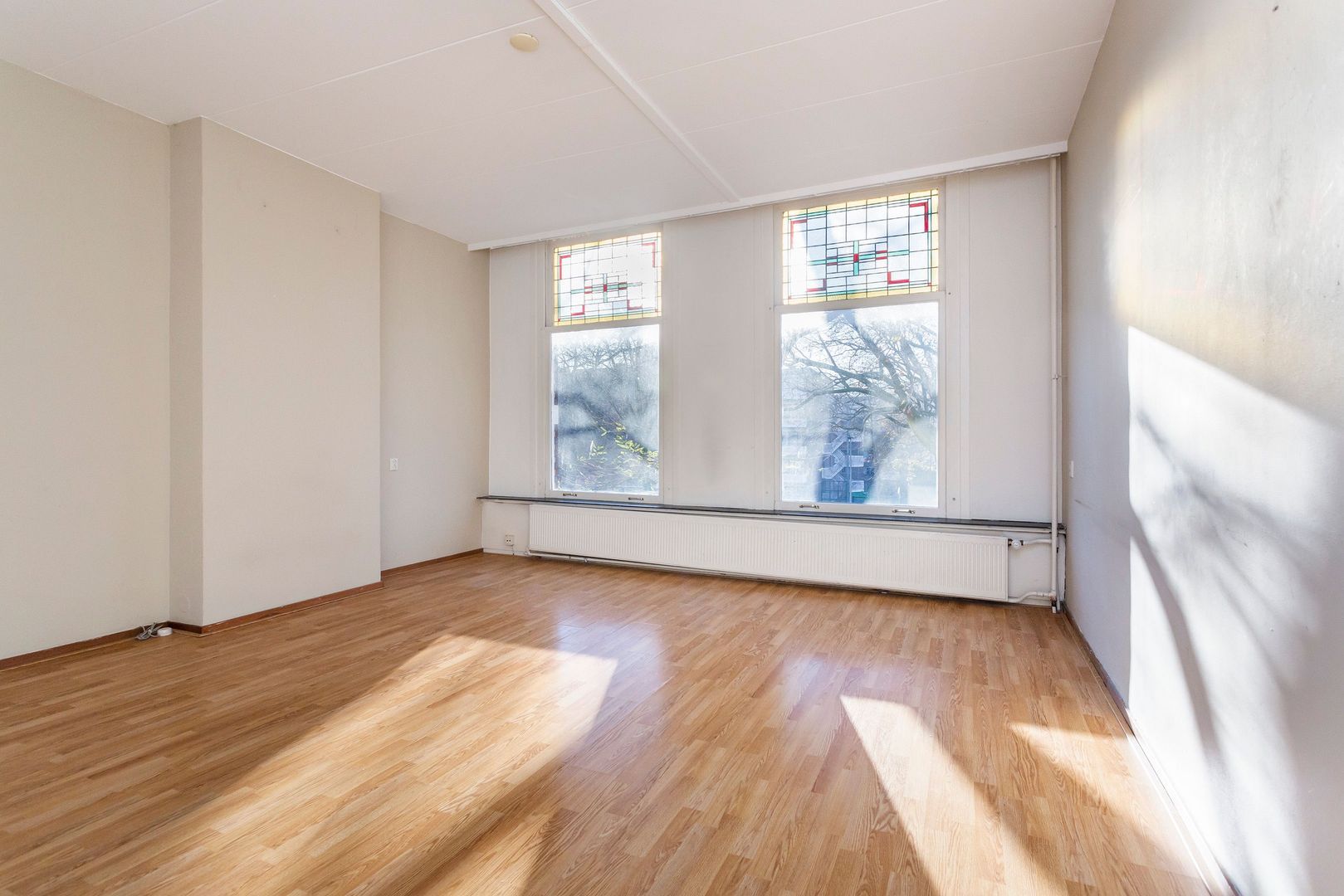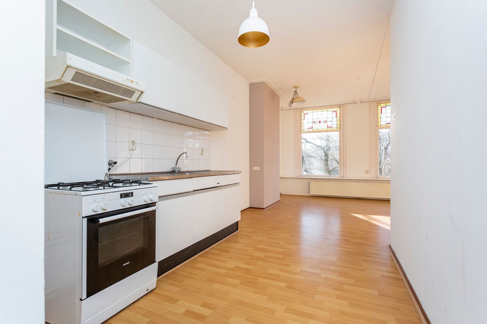 Overloop, L-vormige kamer ca. 35m², aan singelzijde, met grandioos 3 ramen breed zicht over de singel. Toiletruimte. Open keukenruimte met eenvoudig keukenblok.