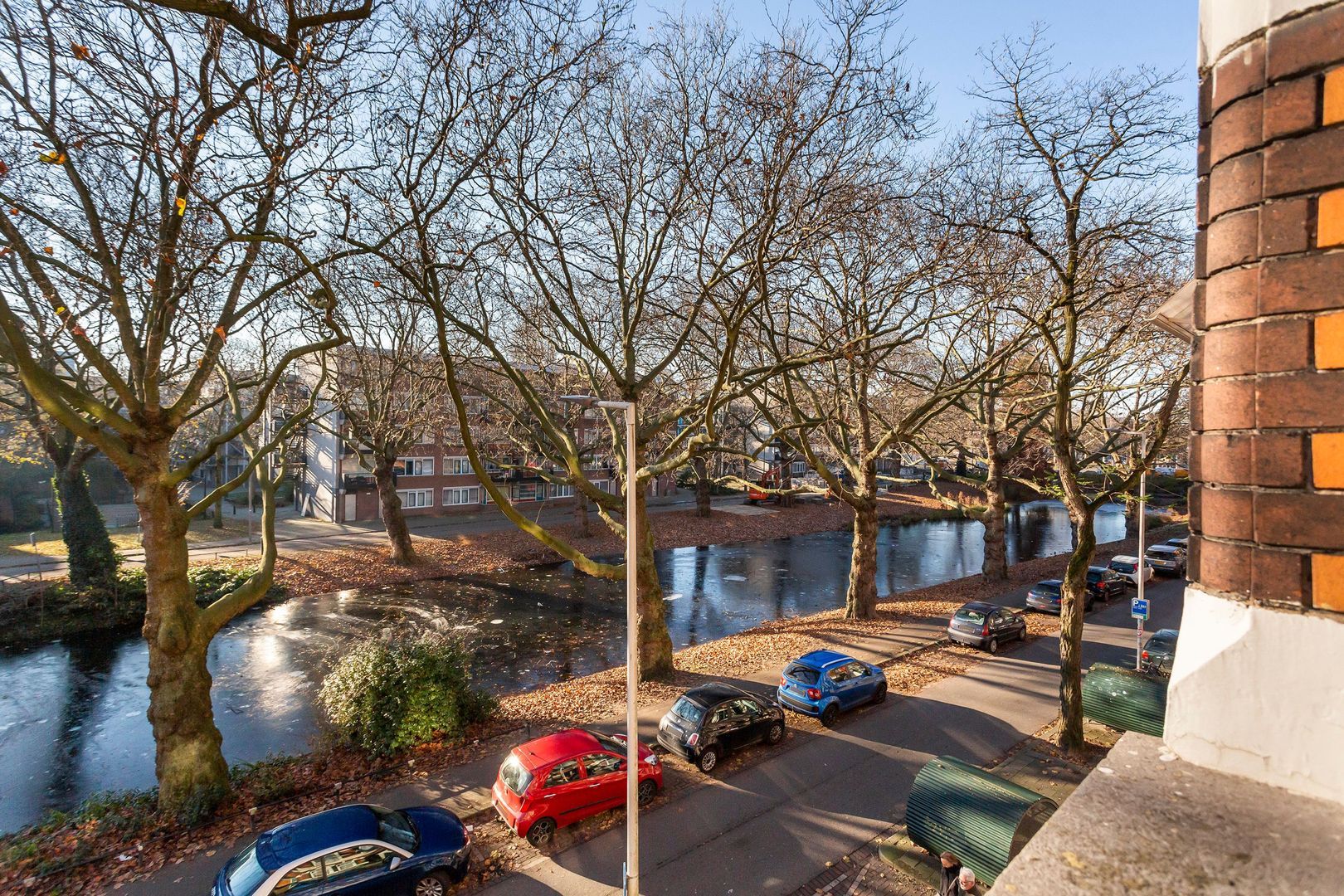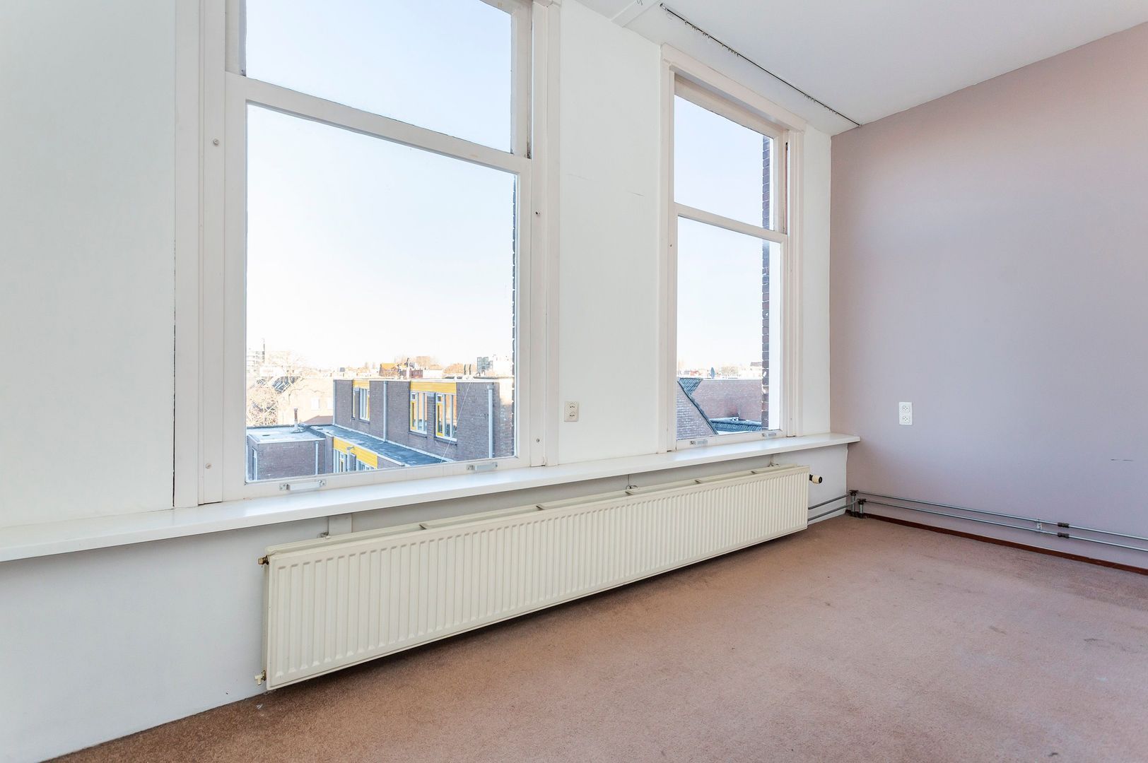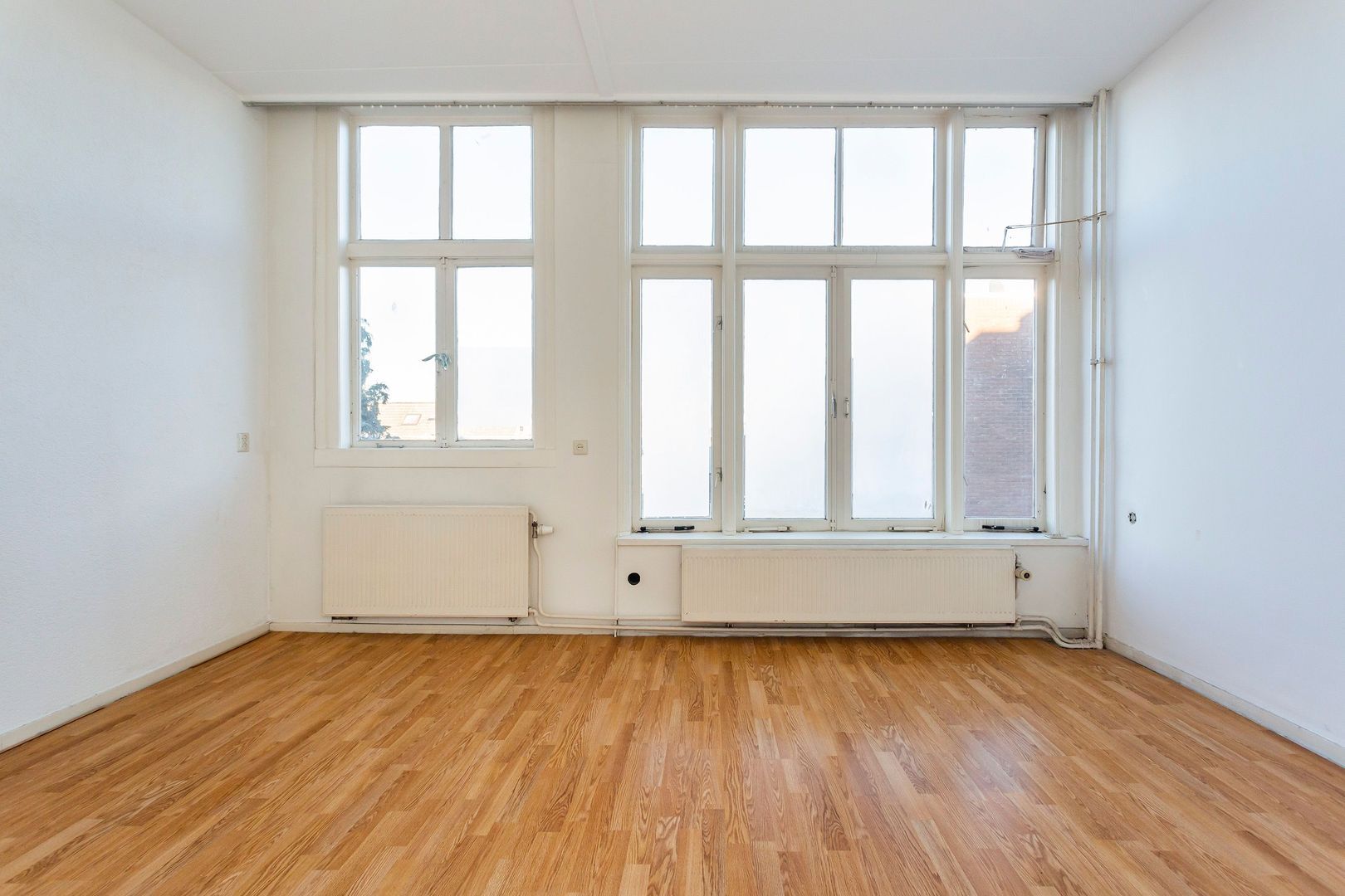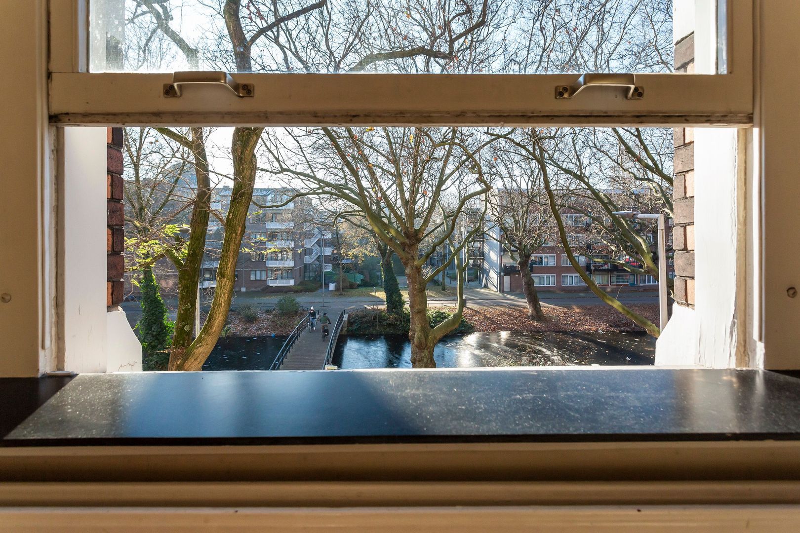 Overloop, L-vormige kamer ca. 35m², aan singelzijde, met grandioos 3 ramen breed zicht over de singel. Toiletruimte. Open keukenruimte met eenvoudig keukenblok.