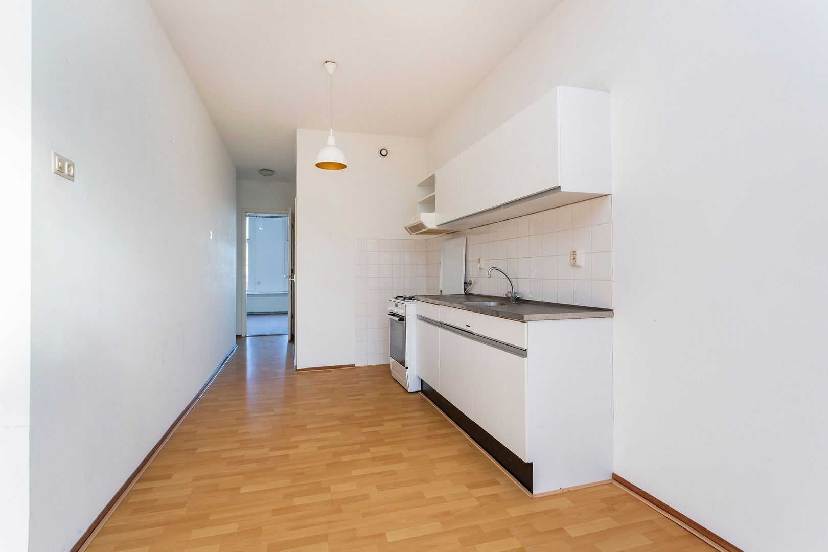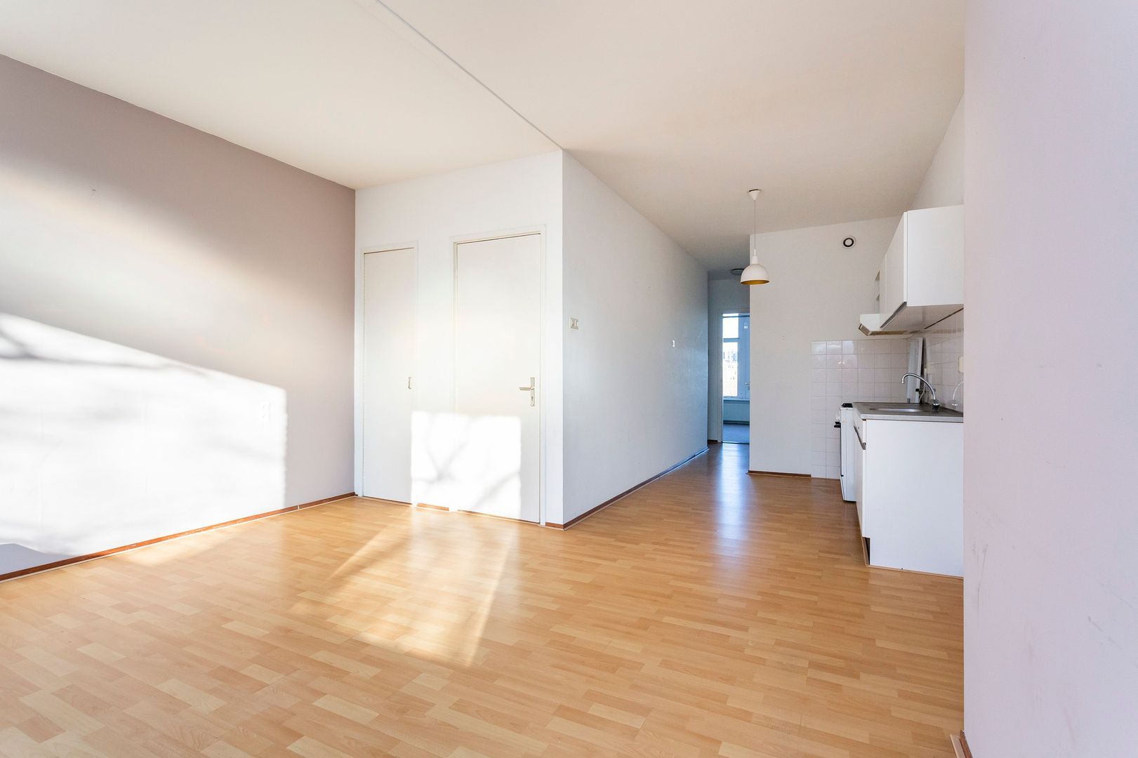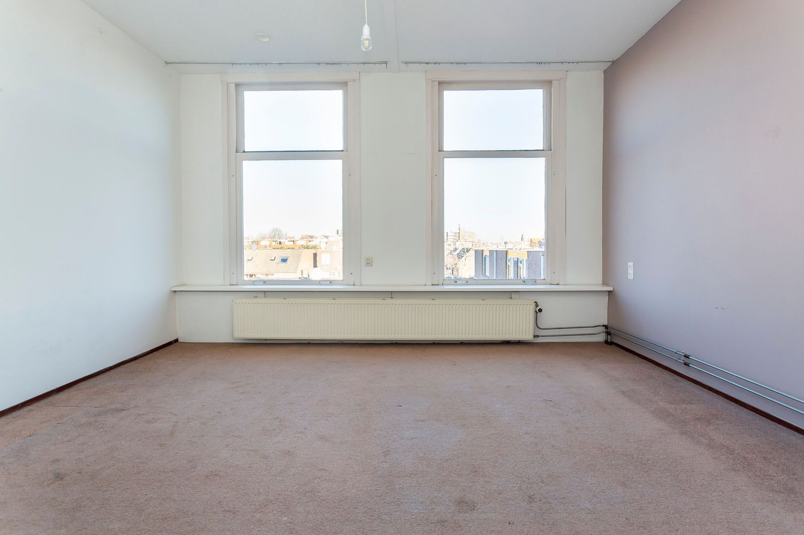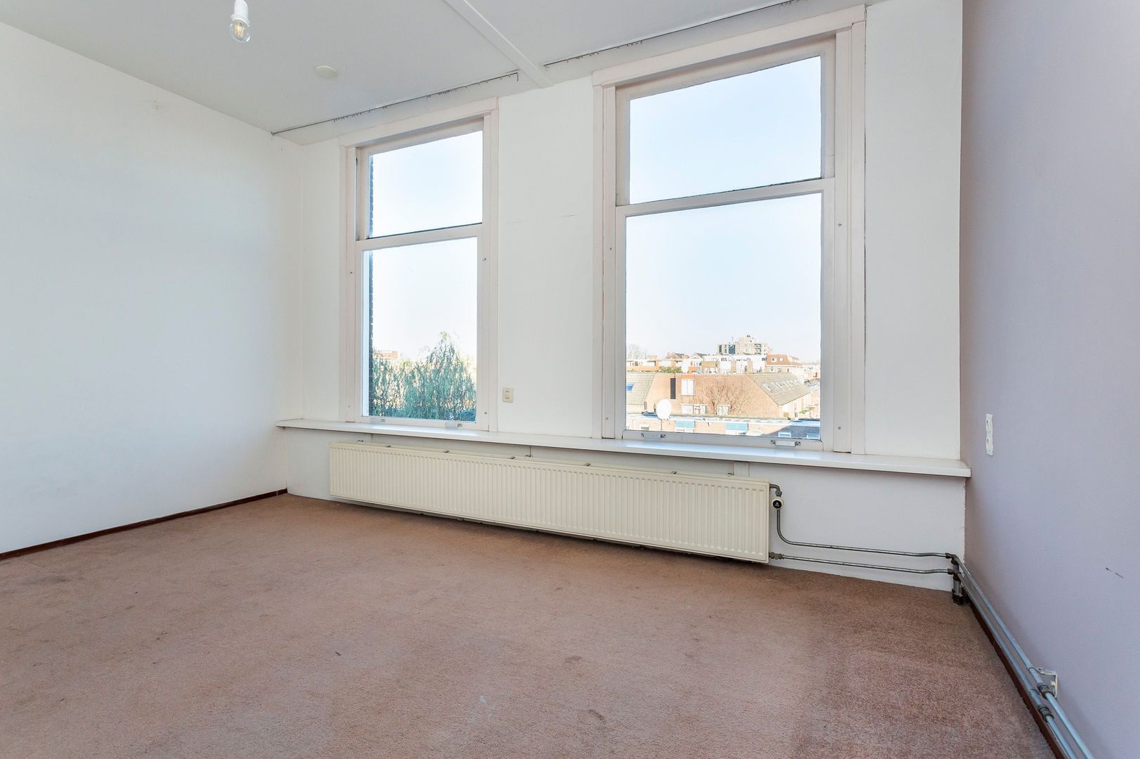 Overloop, L-vormige kamer ca. 35m², aan singelzijde, met grandioos 3 ramen breed zicht over de singel. Toiletruimte. Open keukenruimte met eenvoudig keukenblok.