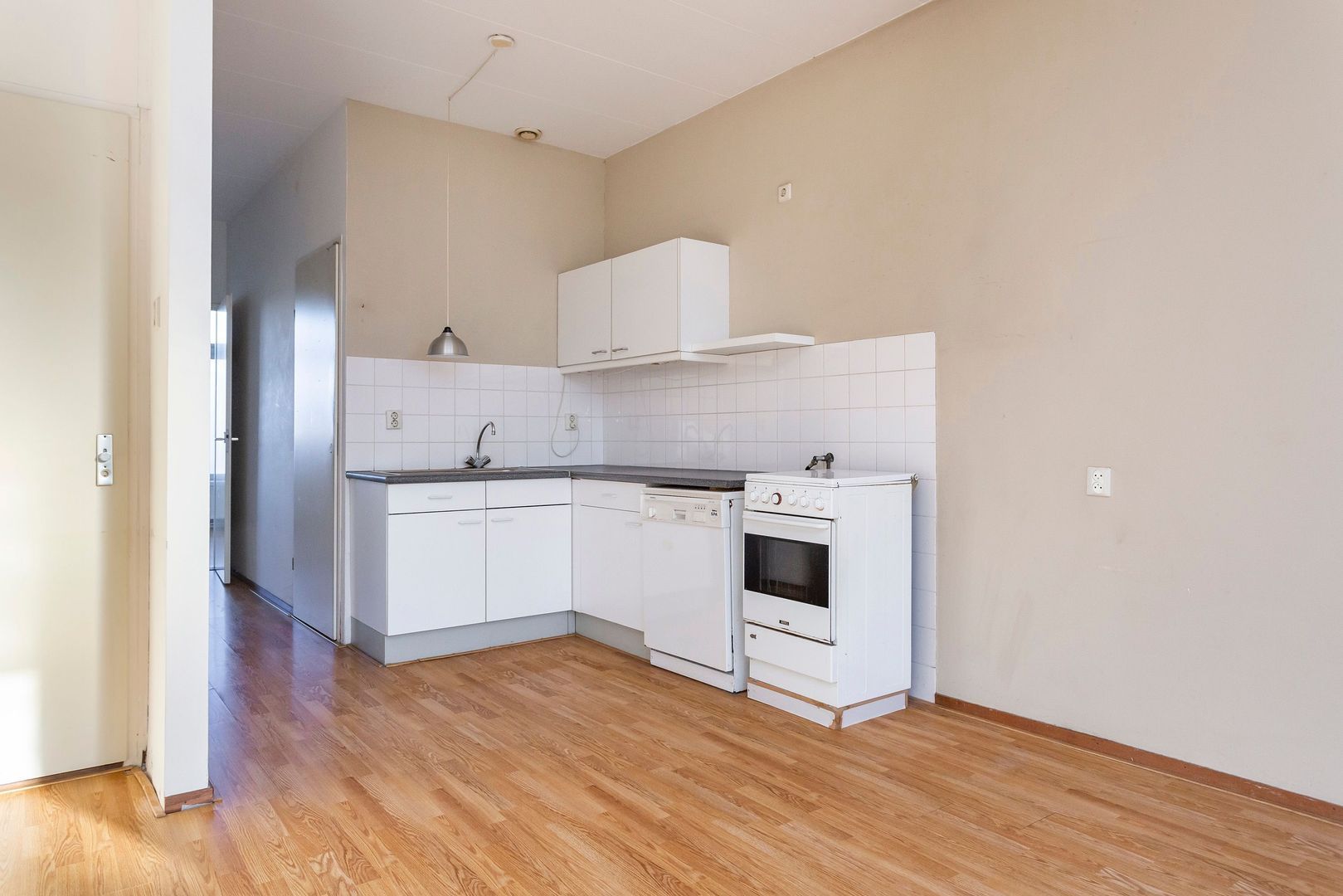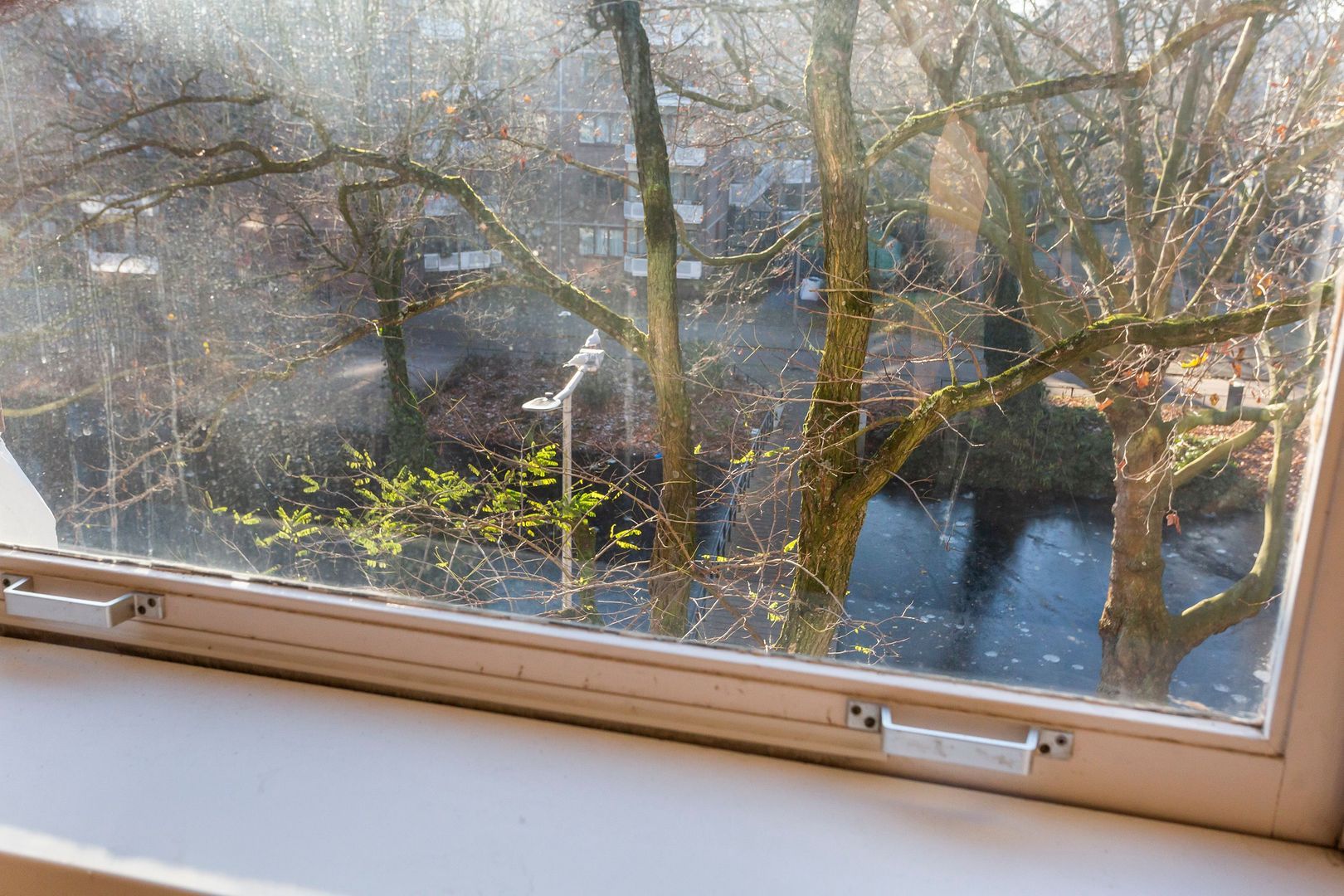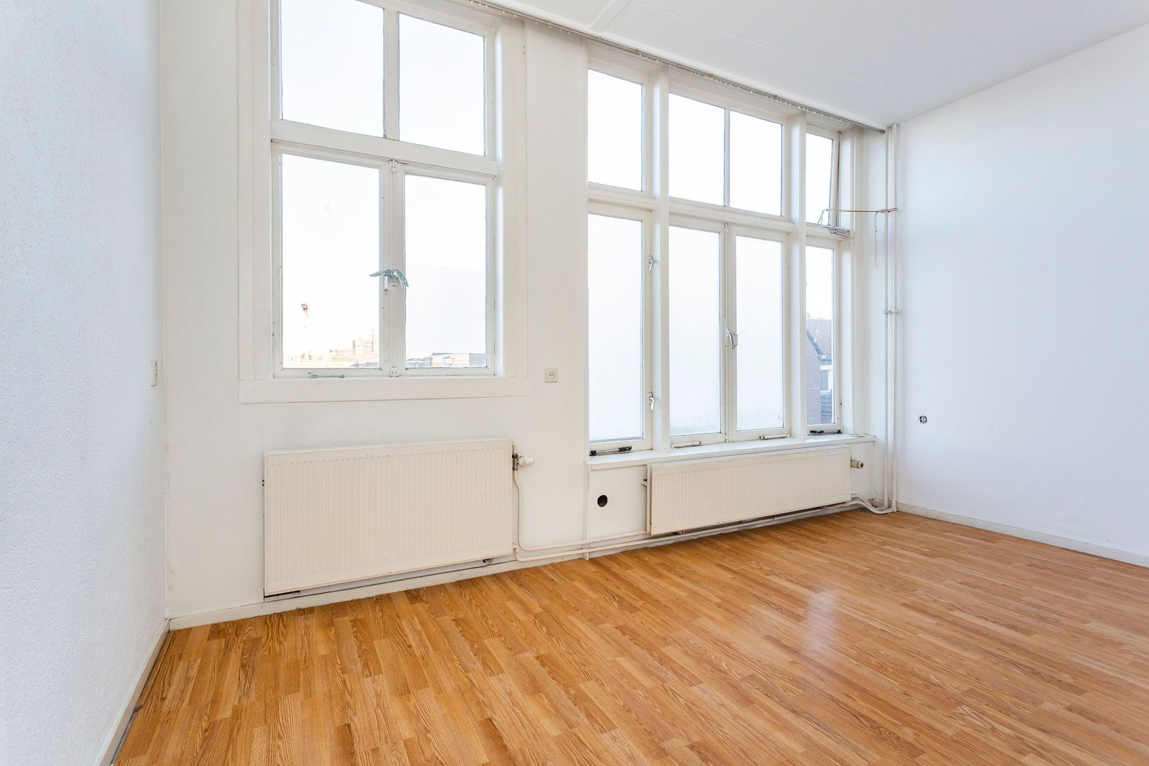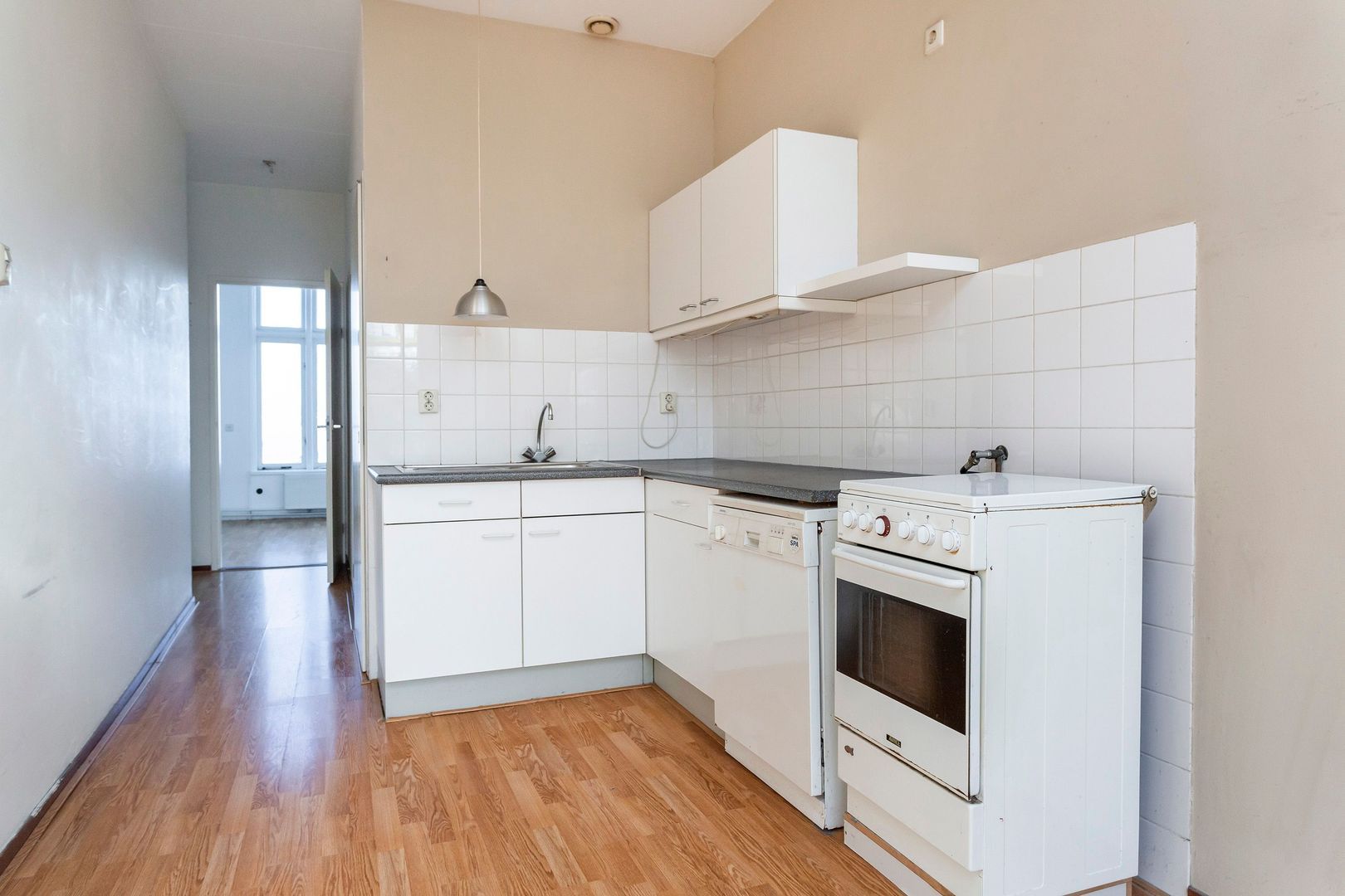 Overloop, L-vormige kamer ca. 33m², aan singelzijde, met grandioos 2 ramen breed zicht over de singel. Toiletruimte. Open keukenruimte met eenvoudig keukenblok.