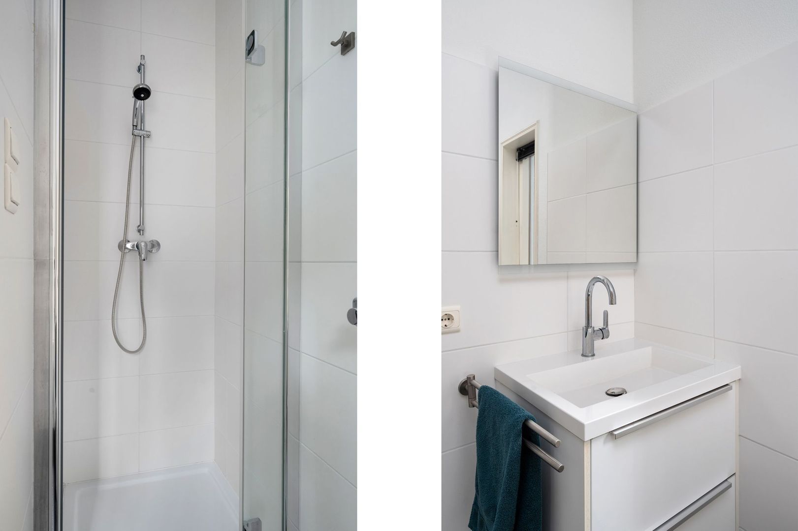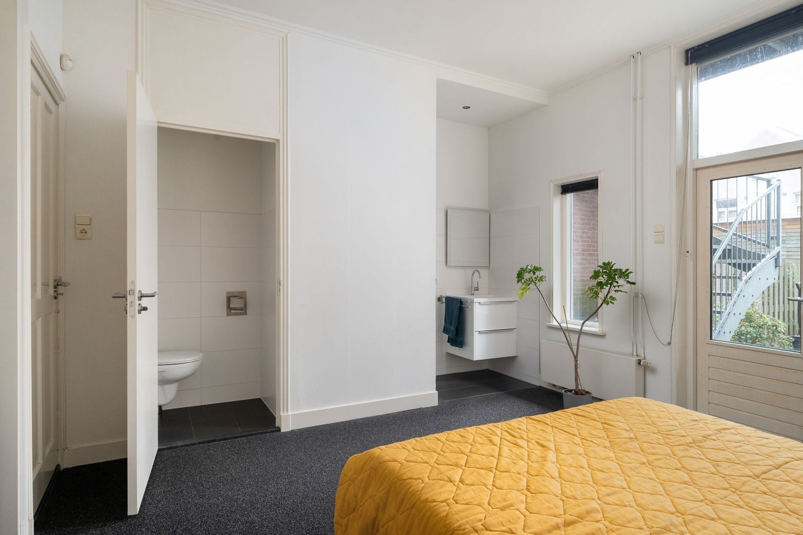 Toiletruimte, doucheruimte en wastafel. Deur naar: