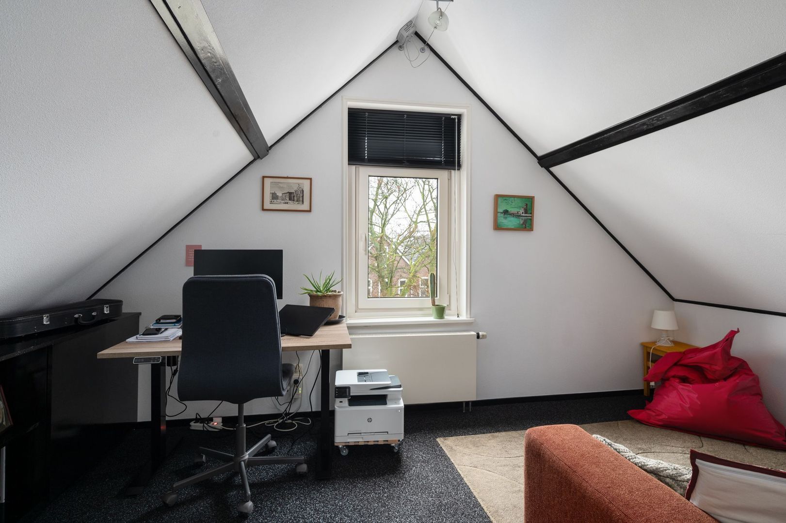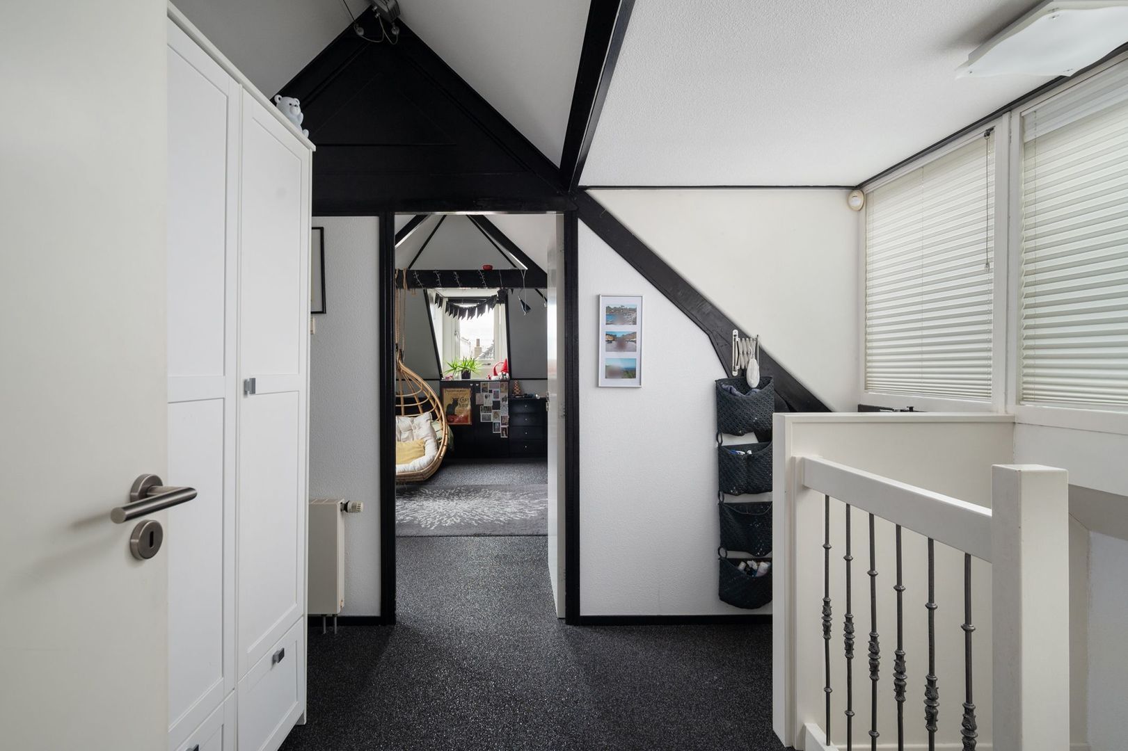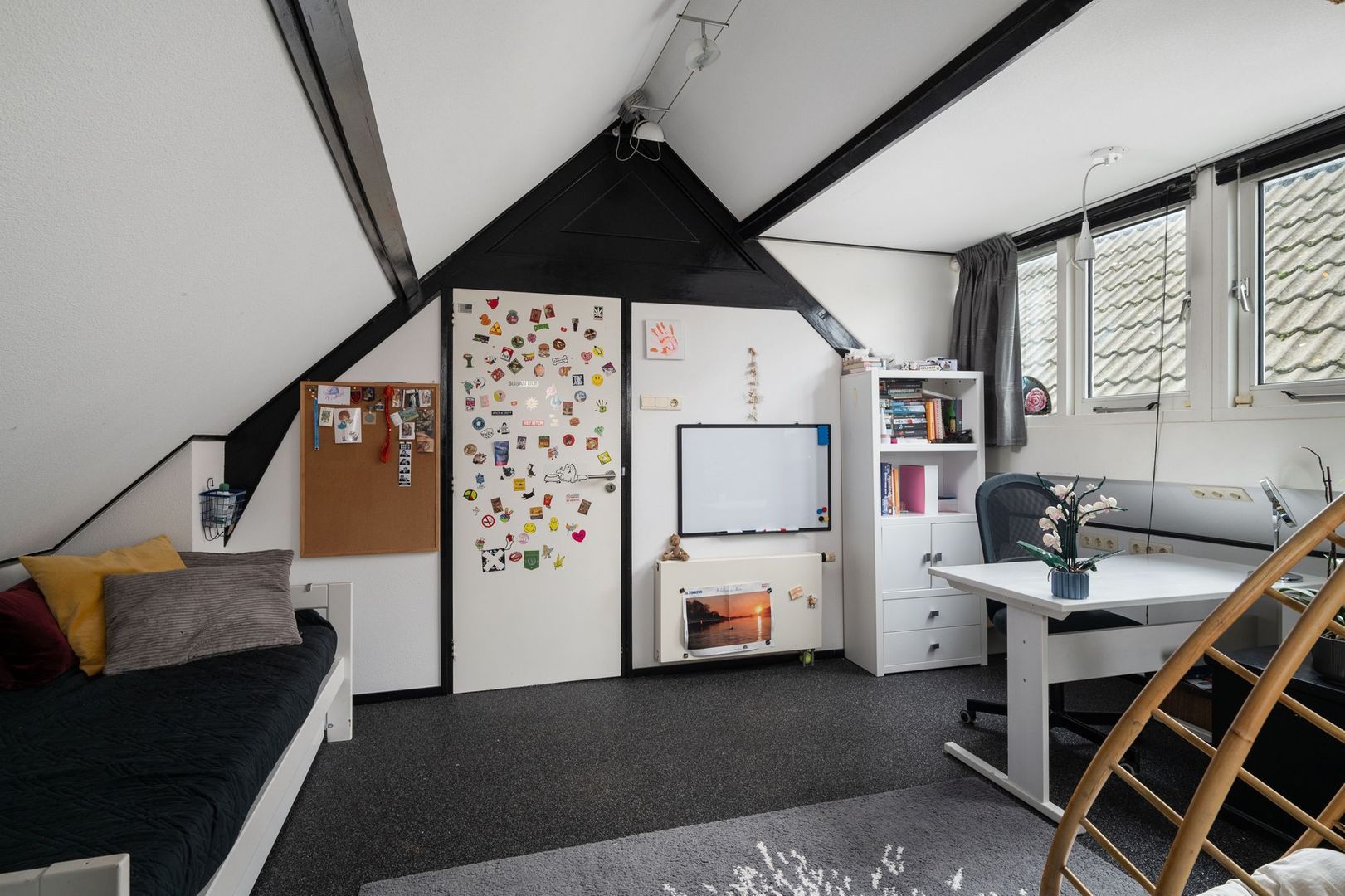 schuine dak, een dakkapel en een functionele ladenkast.