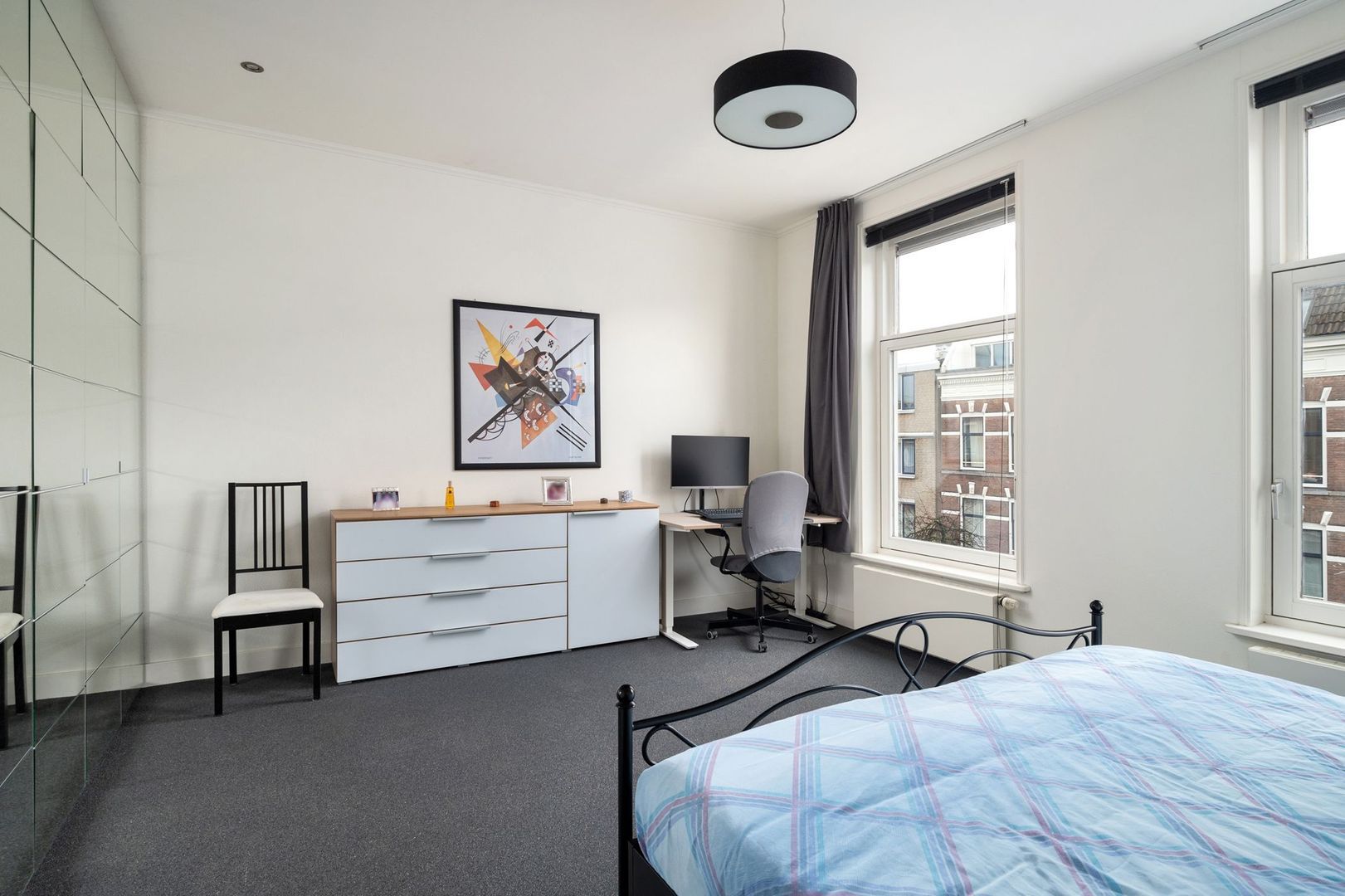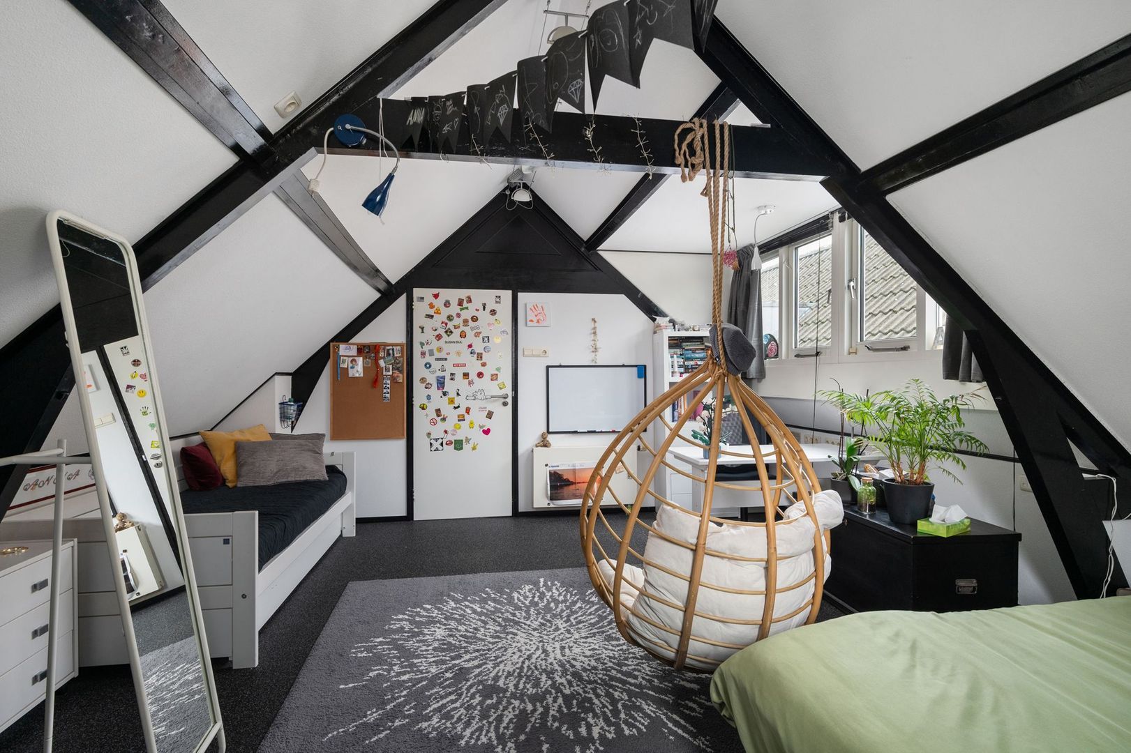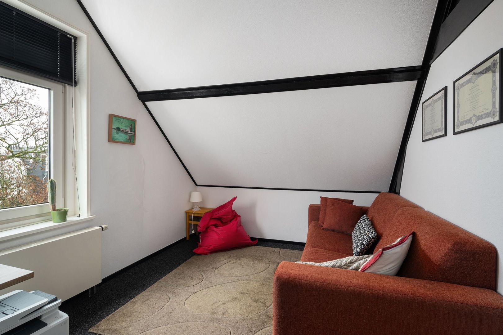 schuine dak, een dakkapel en een functionele ladenkast.