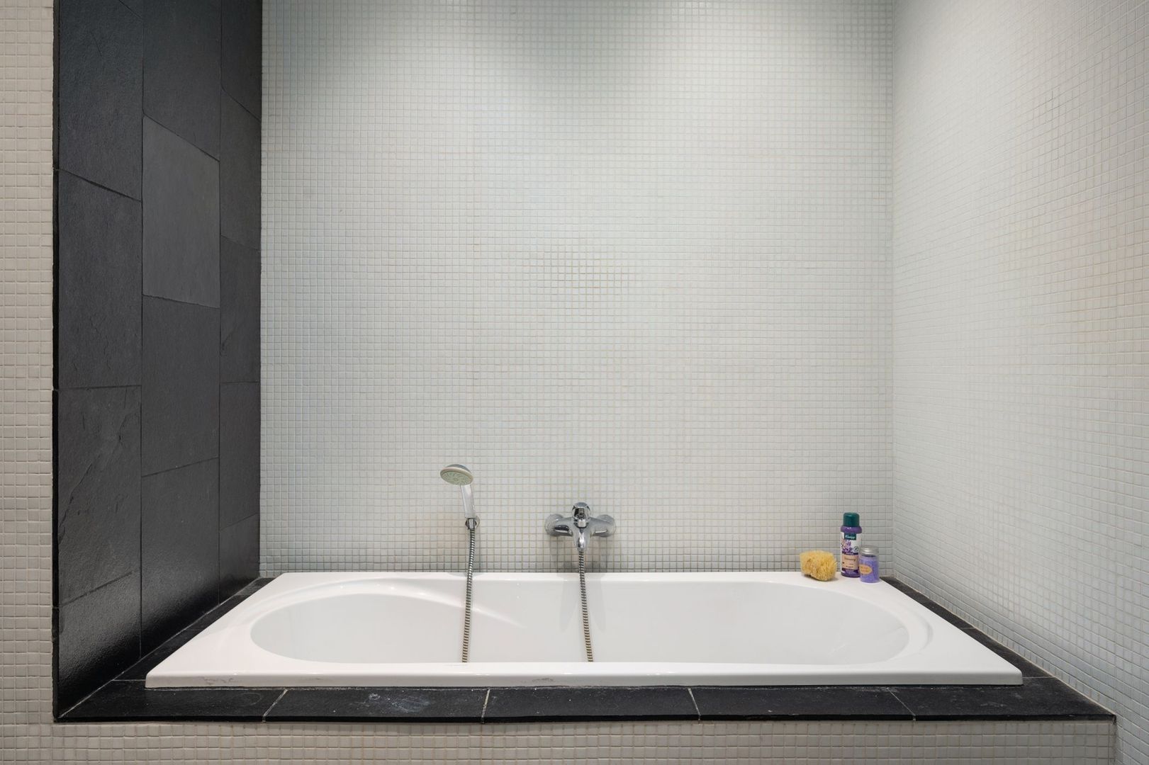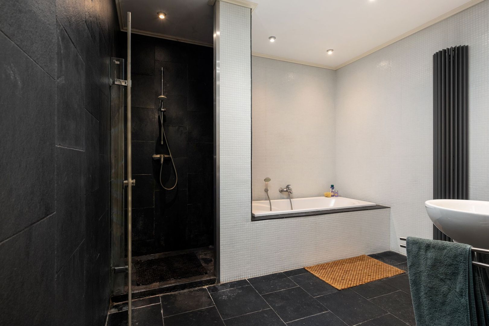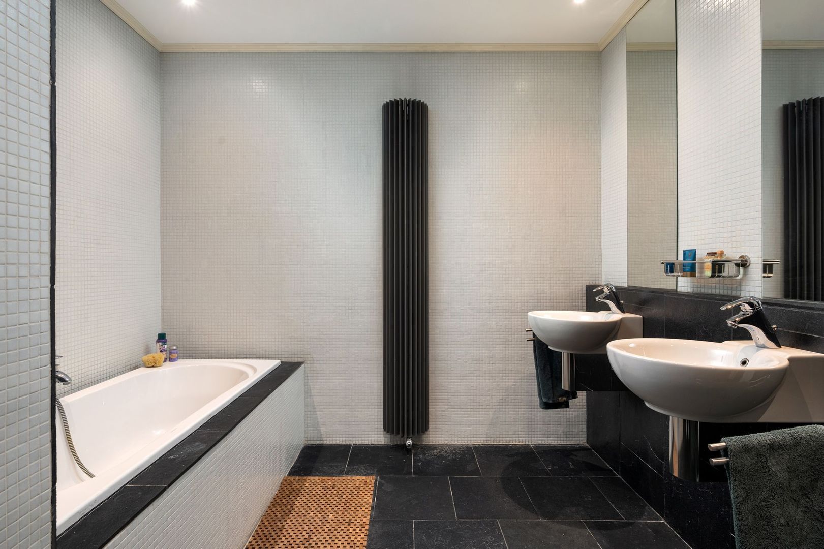 Tussengelegen badkamer ca. 9m² met ligbad, separate douche en 2 wastafels.
