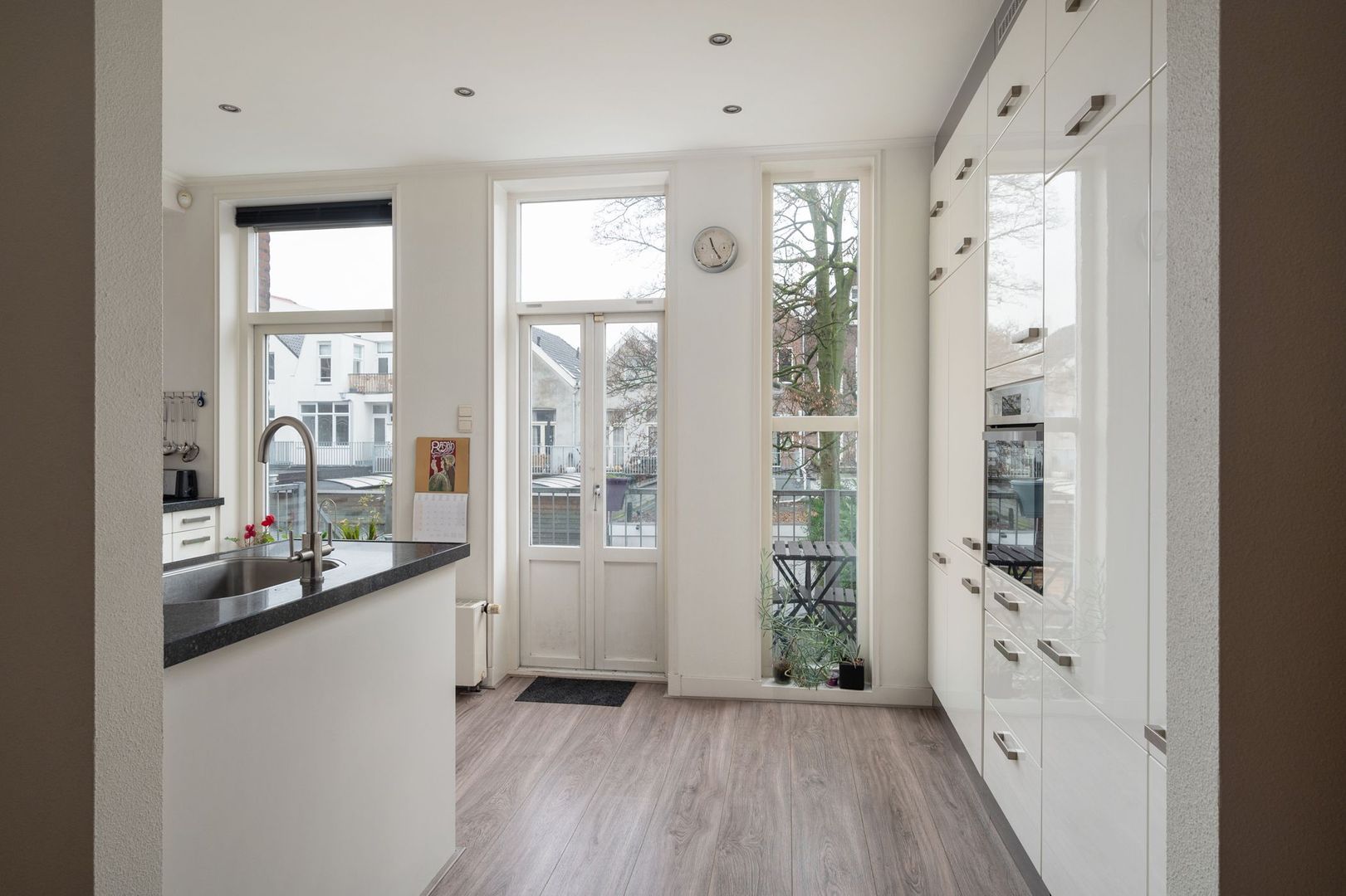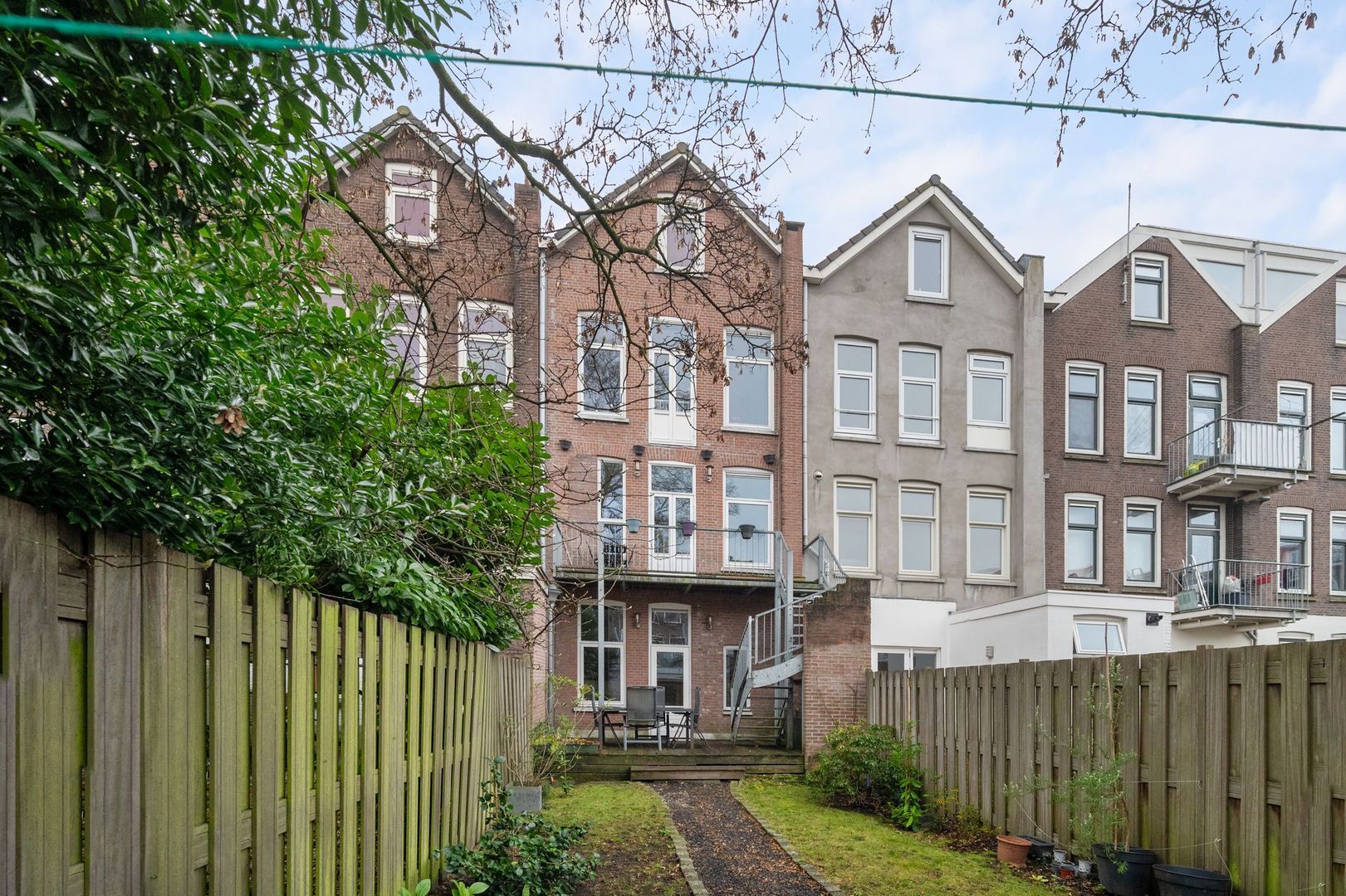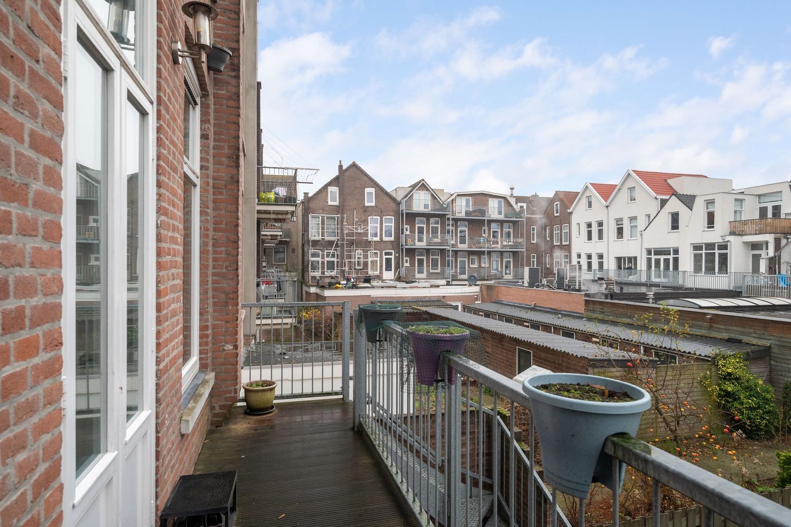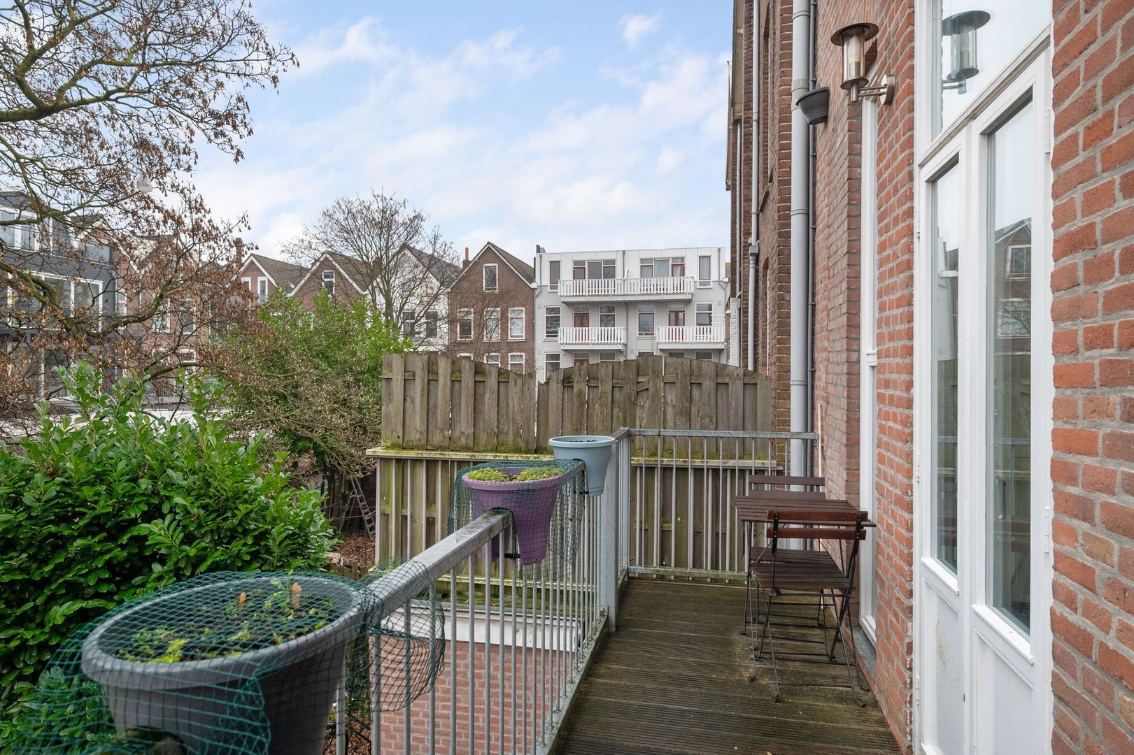 Er zijn openslaande deuren naar een tuingericht breed balkon met een stalen trap naar de ACHTERTUIN.