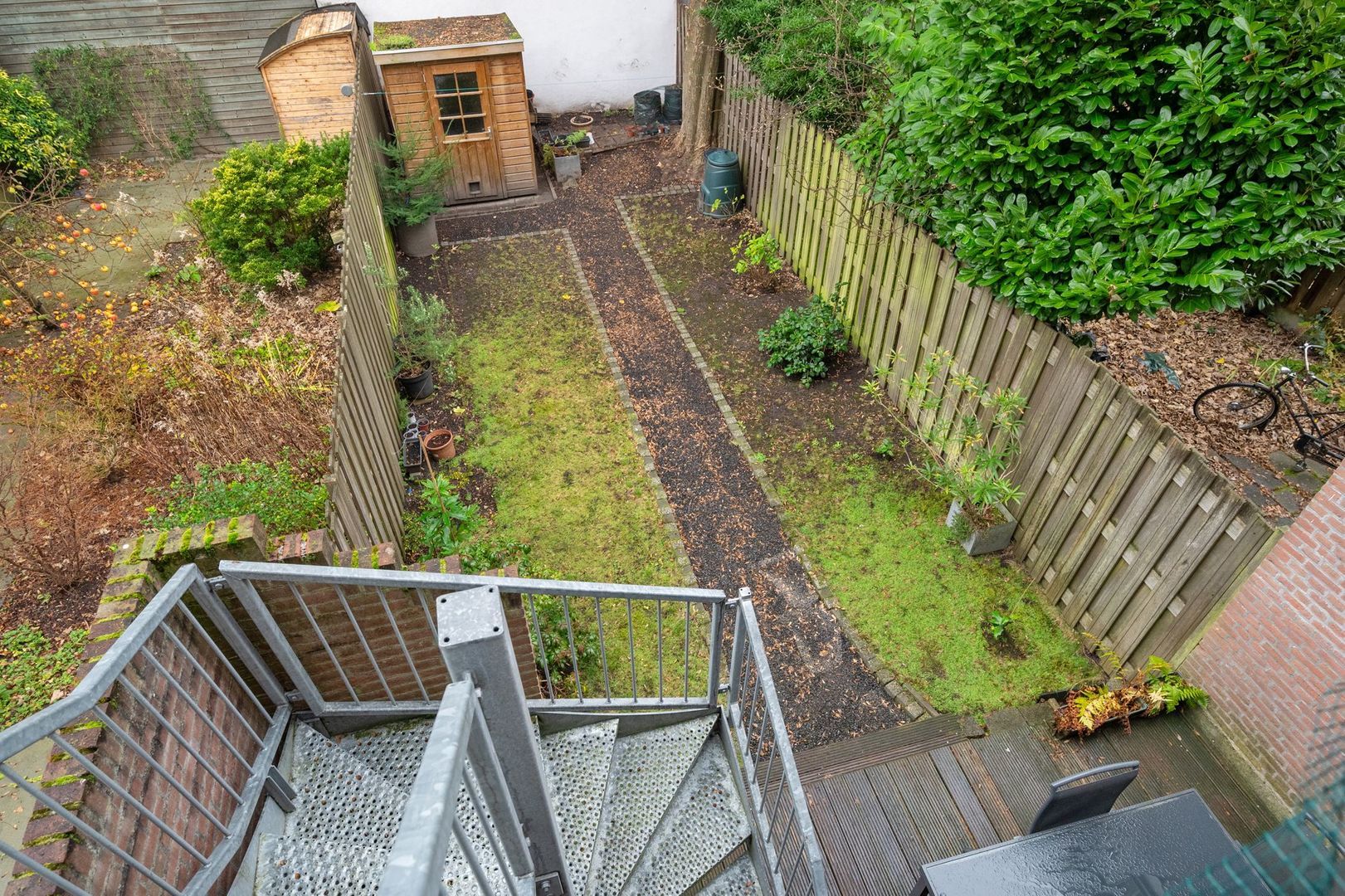 TERRAS en zeer diepe (16m) TUIN met houten tuinhuis.