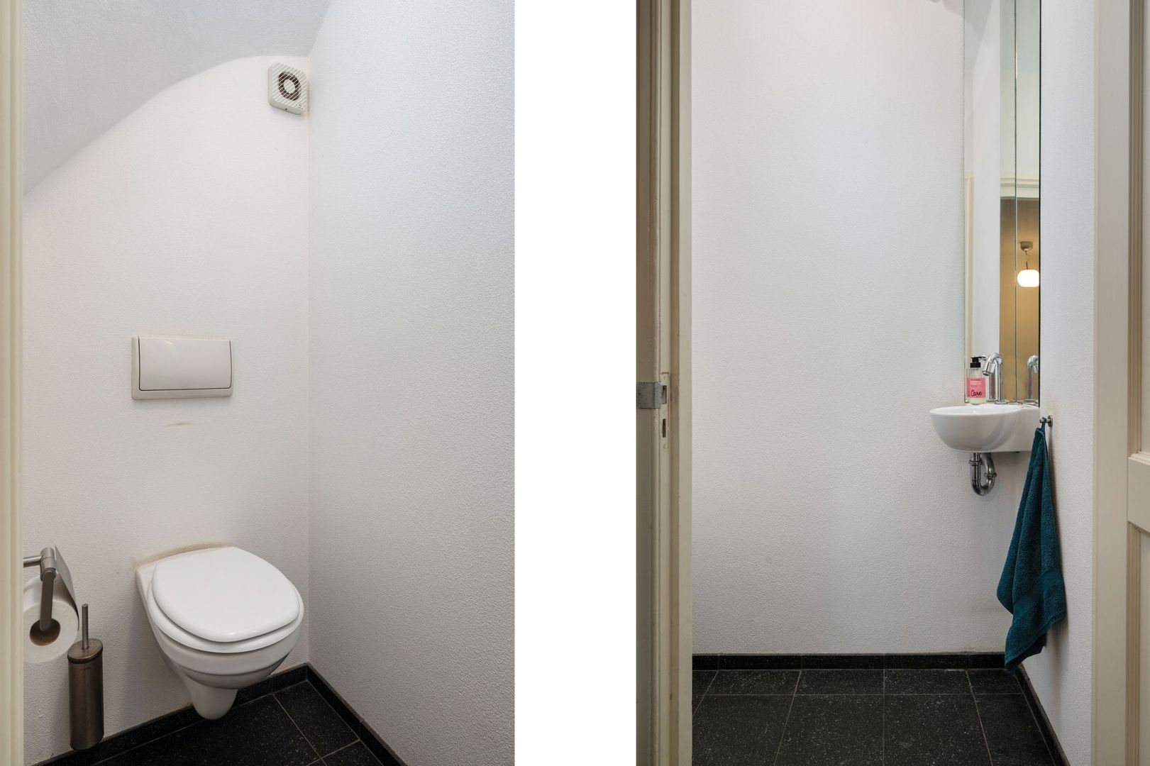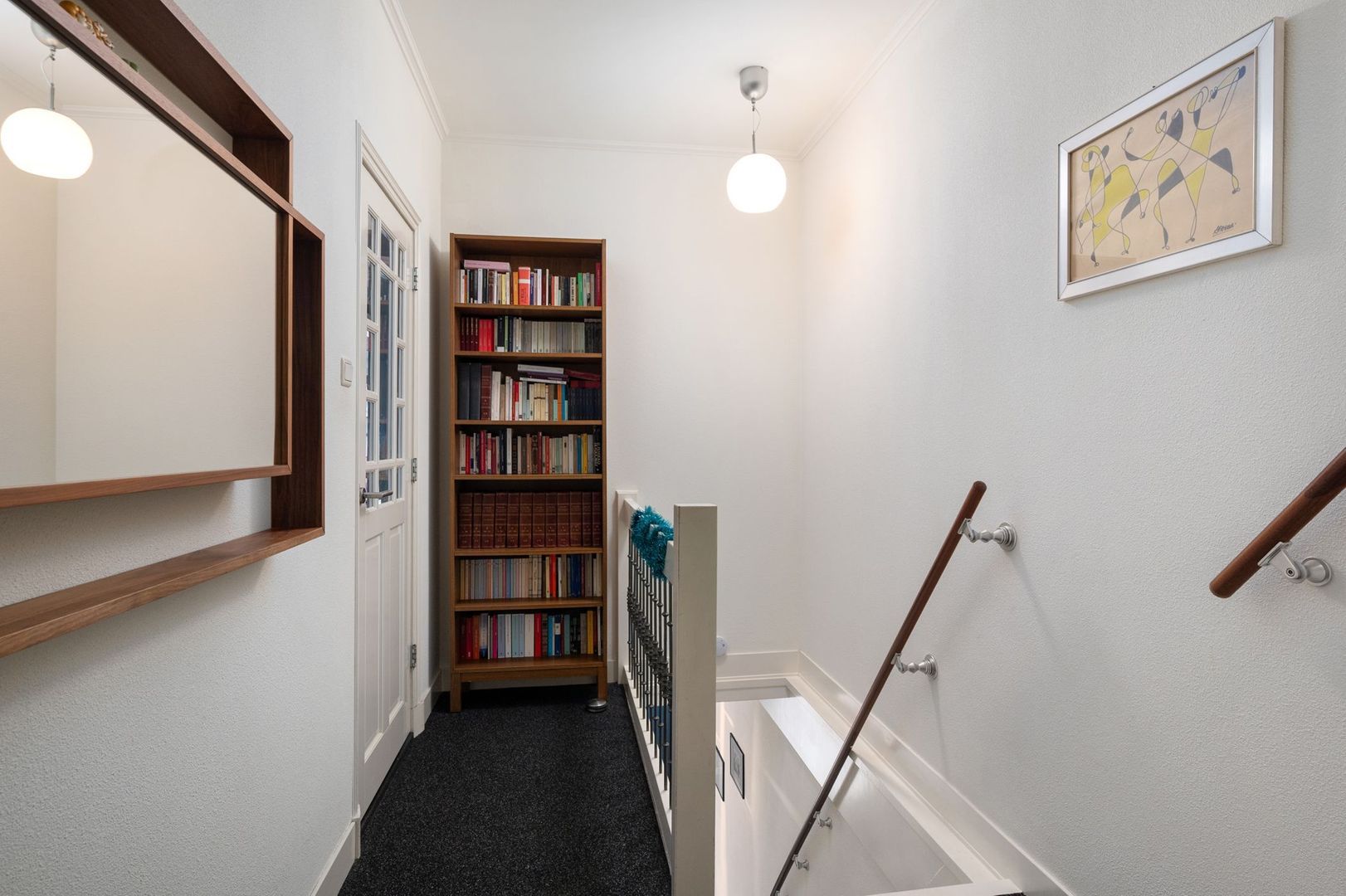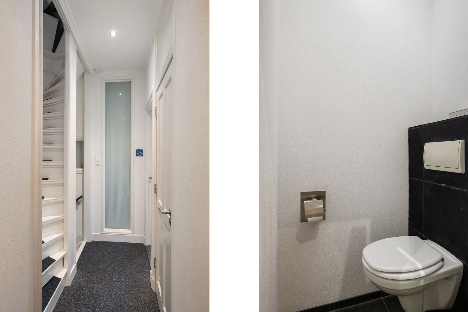 Overloop met grote kast en toiletruimte met hangende wc.