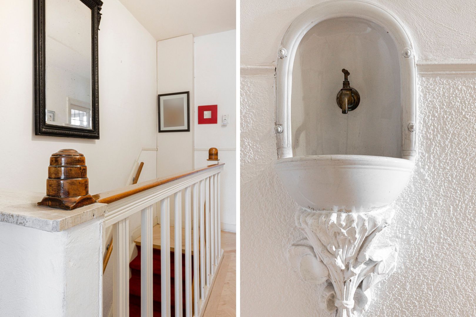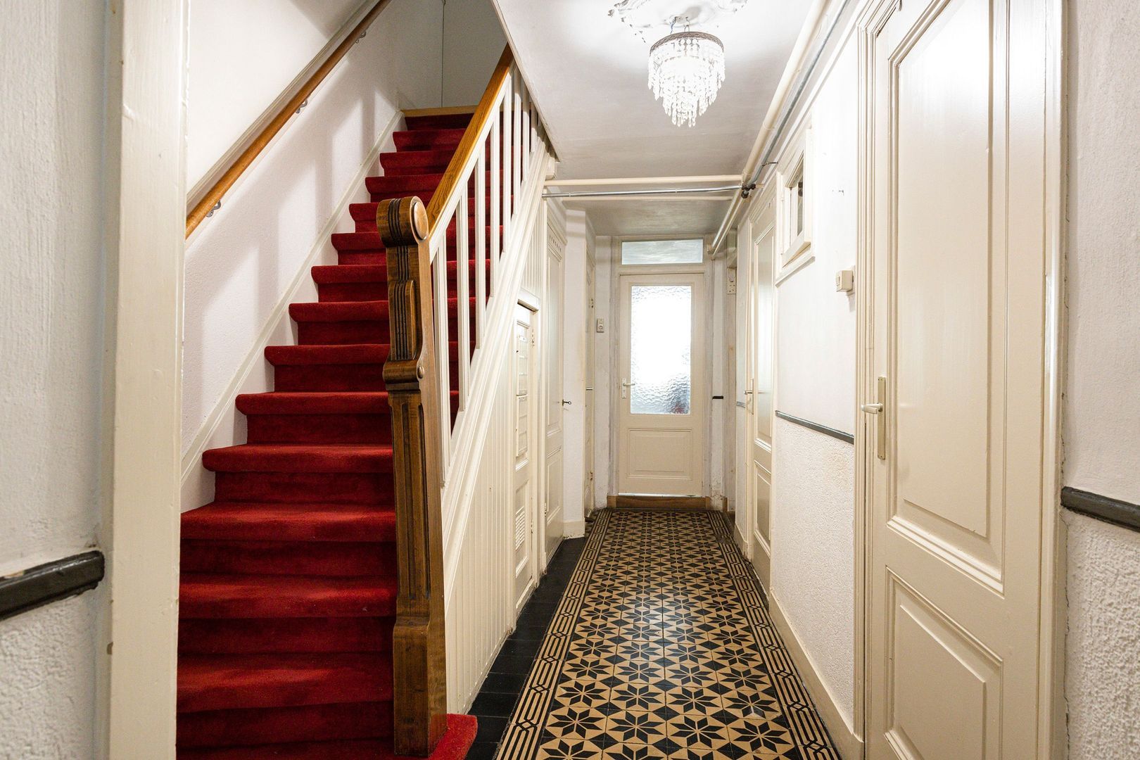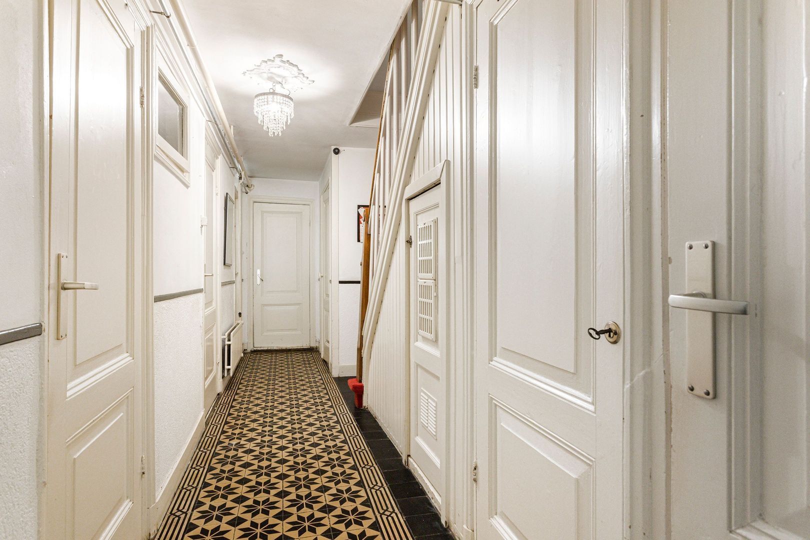 Brede gang met oorspronkelijke tegelvloer, wasruimte en kleine ‘extra’ toiletruimte.