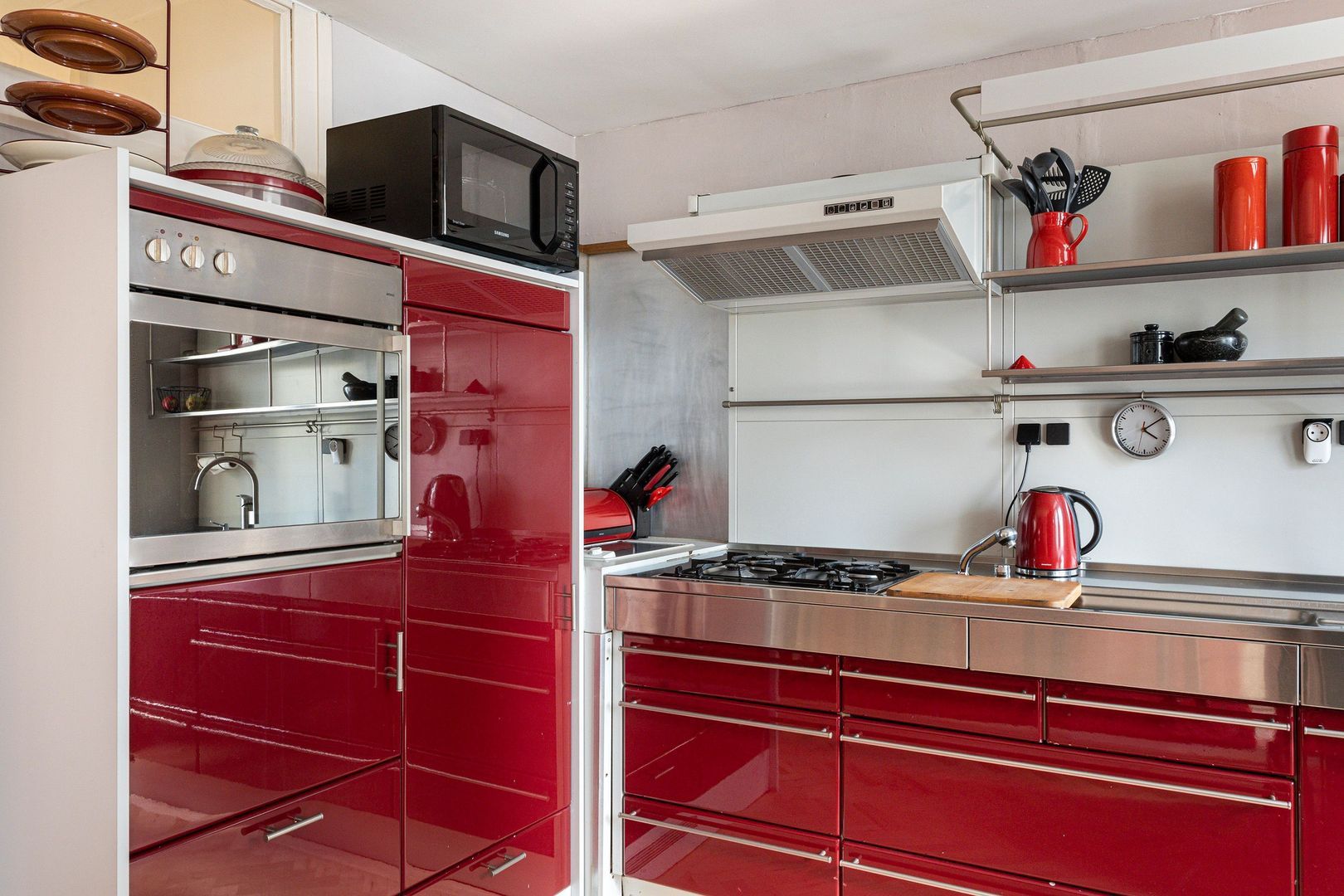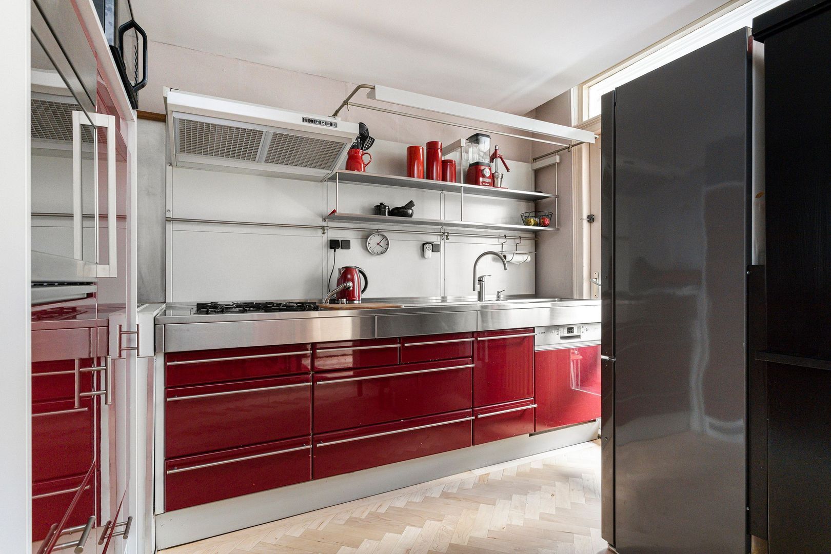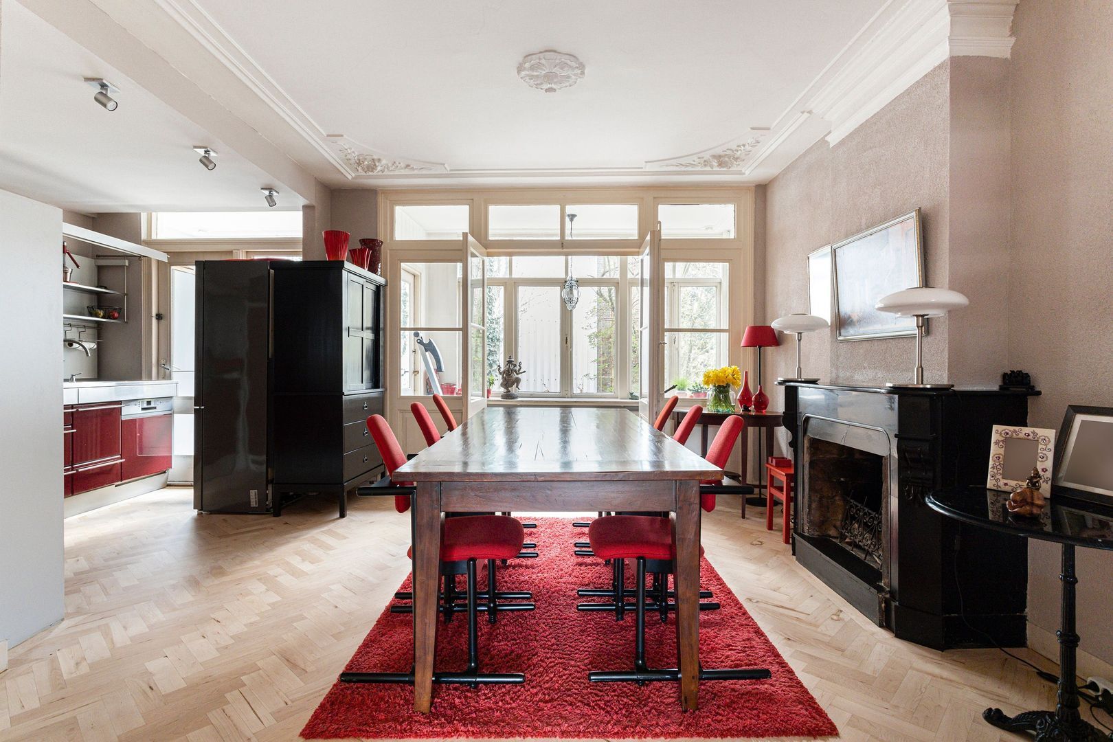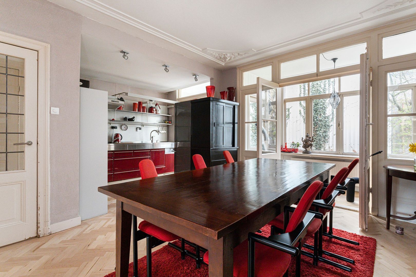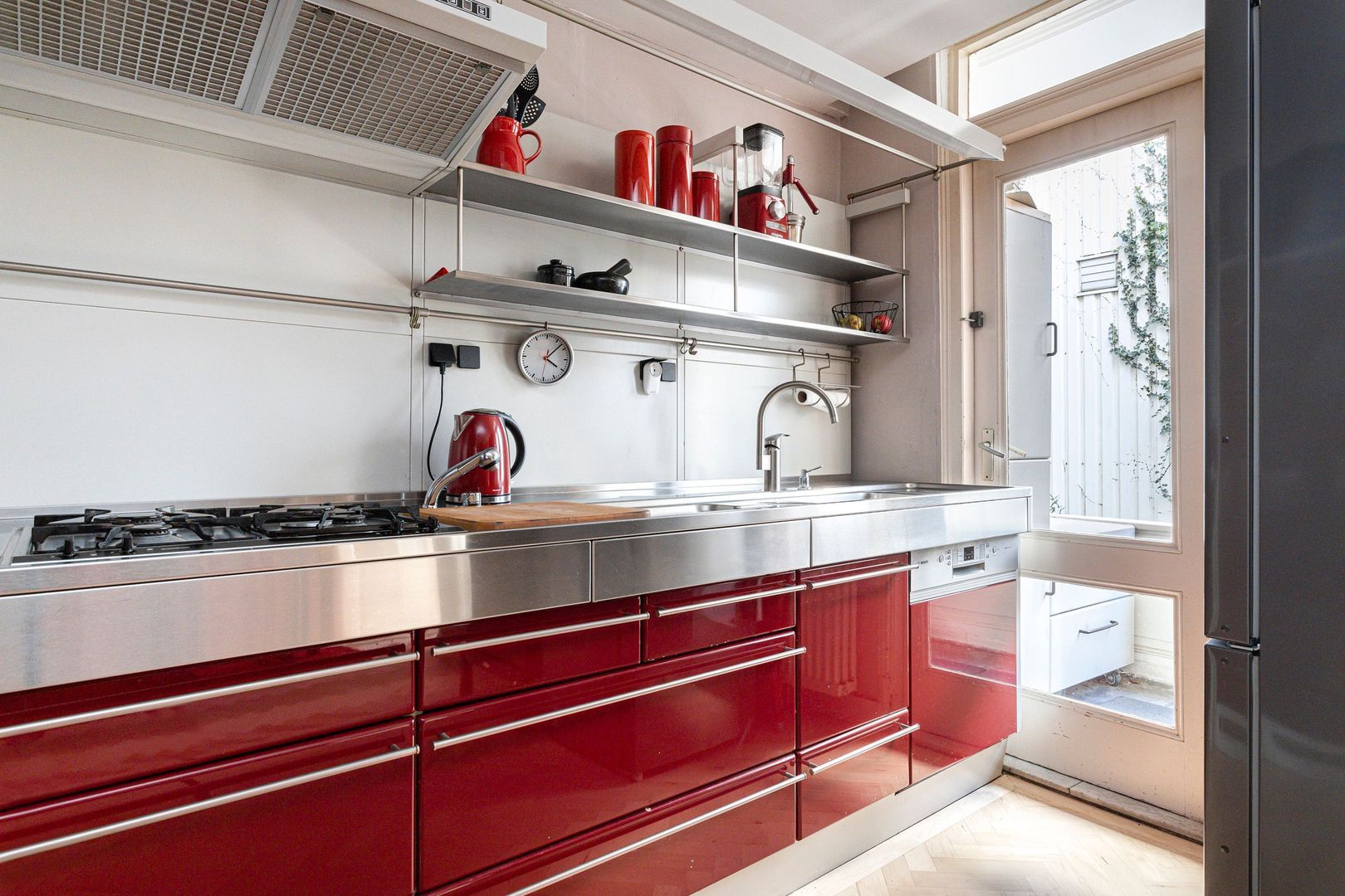 Open keukenruimte met warmrode Bulthaup opstelling, voorzien van diverse Inbouwapparatuur en een naar de veranda/serre.