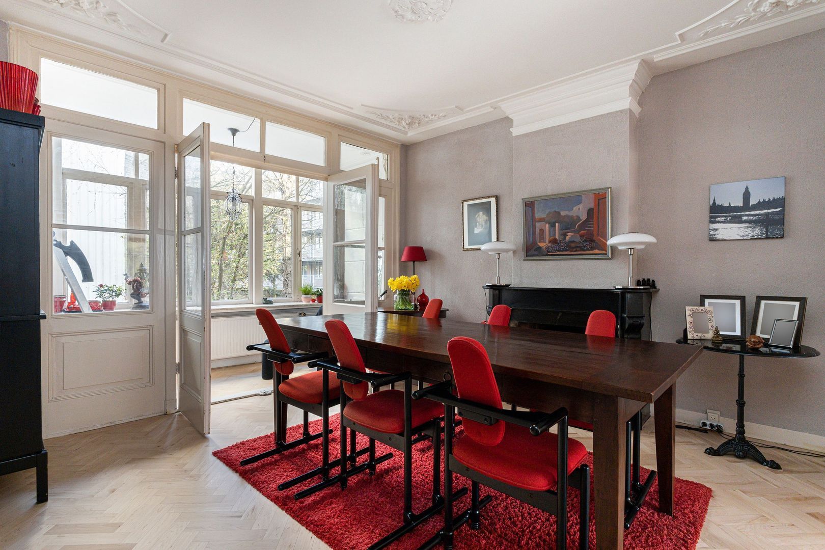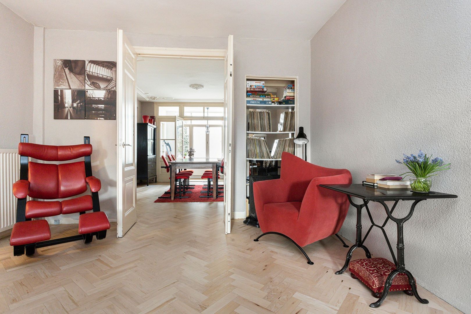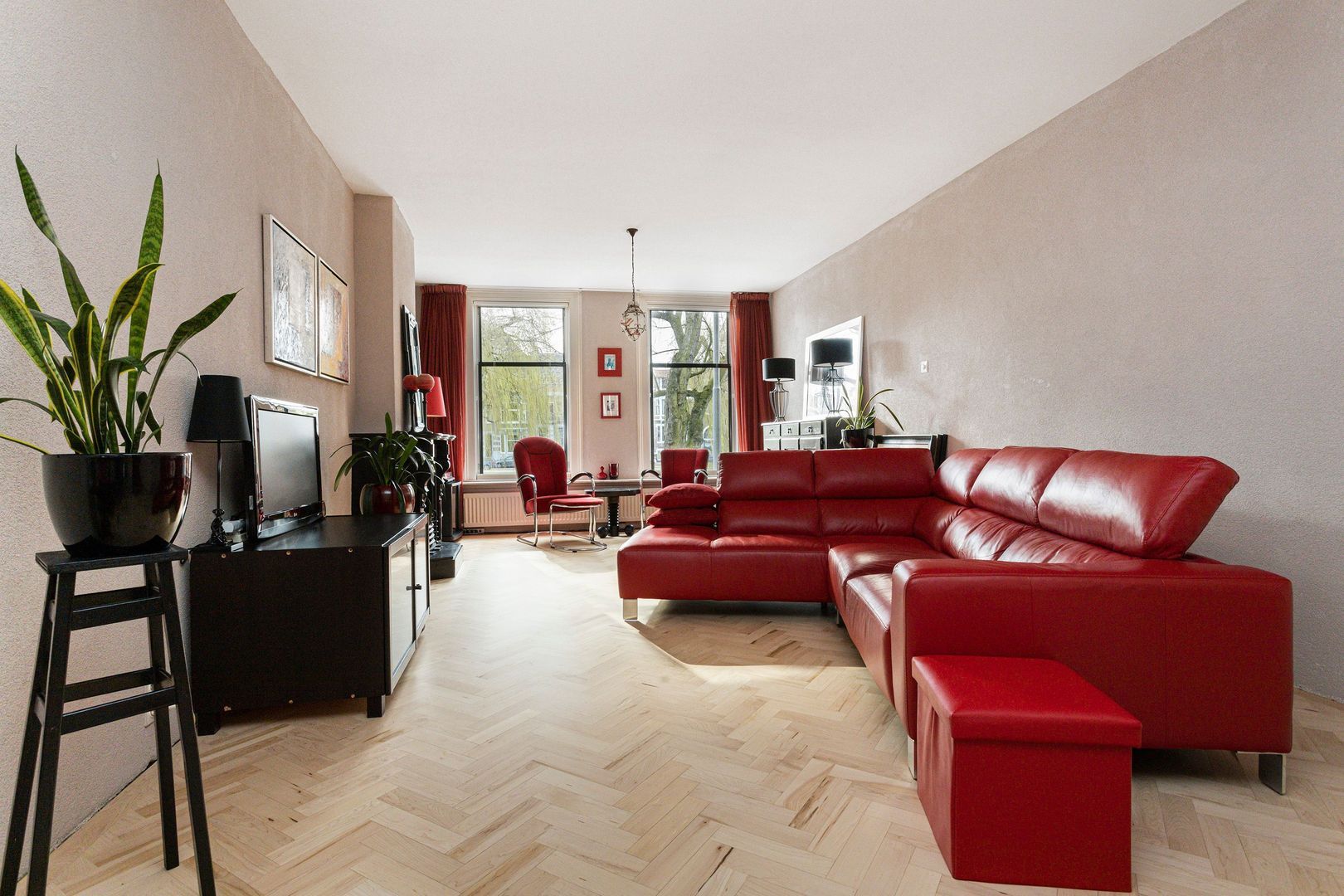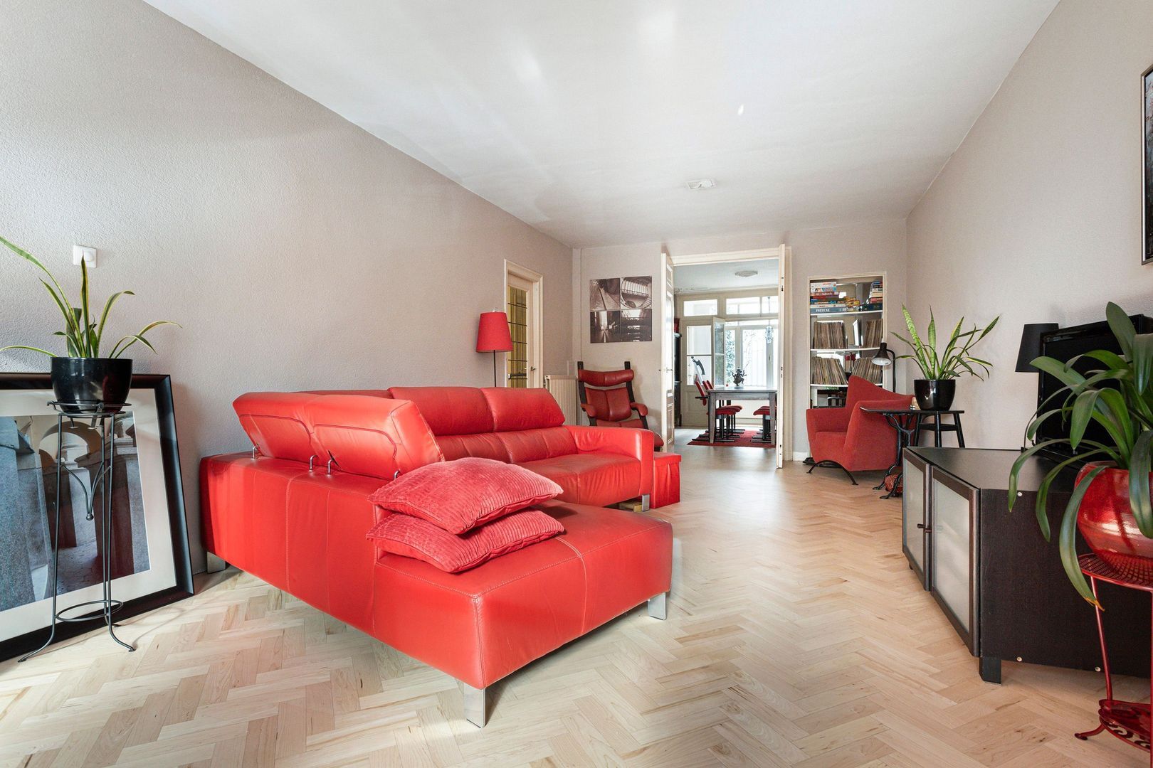 Diepe (15m) kamer ensuite (1 en 2) ca. 60m², bestaande uit een voorkamer (1) ca. 35 m2 en een, via kasten/deuren combinatie bereikbare, tuinkamer (2) ca. 23 m2 met dubbele deuren naar de huisbrede serre/veranda.