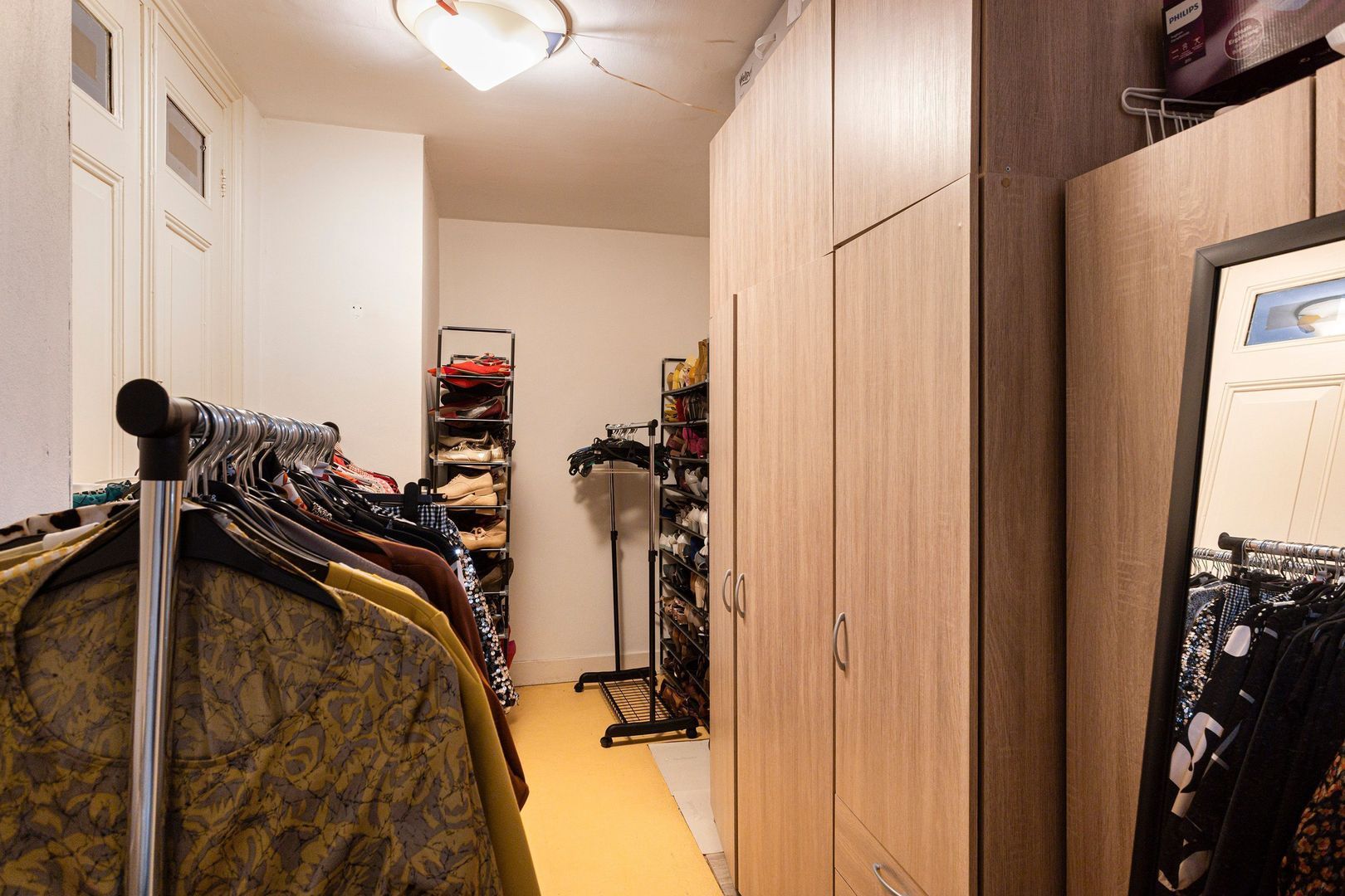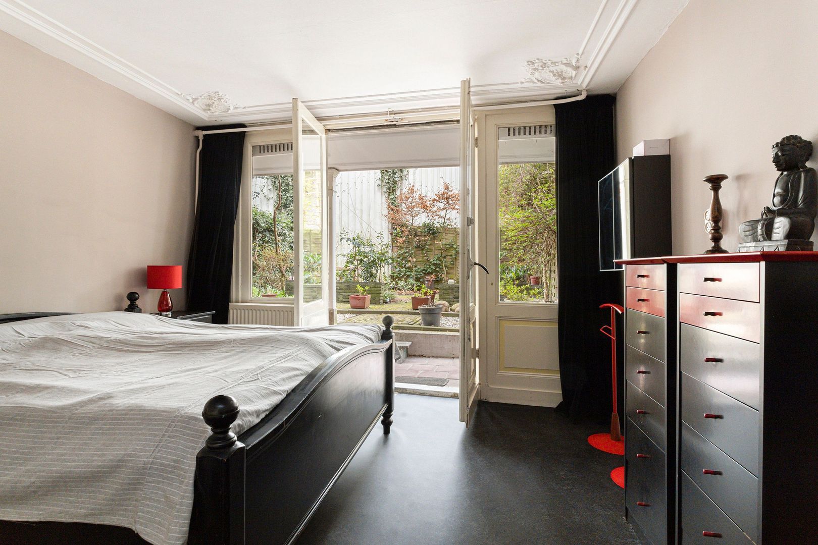 Slaapkamer (3) ca. 16,5 m2 aan de tuinzijde met openslaande deuren (heerlijk beschut en droog onder de veranda) naar de tuin en een royale inloopgarderobe.