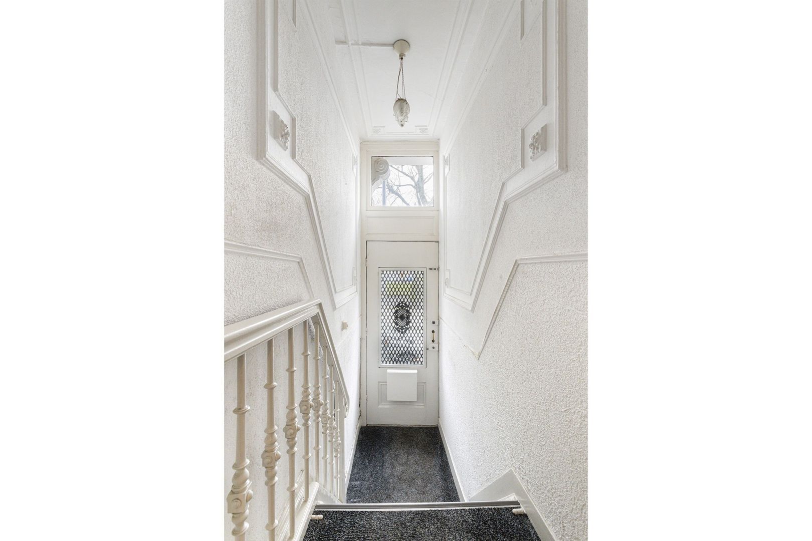 Entree, tochtportaal, trapje naar brede authentieke gang met garderobenis en toiletruimte.