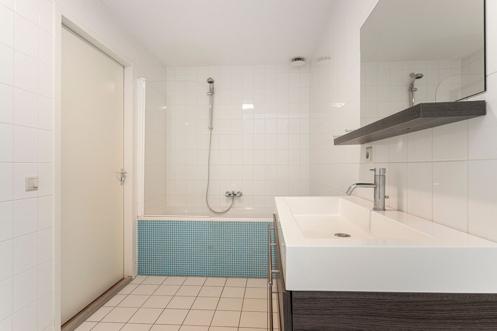 Badkamer met bad/douchecombinatie en meubel met wastafel.