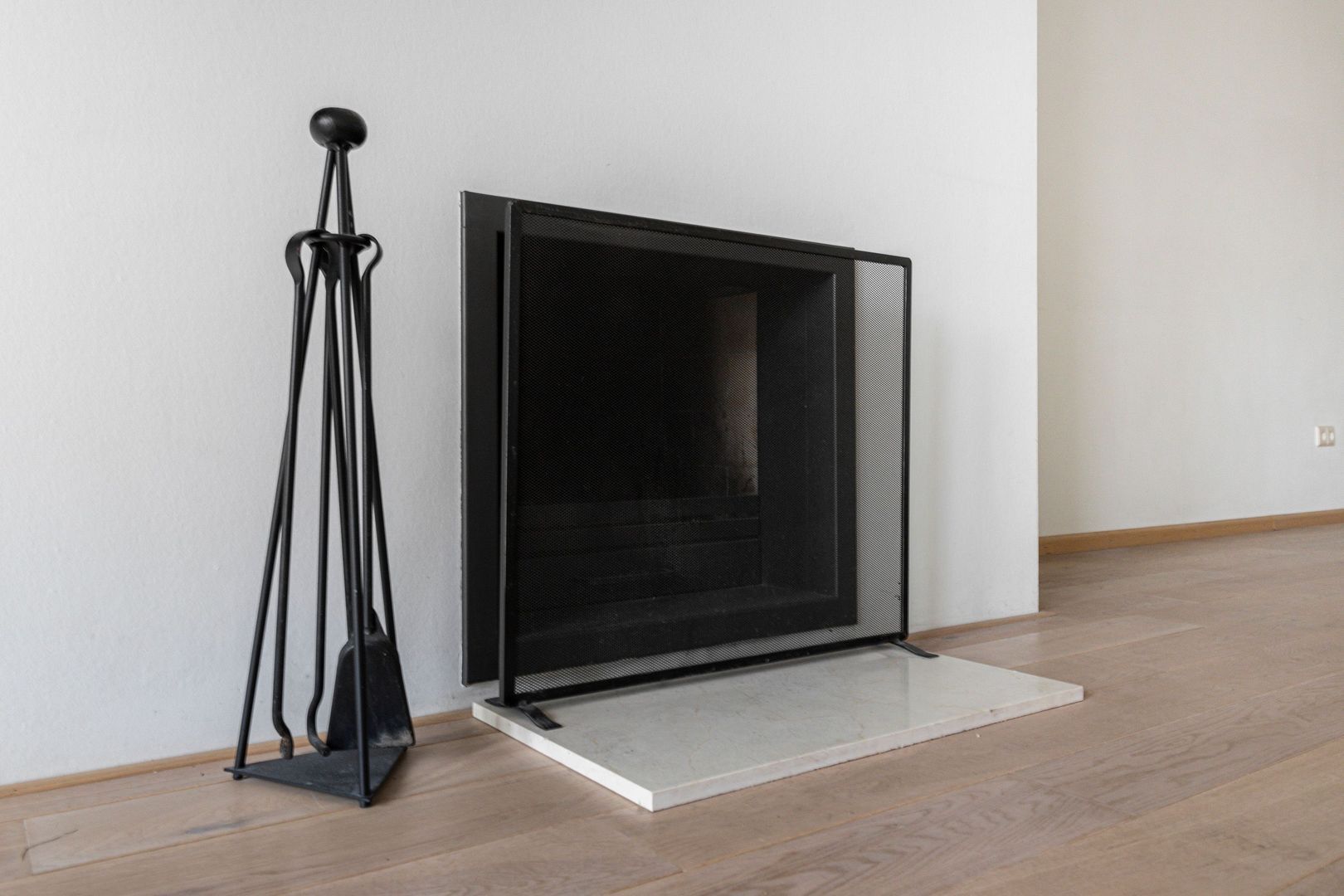 Lichte en hoge woonkamer (1) ca. 53 m2 met grootse raampartijen, open haard en een serre die met schuifdeuren kan worden afgesloten van de woonkamer.