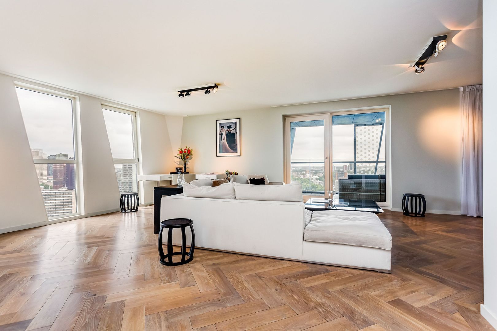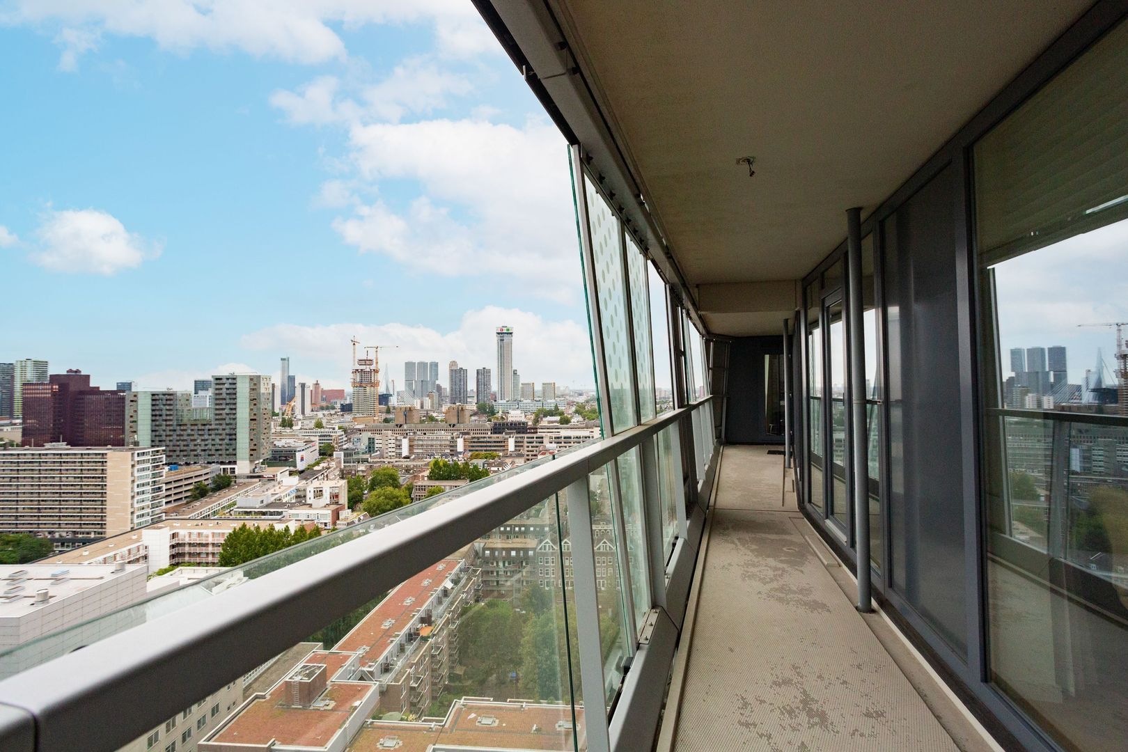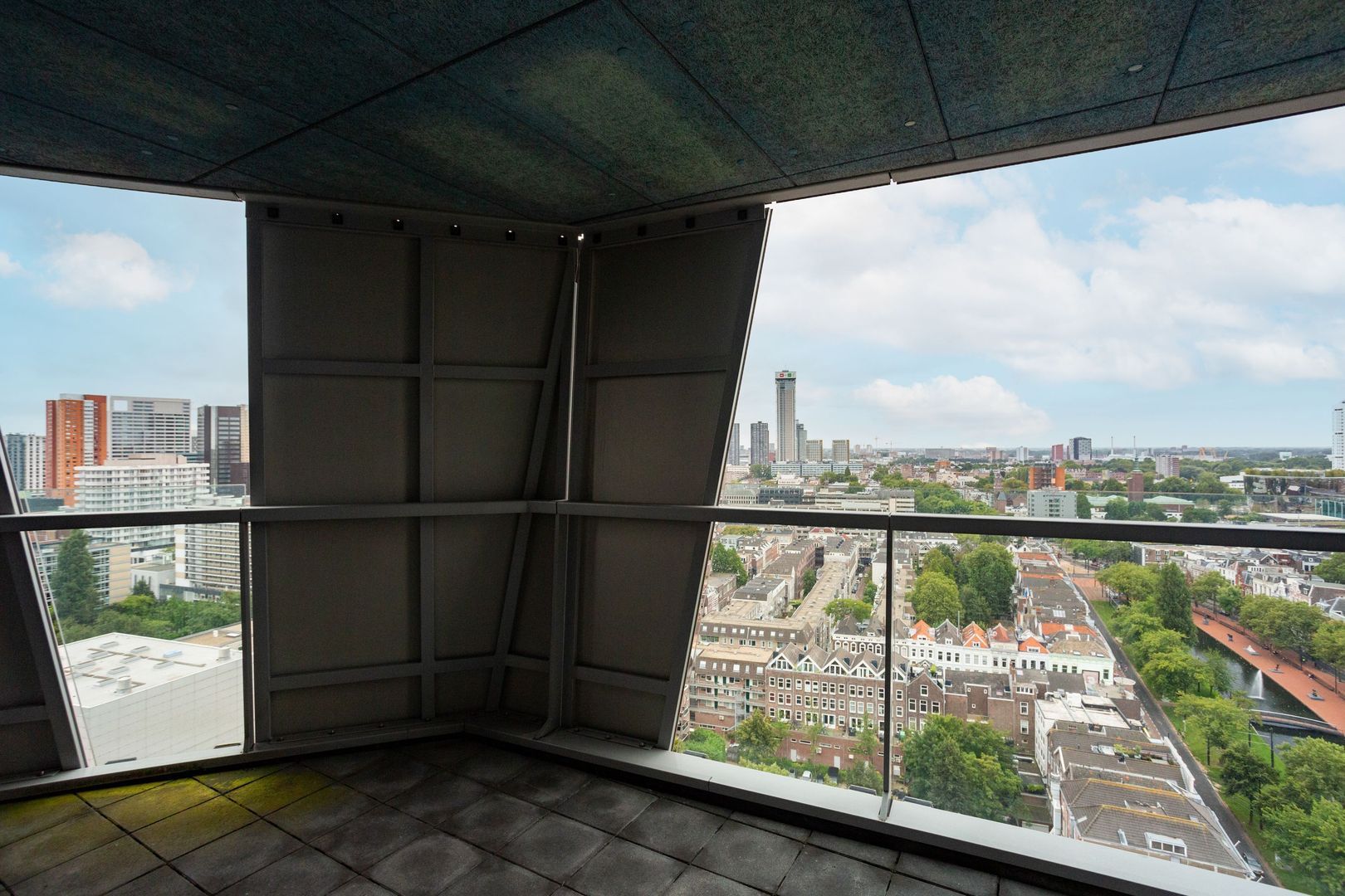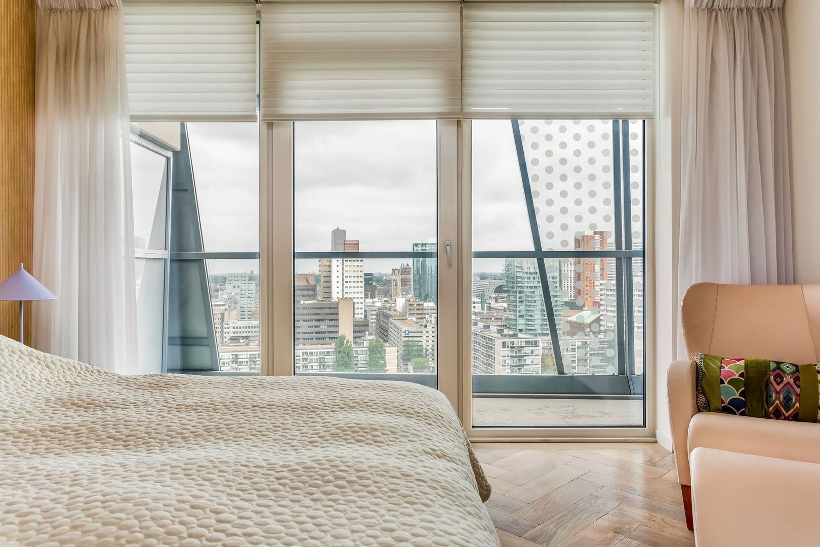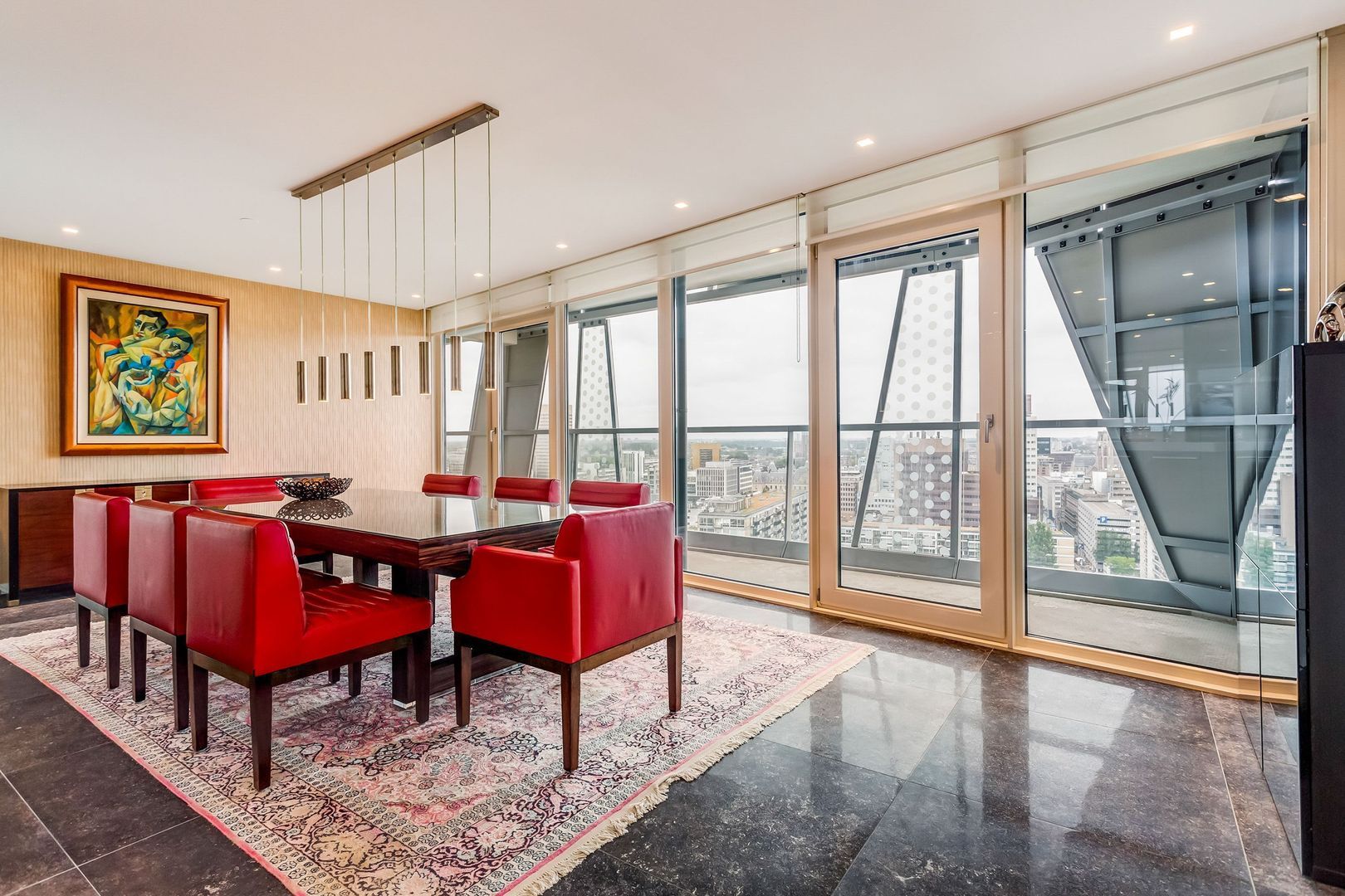 In het hart van het Central District (www.rotterdam-centraldistrict.nl) en op de 20e verdieping van De Calypso gelegen, bijzonder groot (ca. 200m2) en uitermate comfortabel 3/4 - KAMER APPARTEMENT met 2 grote TERRASEN (ca. 35m2!) en een eigen PARKEERPLAATS in de parkeergarage.
