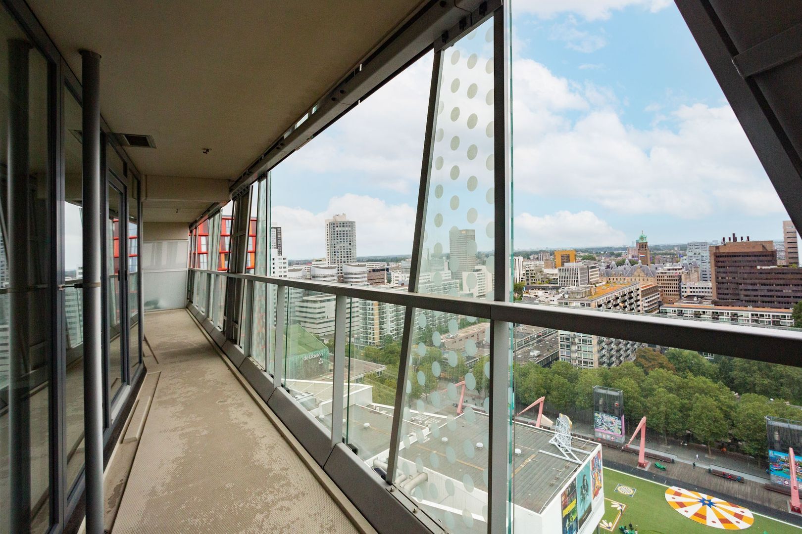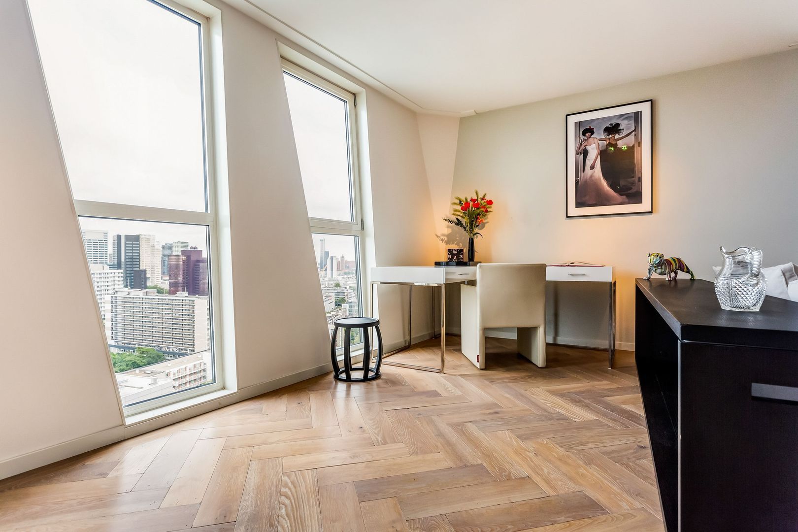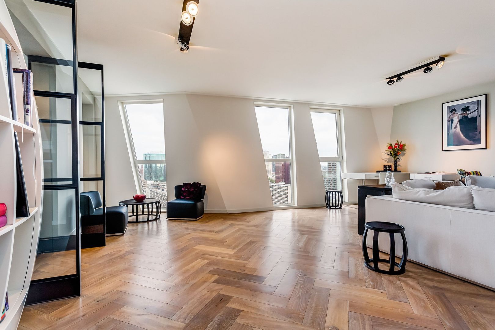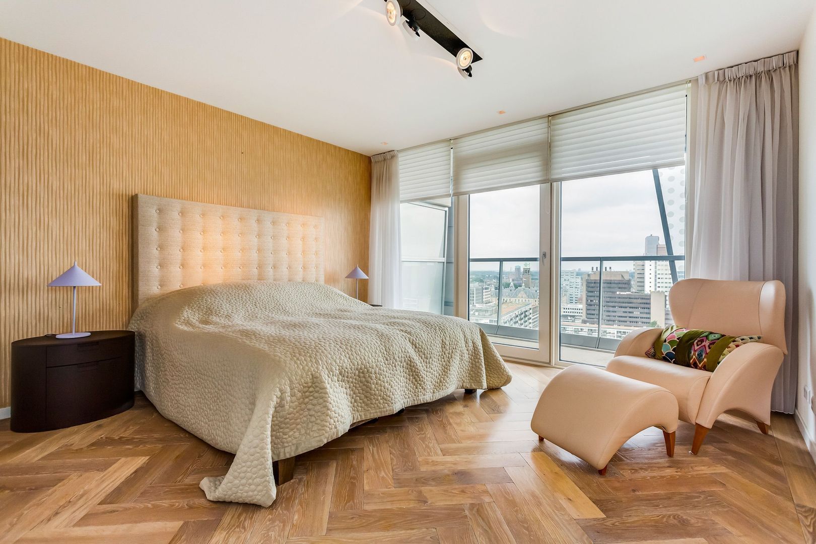In het hart van het Central District (www.rotterdam-centraldistrict.nl) en op de 20e verdieping van De Calypso gelegen, bijzonder groot (ca. 200m2) en uitermate comfortabel 3/4 - KAMER APPARTEMENT met 2 grote TERRASEN (ca. 35m2!) en een eigen PARKEERPLAATS in de parkeergarage.