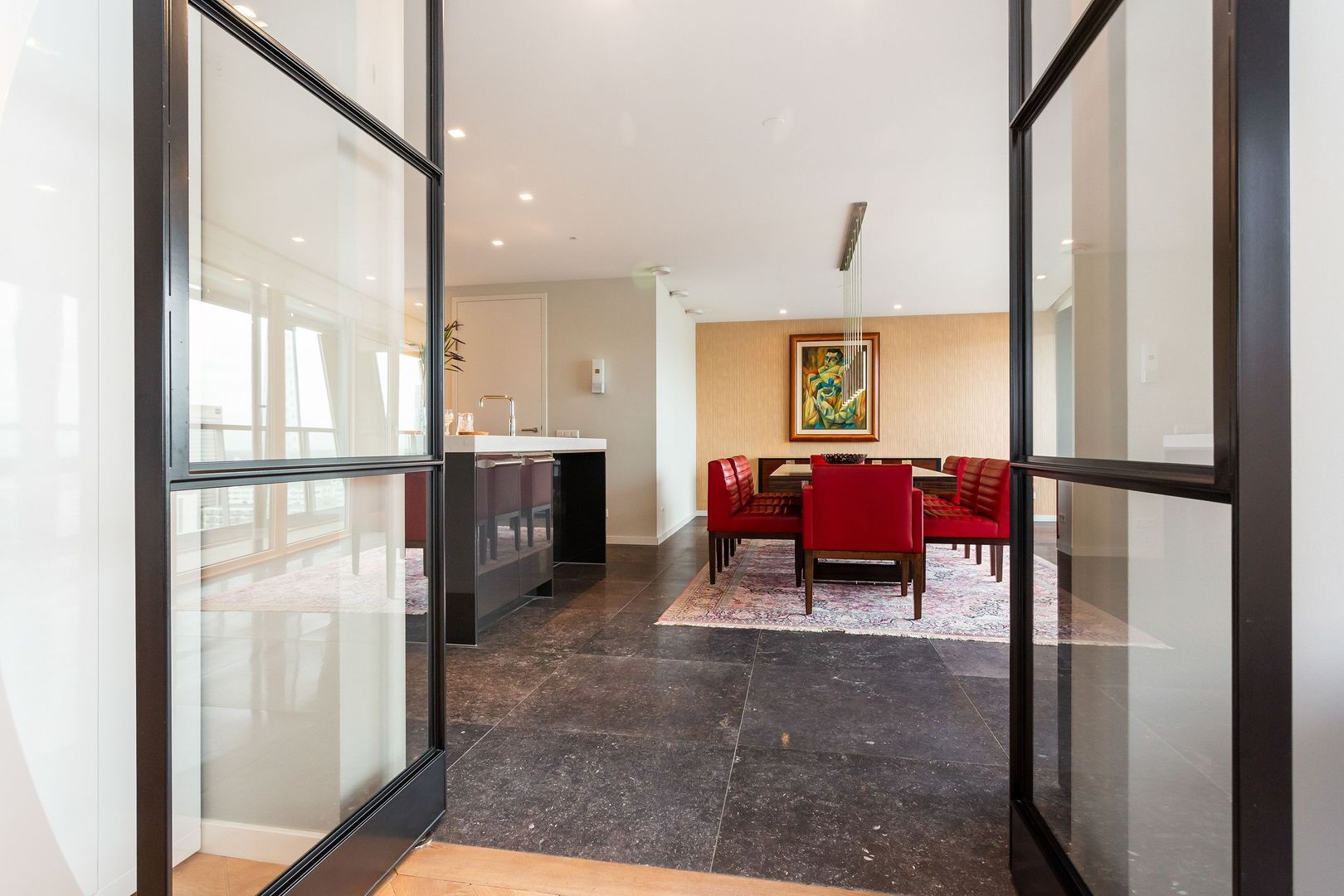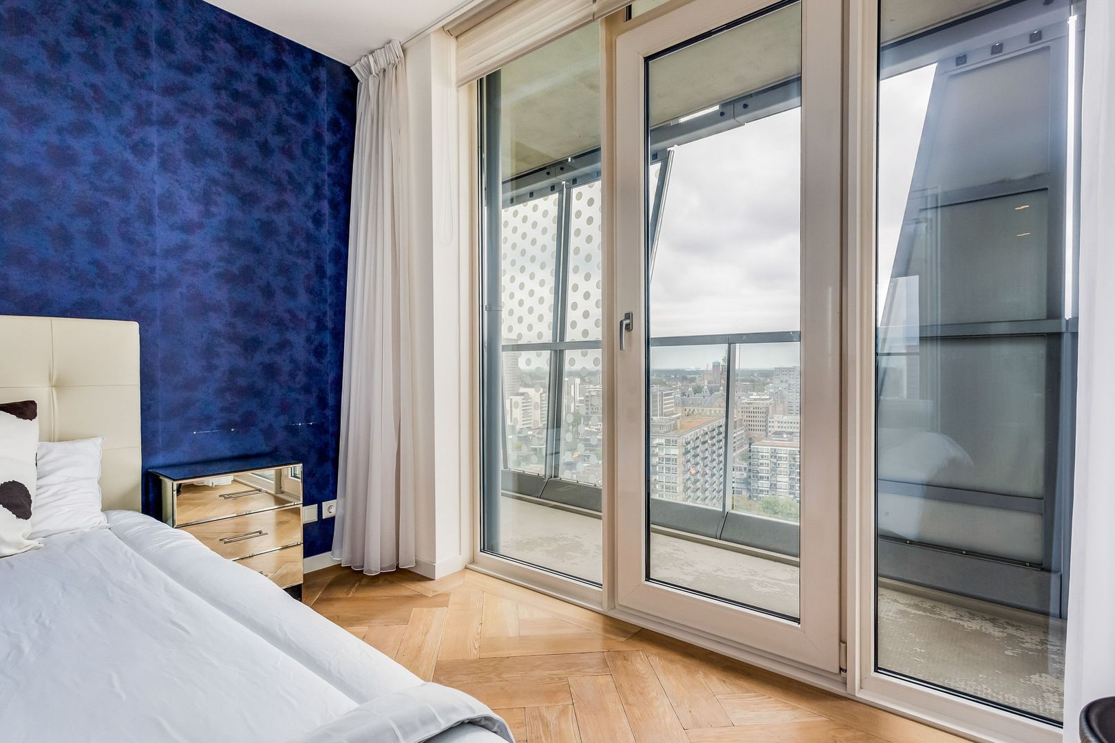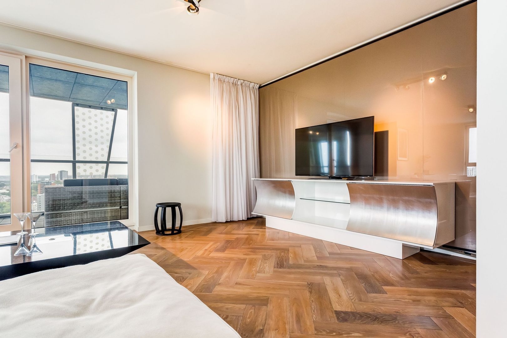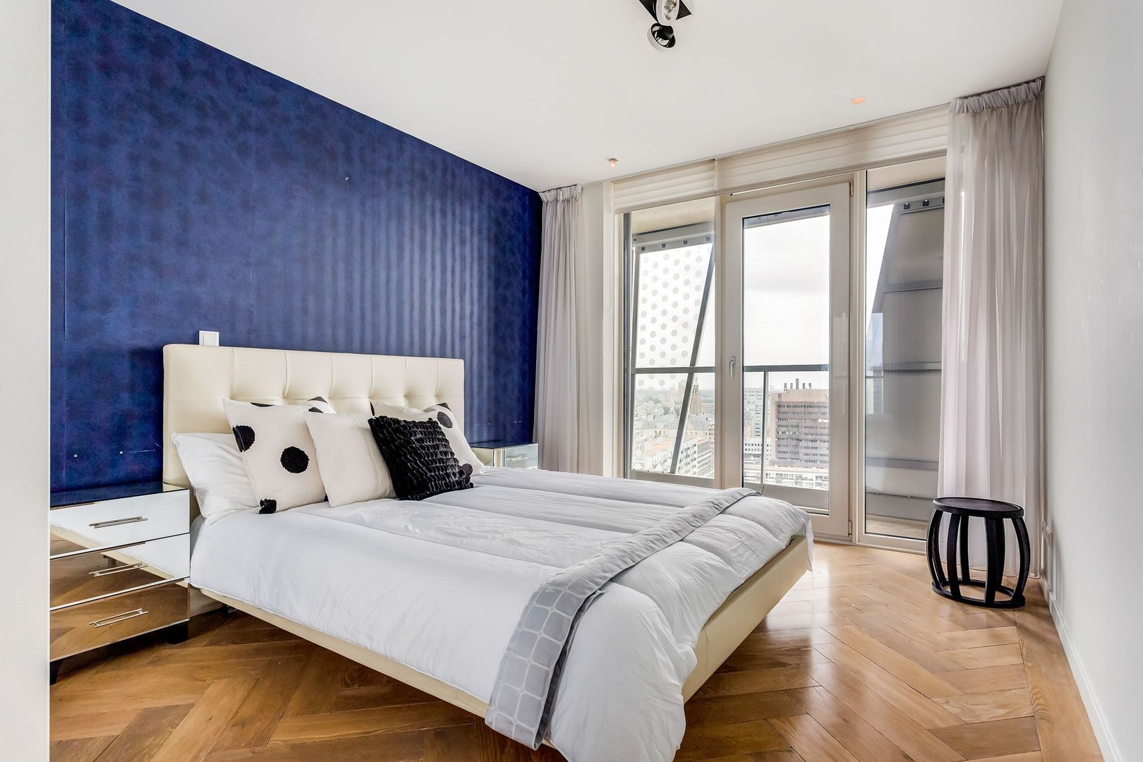 In het hart van het Central District (www.rotterdam-centraldistrict.nl) en op de 20e verdieping van De Calypso gelegen, bijzonder groot (ca. 200m2) en uitermate comfortabel 3/4 - KAMER APPARTEMENT met 2 grote TERRASEN (ca. 35m2!) en een eigen PARKEERPLAATS in de parkeergarage.