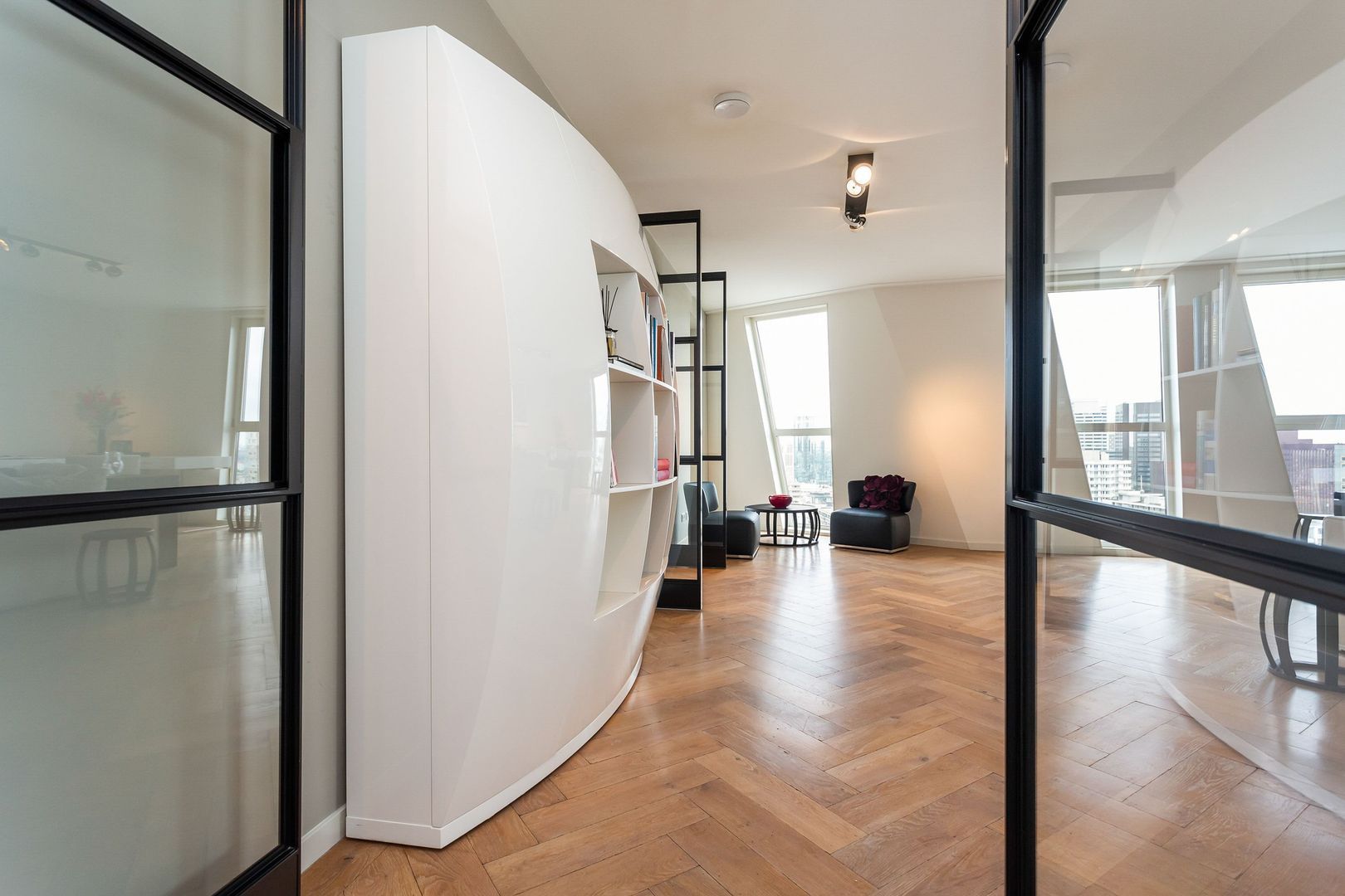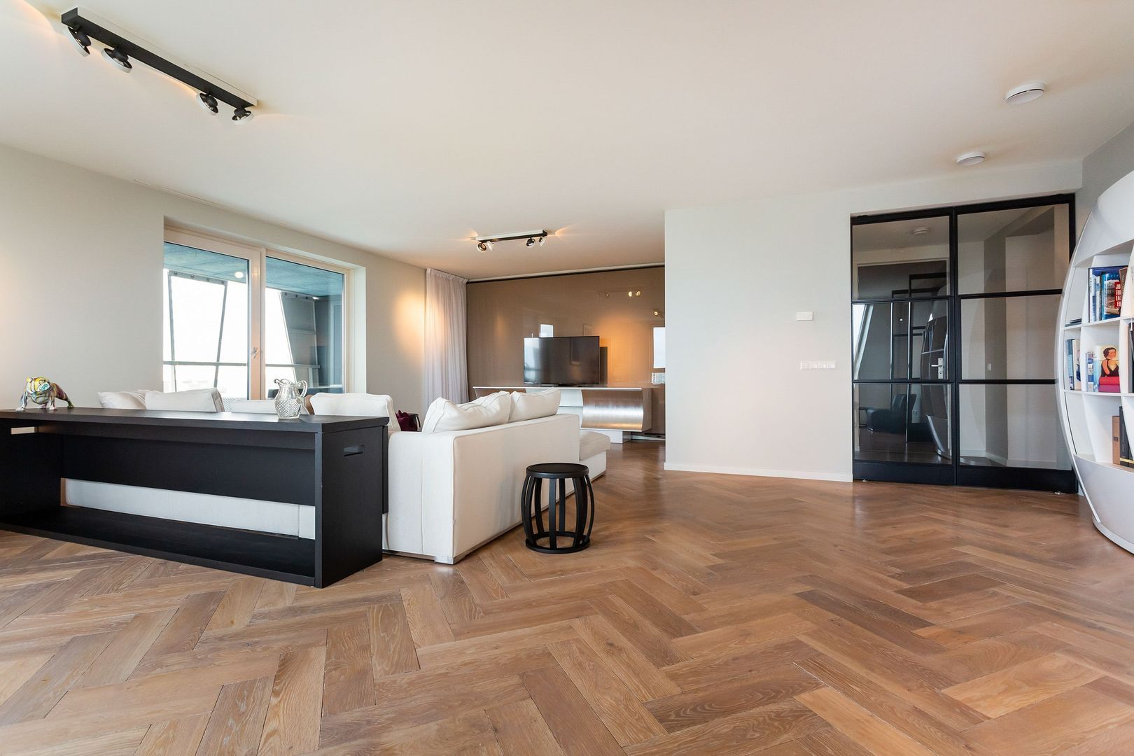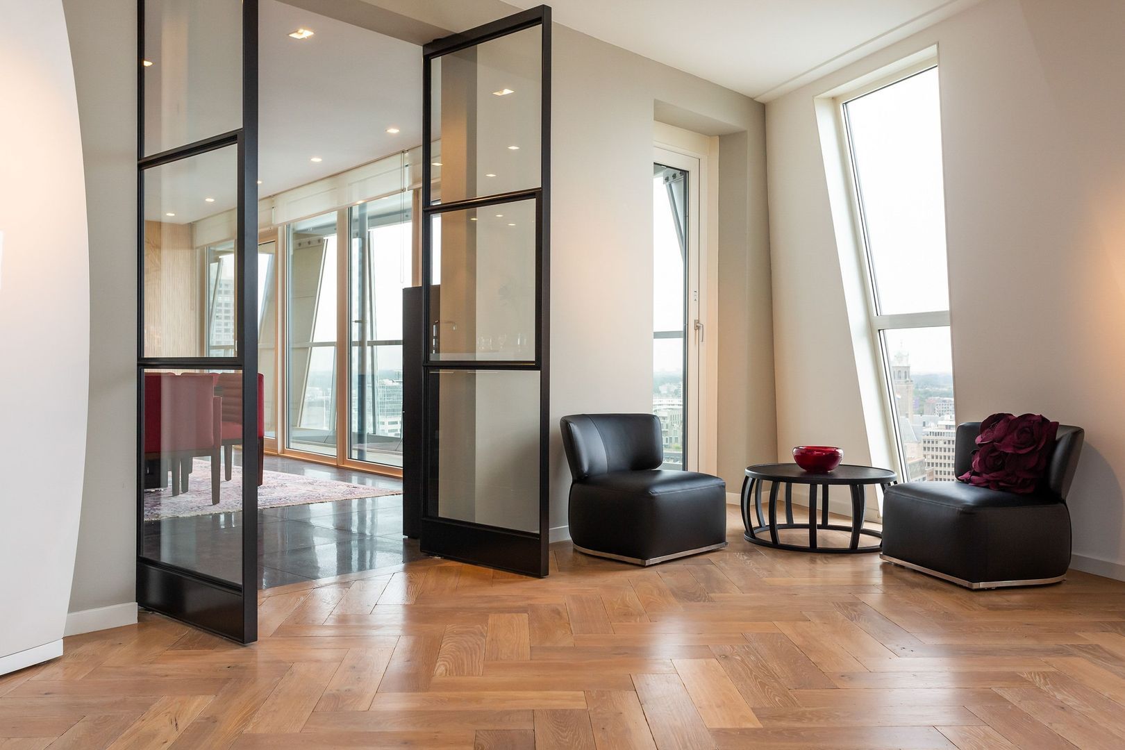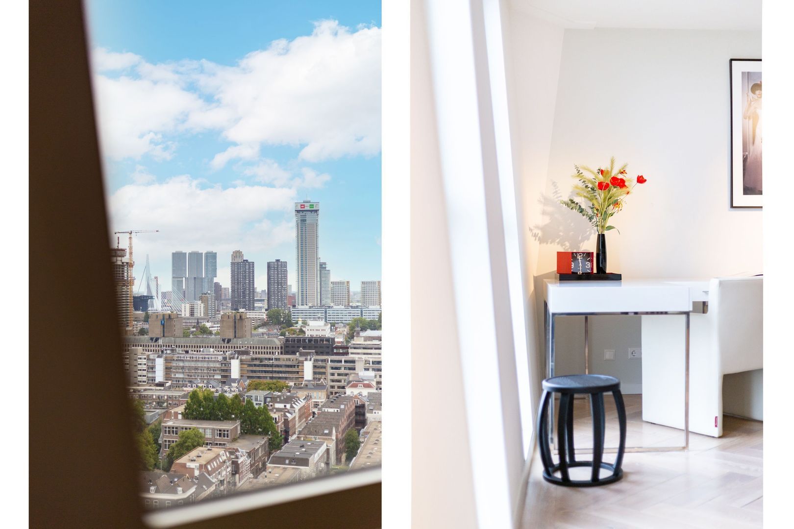Het appartement heeft een rustige en heel functionele indeling en beschikt over een uitermate luxe (o.a. houten en natuurstenen vloeren…) en smaakvol interieur en een adembenemend zicht over de meeste landmarks van Rotterdam, door haar ongeveer 30 meter lange en open buitengevel.