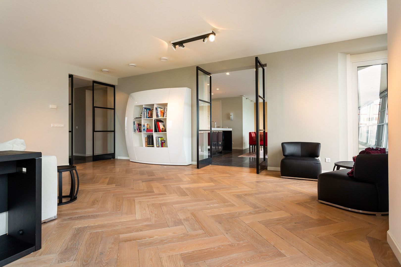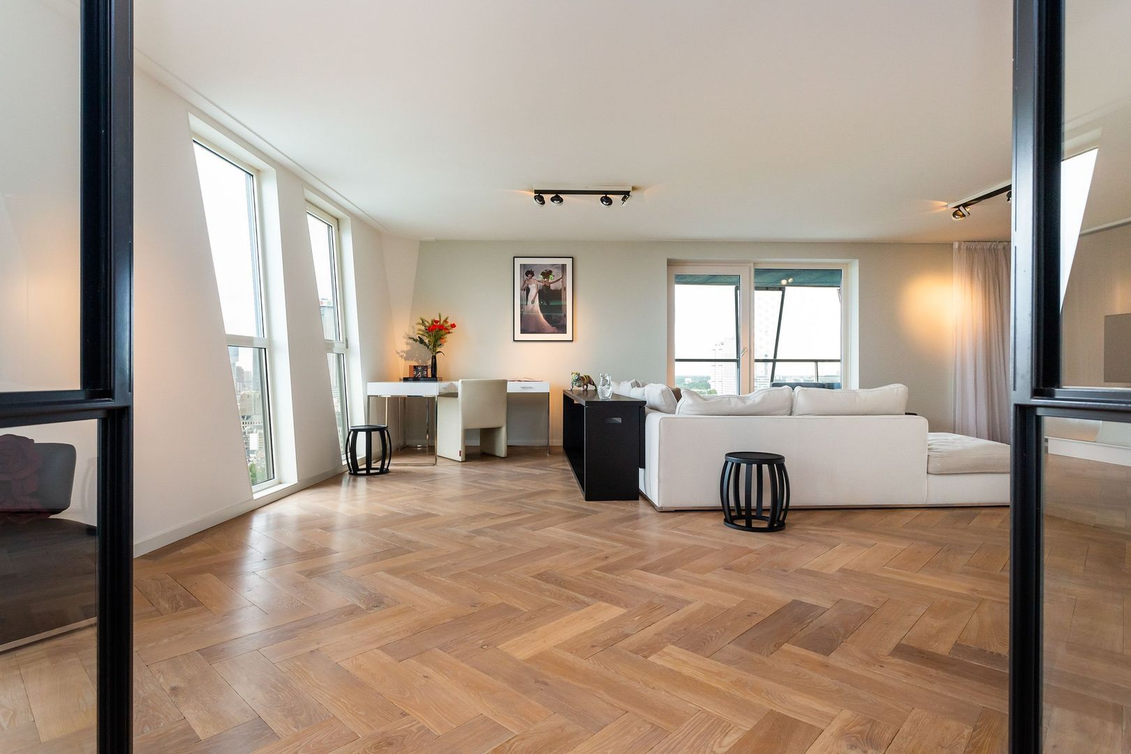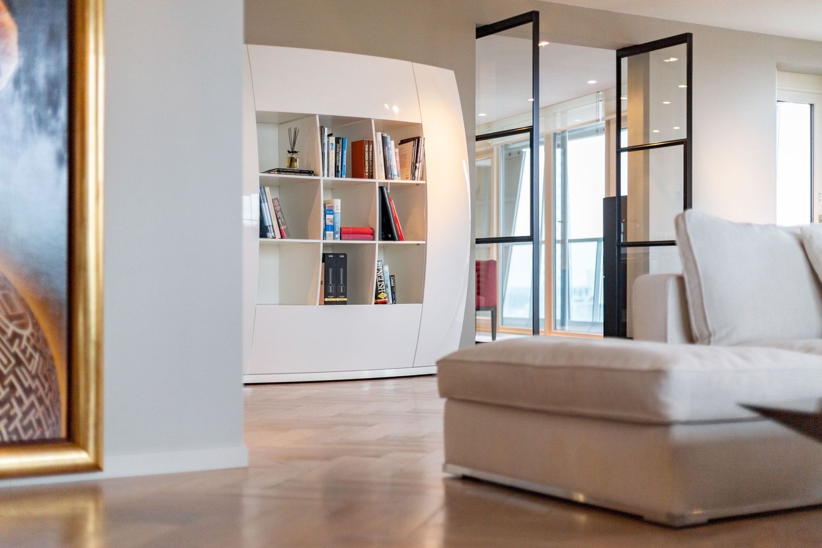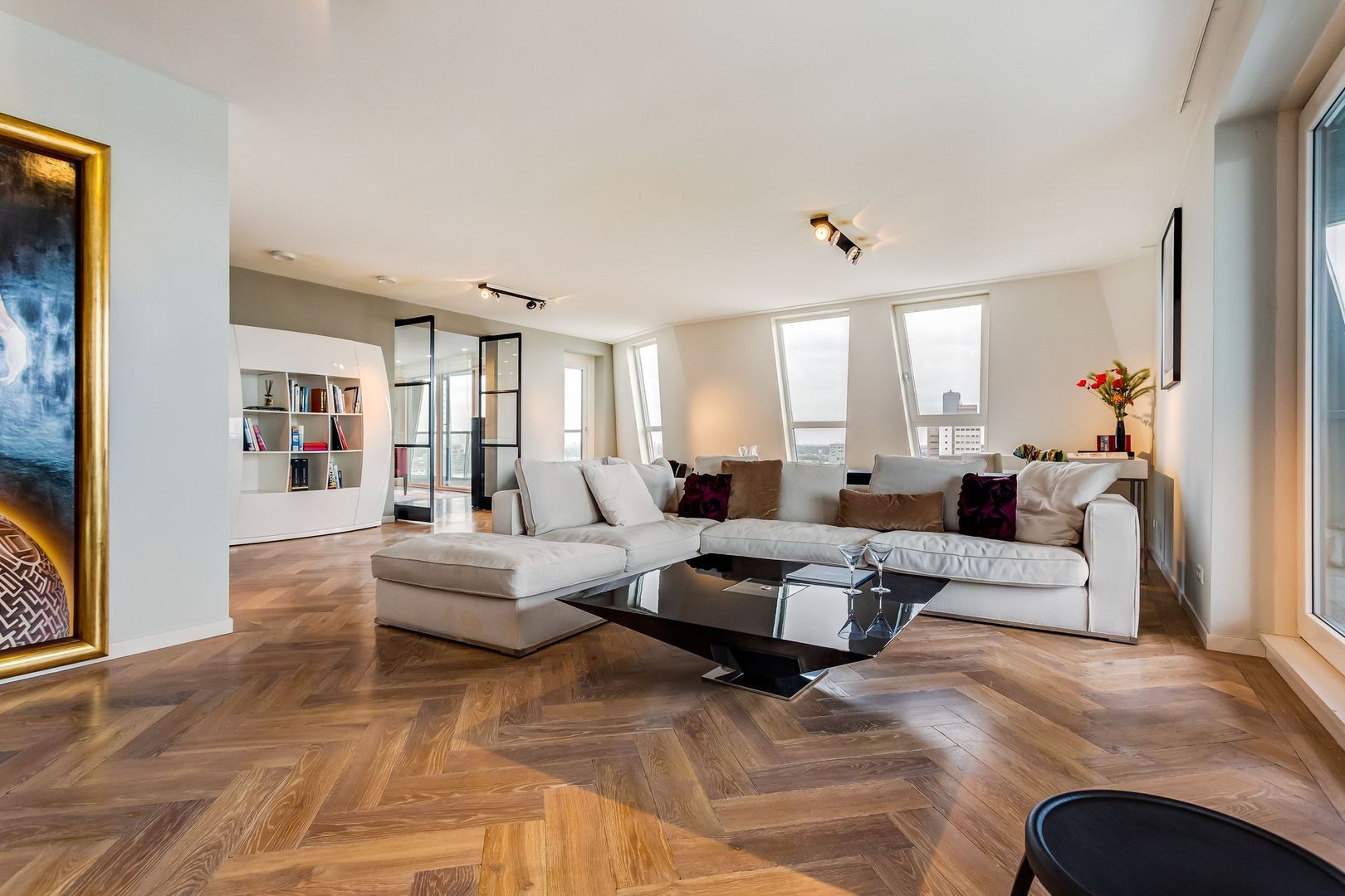 Het appartement heeft een rustige en heel functionele indeling en beschikt over een uitermate luxe (o.a. houten en natuurstenen vloeren…) en smaakvol interieur en een adembenemend zicht over de meeste landmarks van Rotterdam, door haar ongeveer 30 meter lange en open buitengevel.
