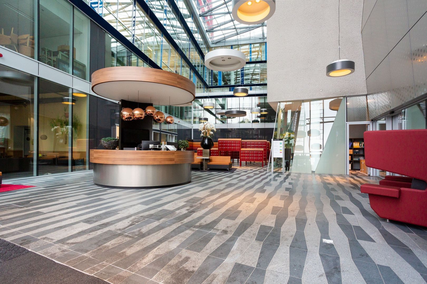Entree met ruime ontvangstruimte (Atrium) voorzien van receptie, brievenbussen, liften, vergaderruimte en fitnessruimte.