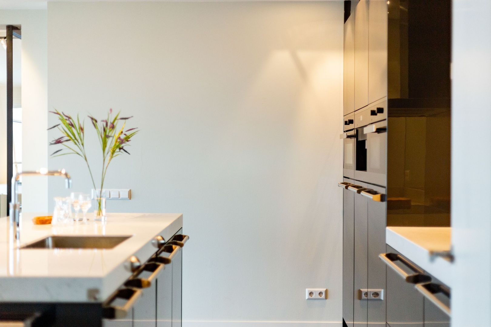 Dubbele deuren naar de eetkamer (2) ca. 25 m2 met toegang tot het 2e TERRAS, een open keukenruimte met luxe keukenopstelling met o.a. een eiland en alle wenselijke inbouwapparatuur, deuren naar het 2e terras.