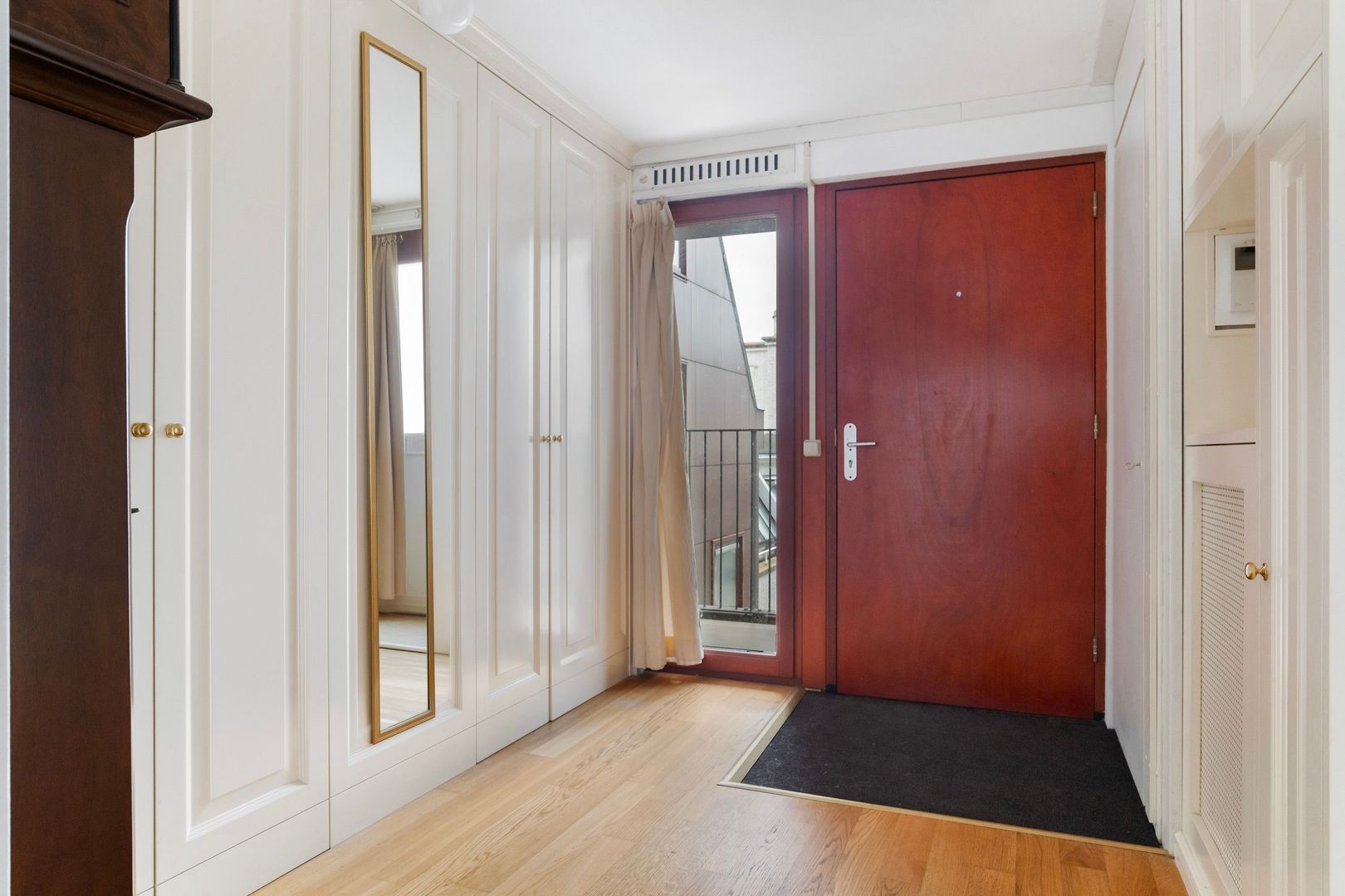 Entree, gang met drie ruime bergkasten, voorzien van videofoon en garderobe,