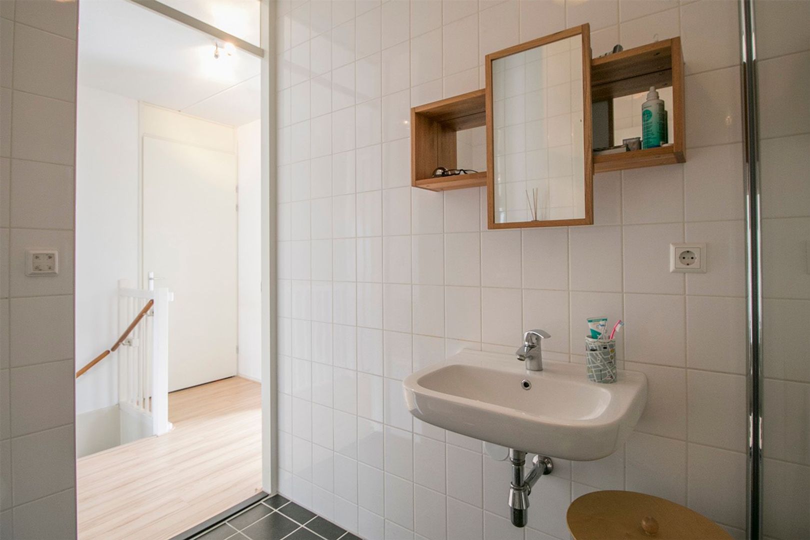 Vide, berging, toiletruimte met hangend watercloset en wasbakje.