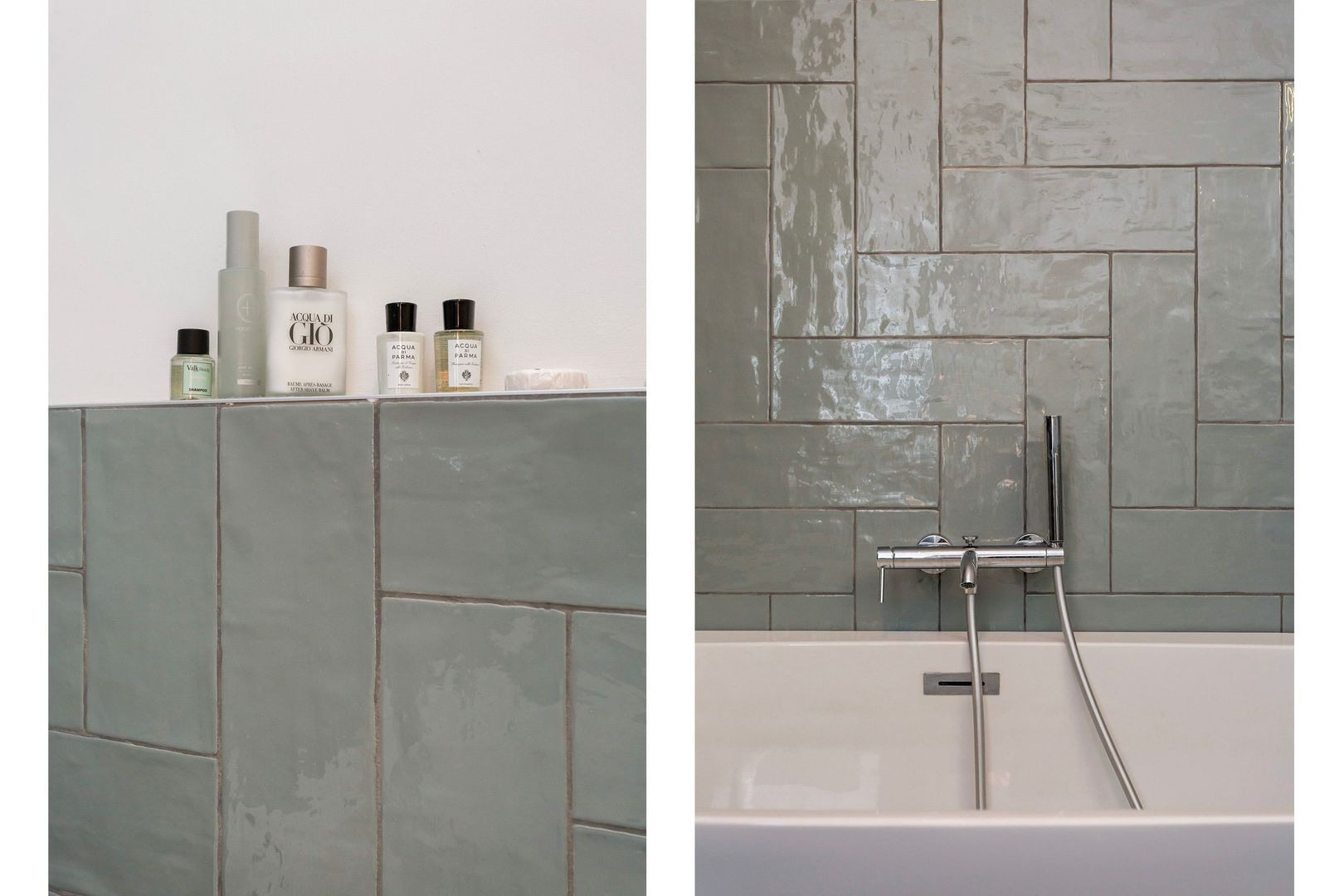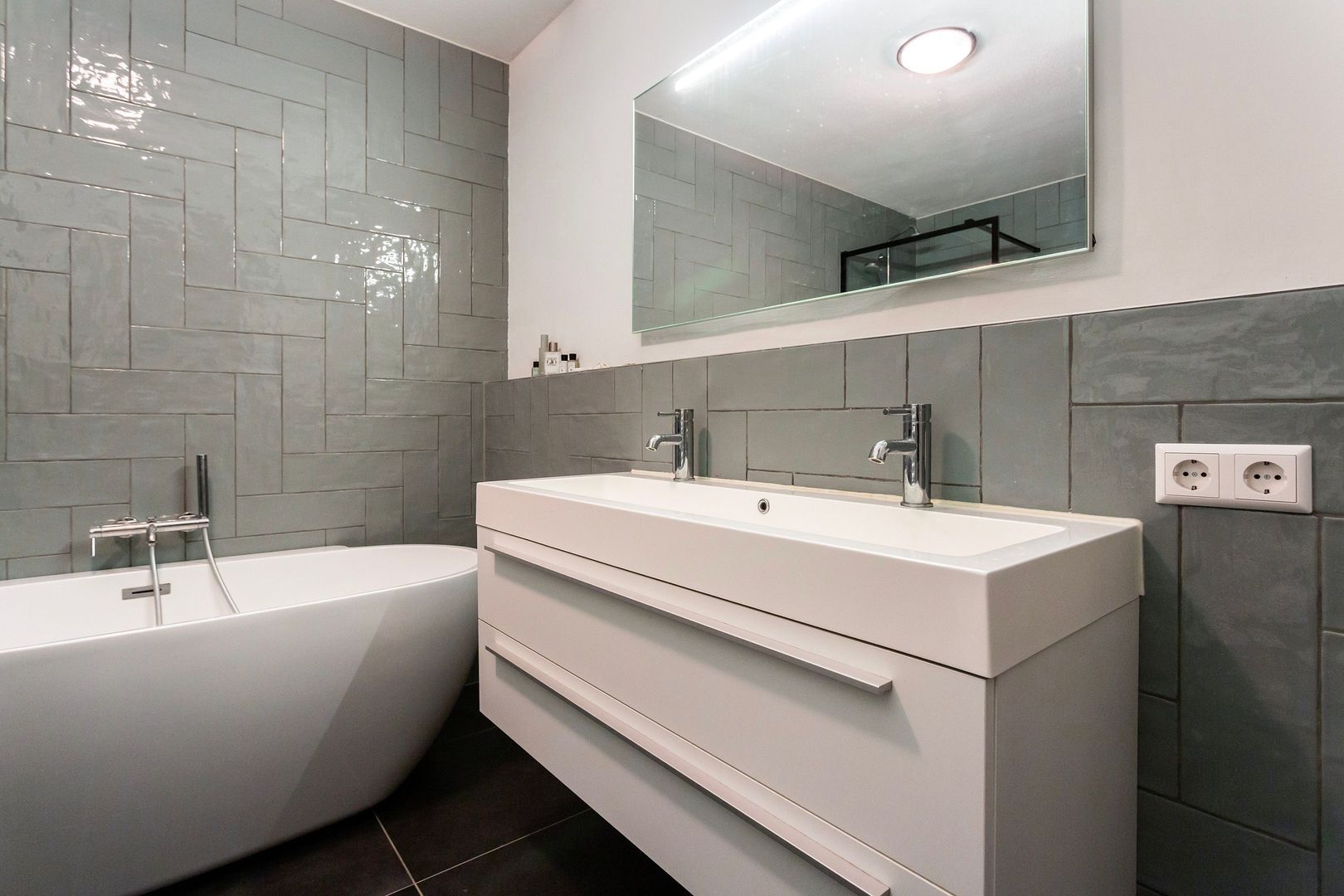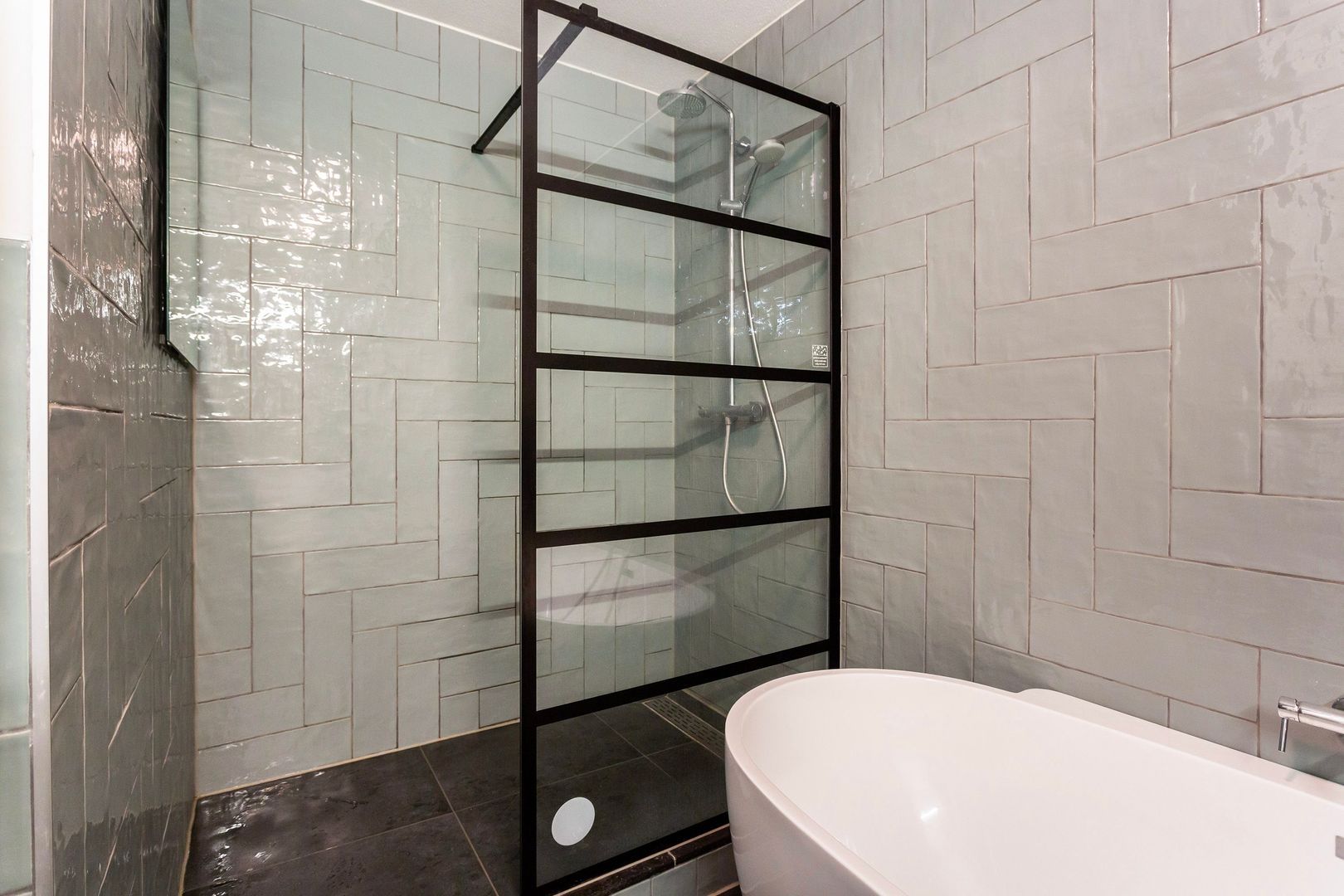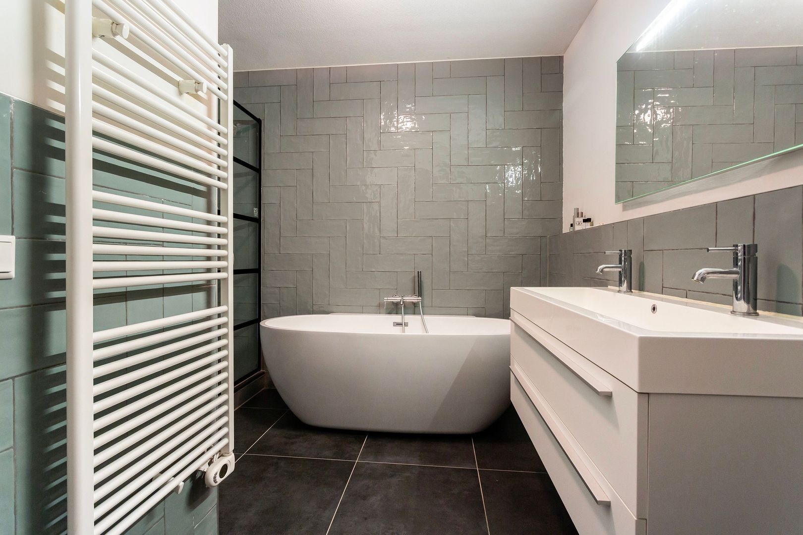 Ruime badkamer voorzien van inloopdouche, ligbad, dubbele wastafel en een