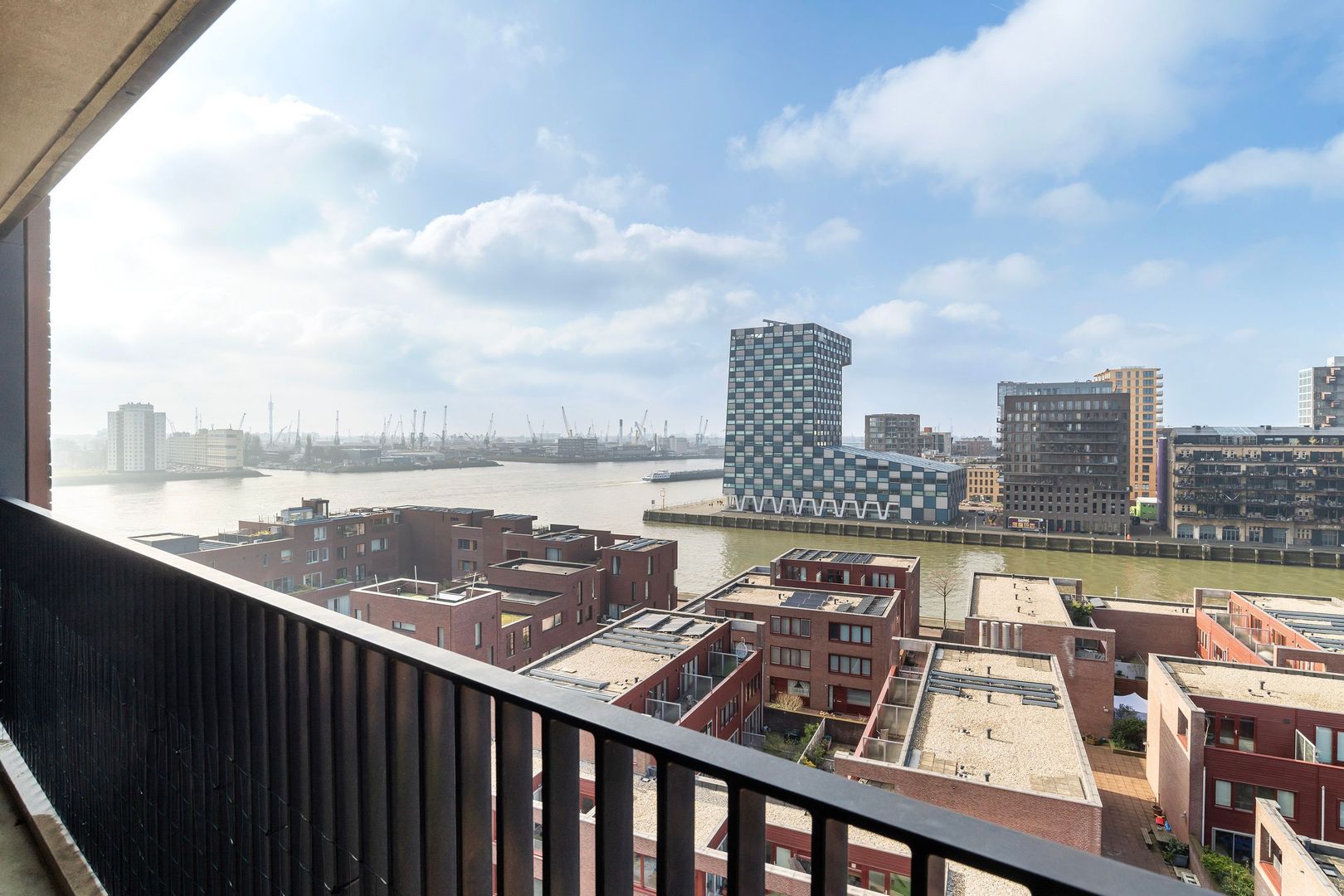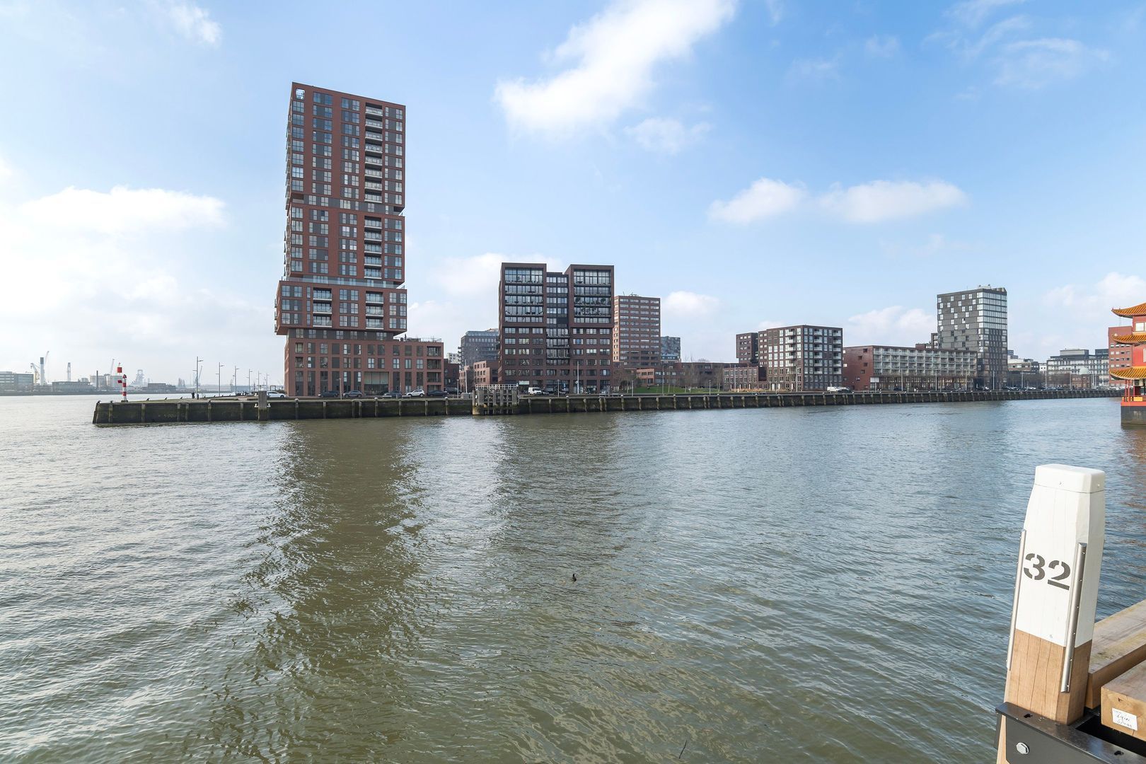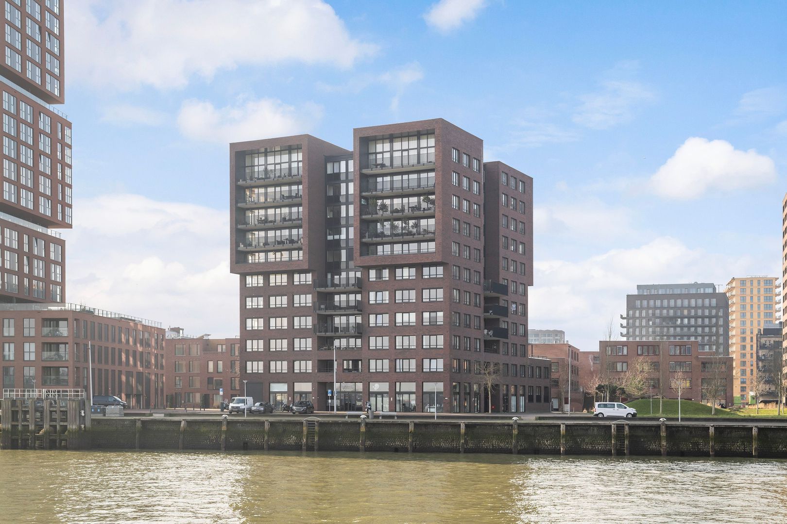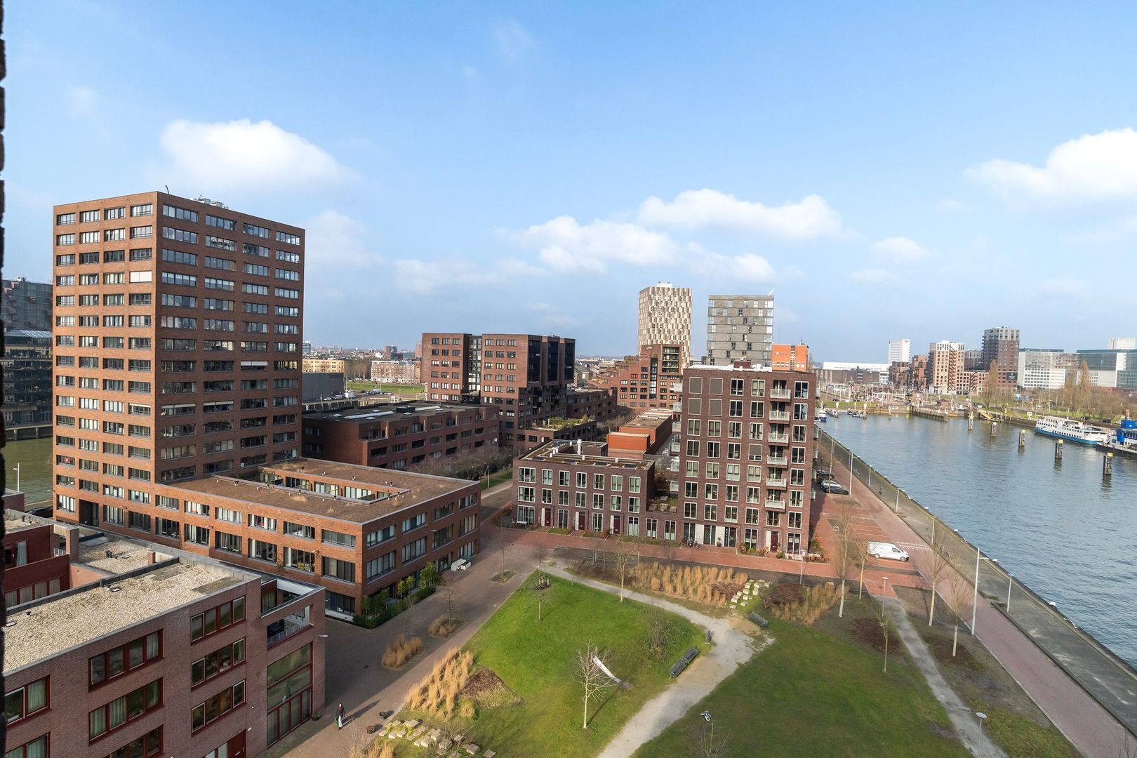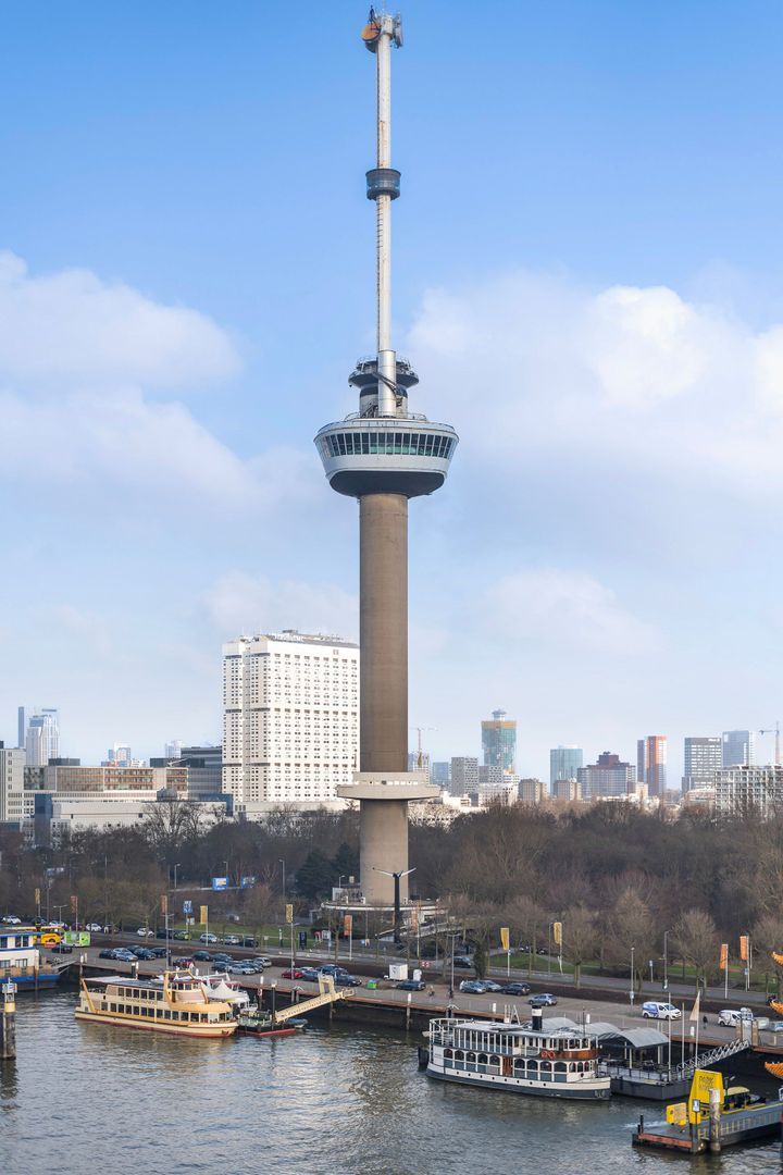 Spectaculair en ruimtelijk 5 – KAMER HOEKAPPARTEMENT (gelijkvloers; ca. 150m²) omringd door het water van de Parkhaven, de Sint Jobshaven en de Nieuwe Maas met haar boeiende scheepsbewegingen en altijd een frisse bries! Vanaf de 8e verdieping zijn de rivier, de Euromast en de skyline van de stad tastbaar (en geluidloos) aanwezig. Echt overal is van het prachtige en ‘bewegelijke’ uitzicht te genieten! Uniek stedelijk wonen (juist óók voor gezinnen) op topniveau.