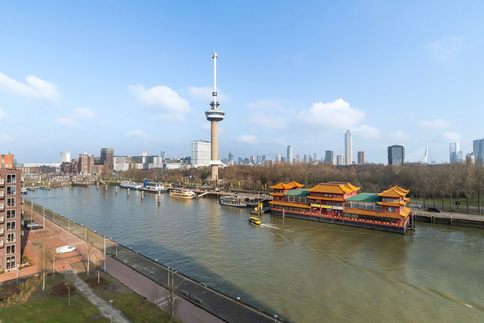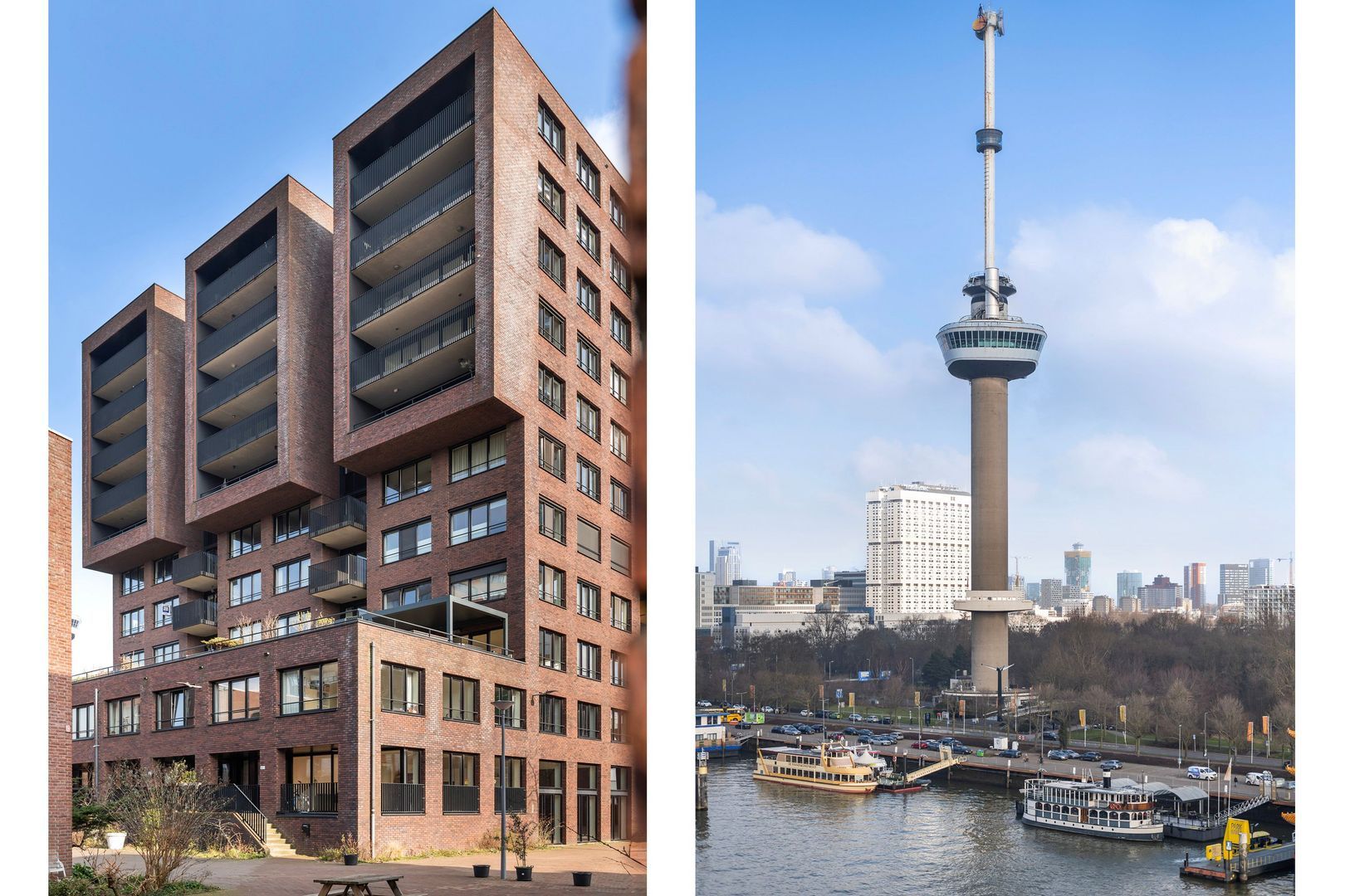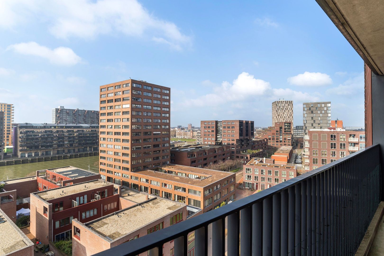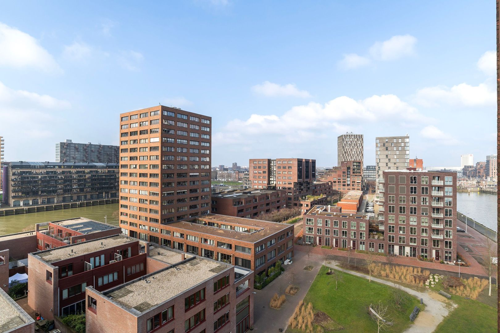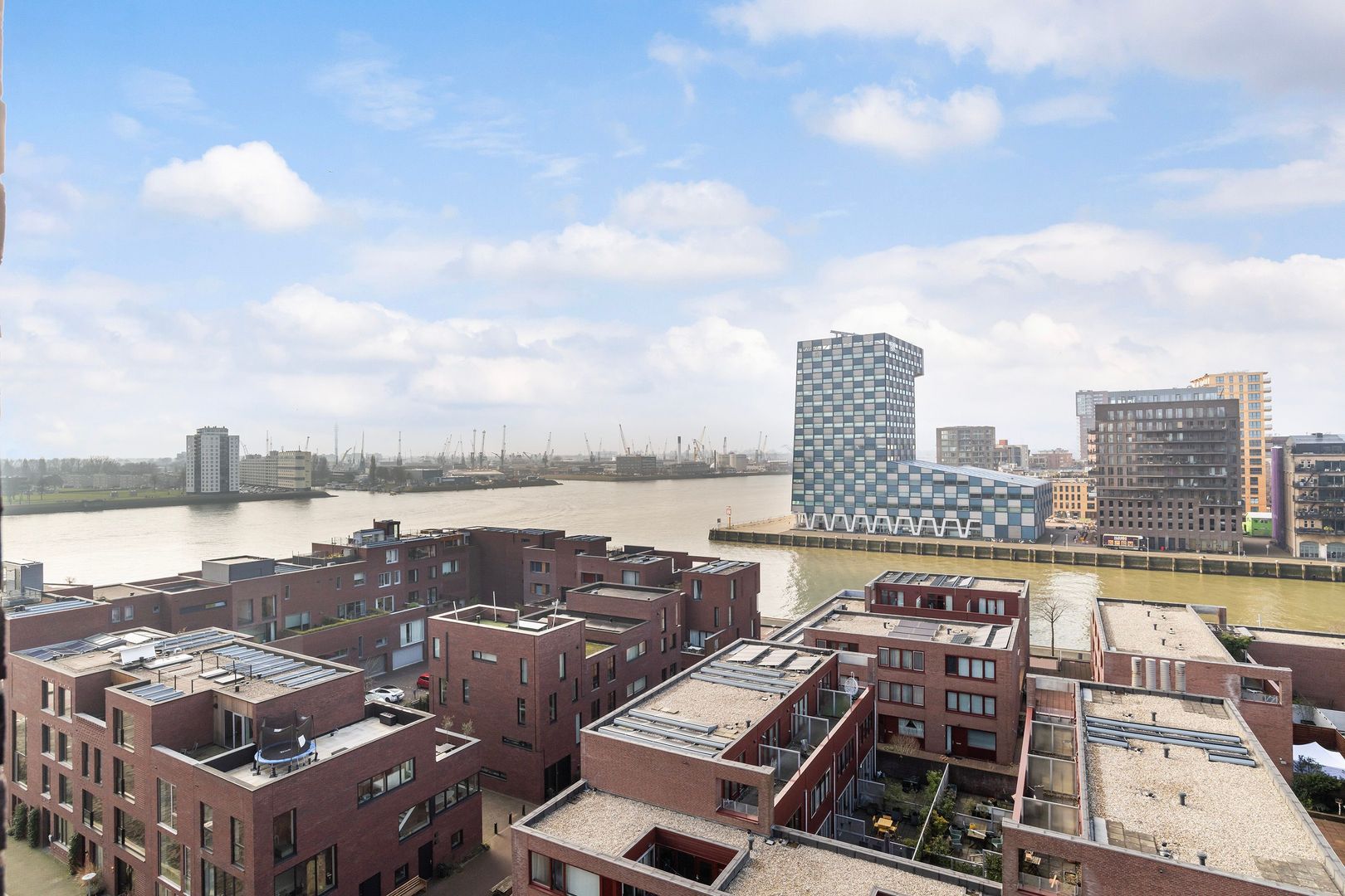 Spectaculair en ruimtelijk 5 – KAMER HOEKAPPARTEMENT (gelijkvloers; ca. 150m²) omringd door het water van de Parkhaven, de Sint Jobshaven en de Nieuwe Maas met haar boeiende scheepsbewegingen en altijd een frisse bries! Vanaf de 8e verdieping zijn de rivier, de Euromast en de skyline van de stad tastbaar (en geluidloos) aanwezig. Echt overal is van het prachtige en ‘bewegelijke’ uitzicht te genieten! Uniek stedelijk wonen (juist óók voor gezinnen) op topniveau.