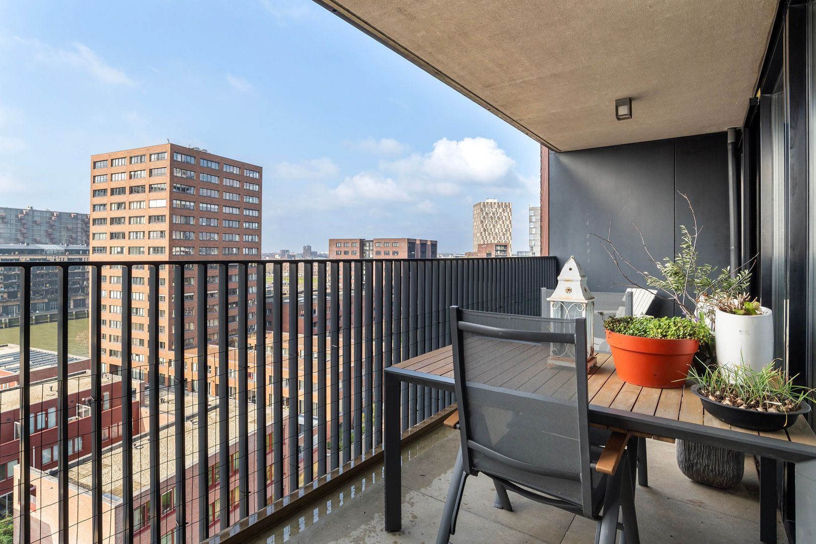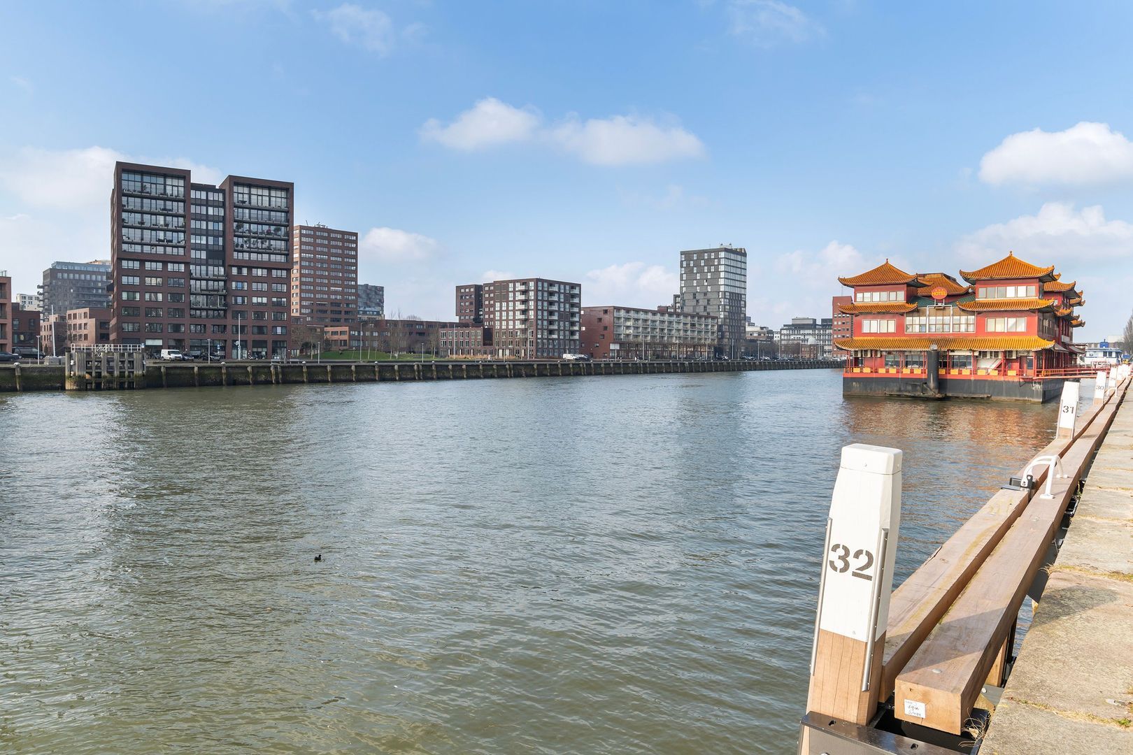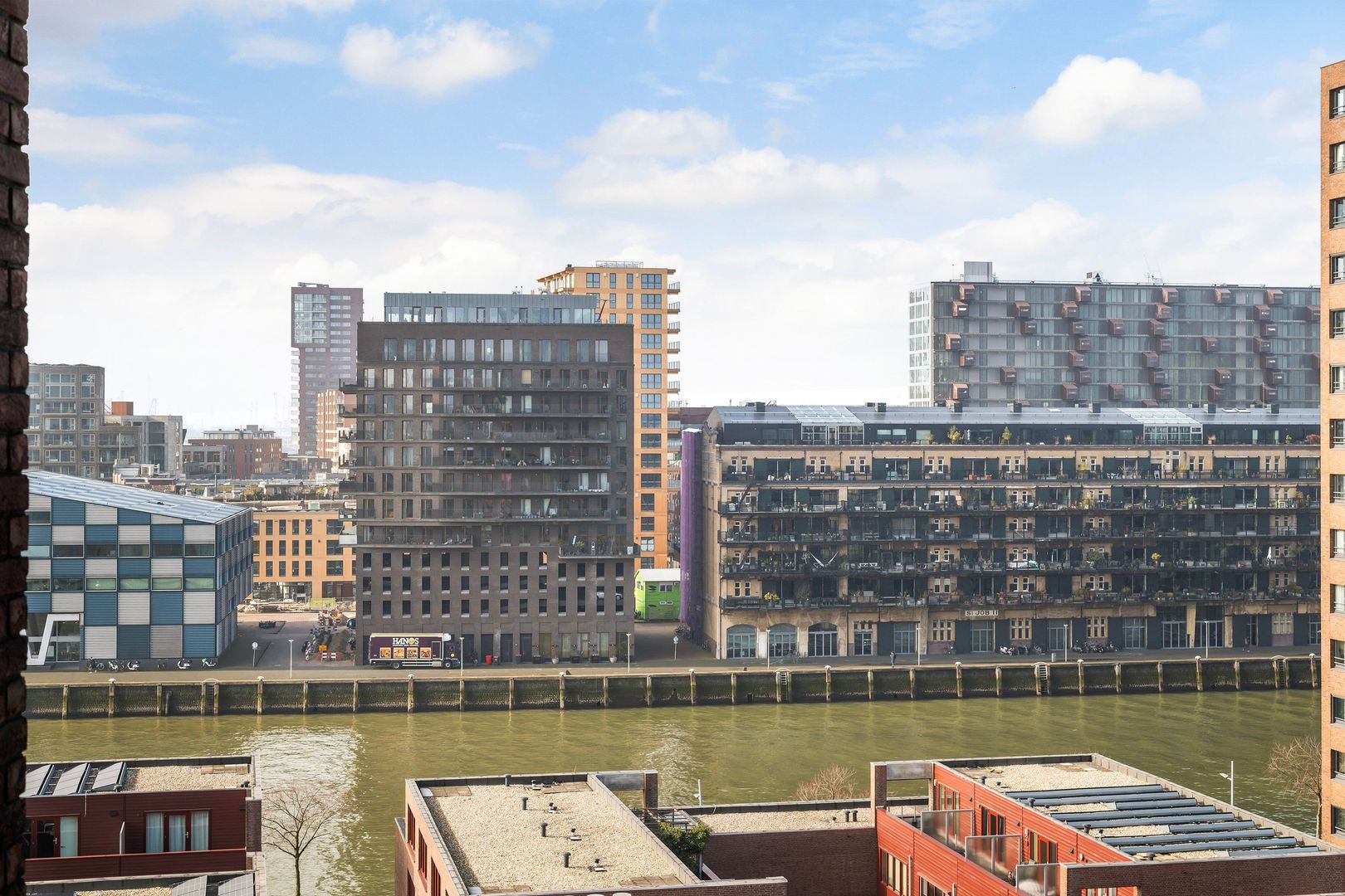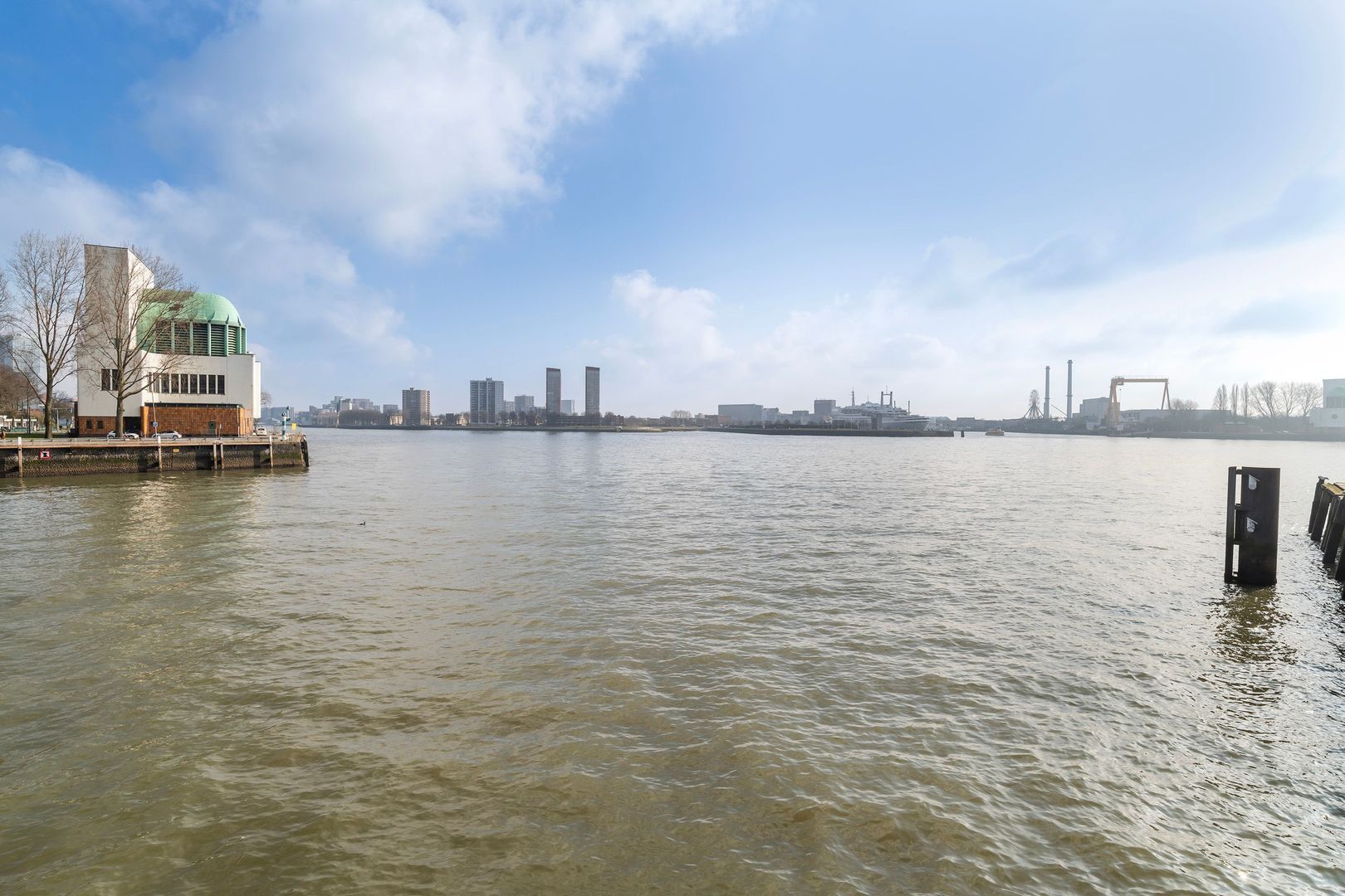 Spectaculair en ruimtelijk 5 – KAMER HOEKAPPARTEMENT (gelijkvloers; ca. 150m²) omringd door het water van de Parkhaven, de Sint Jobshaven en de Nieuwe Maas met haar boeiende scheepsbewegingen en altijd een frisse bries! Vanaf de 8e verdieping zijn de rivier, de Euromast en de skyline van de stad tastbaar (en geluidloos) aanwezig. Echt overal is van het prachtige en ‘bewegelijke’ uitzicht te genieten! Uniek stedelijk wonen (juist óók voor gezinnen) op topniveau.