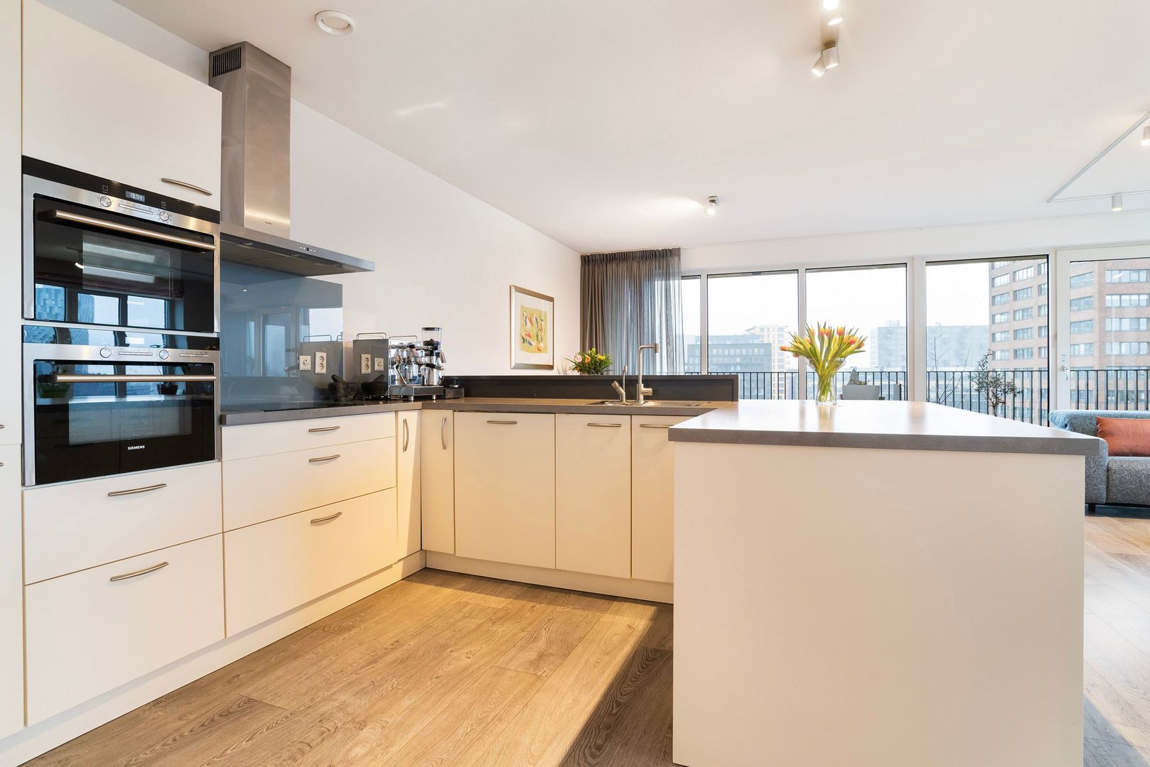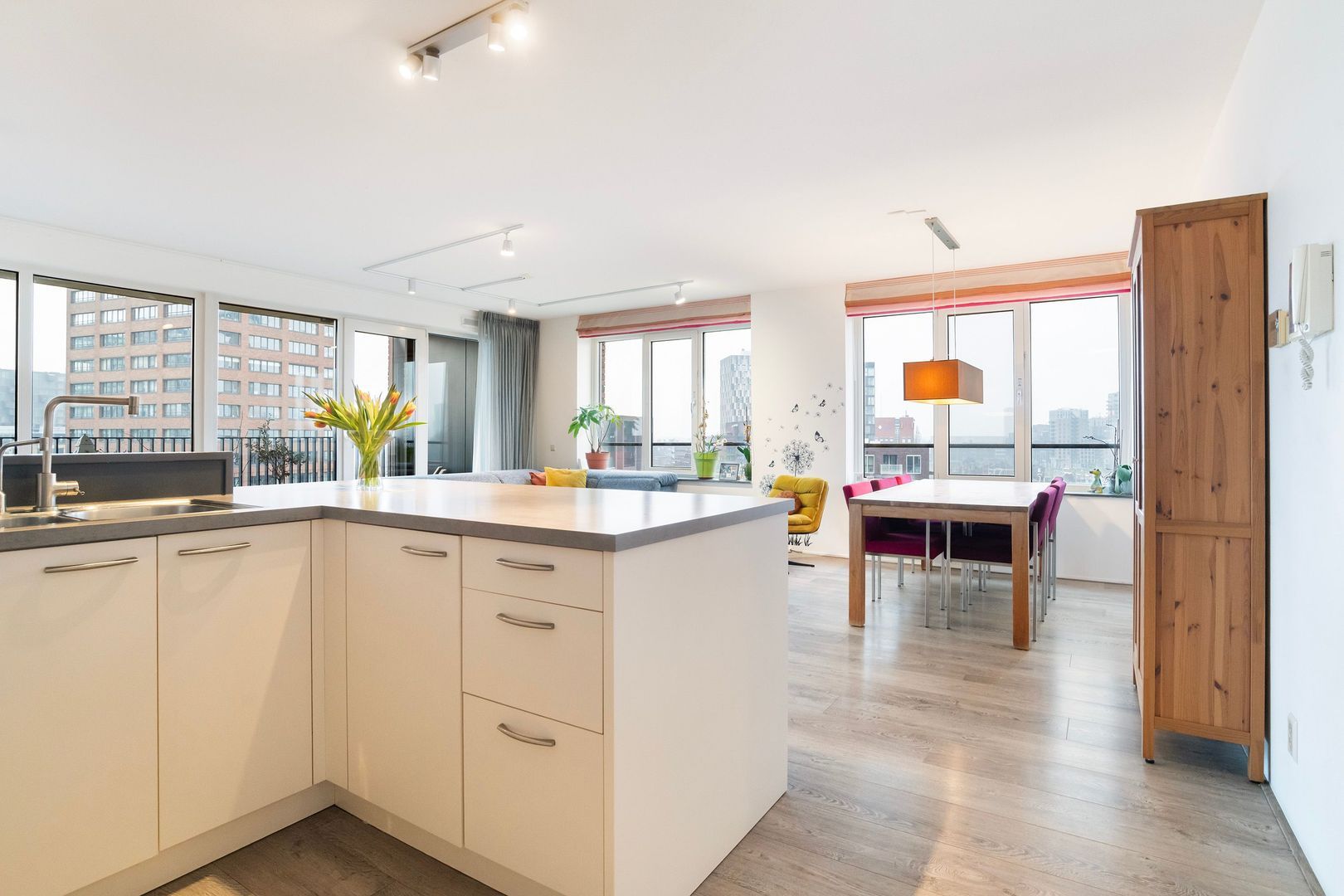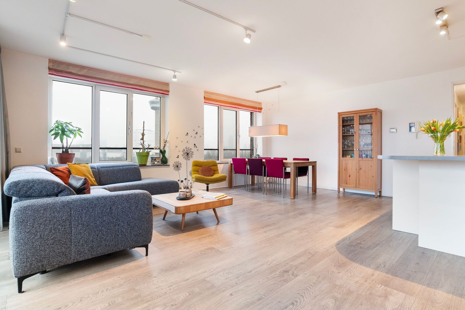 Woonkamer (1) ca. 48m²; royale en heel lichte leefruimte met grote raampartijen aan 2 zijden. Spectaculair zicht over onder andere de stad, maar ook de haven.