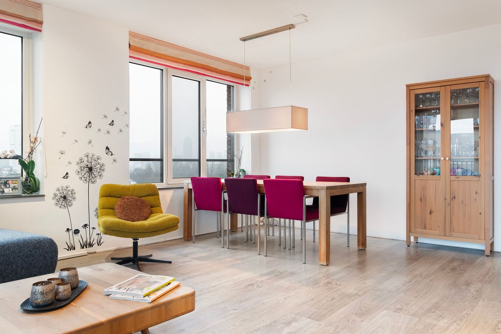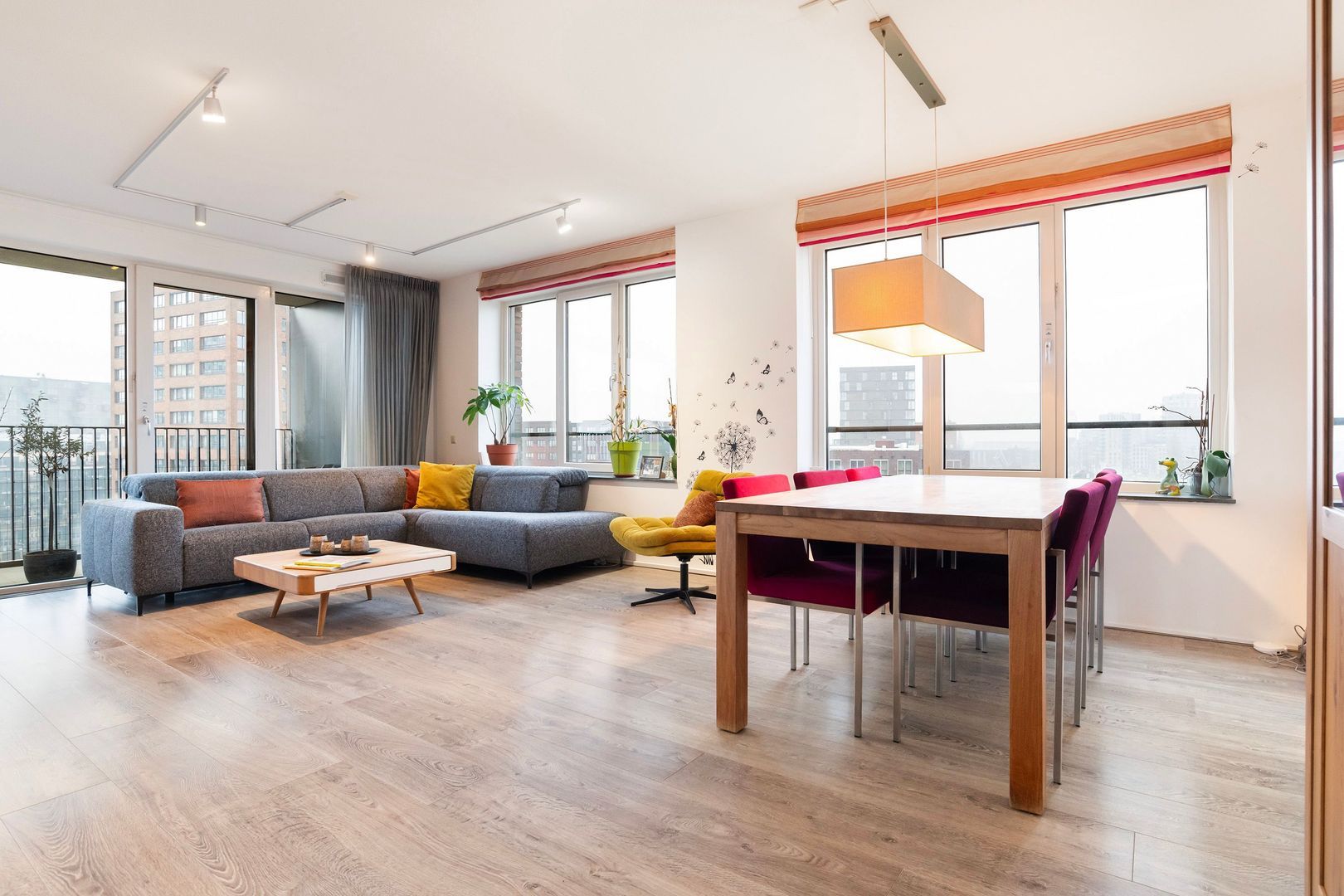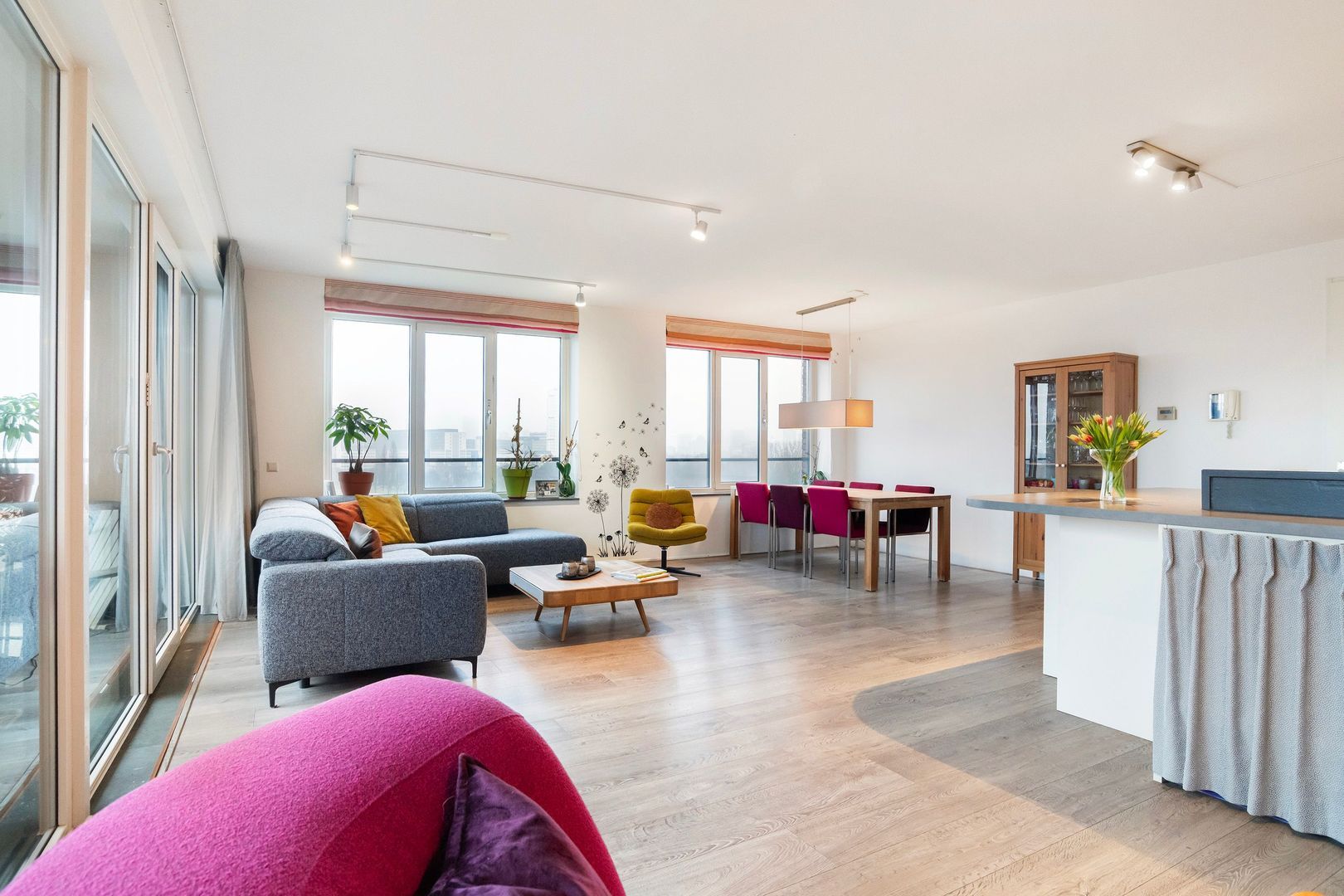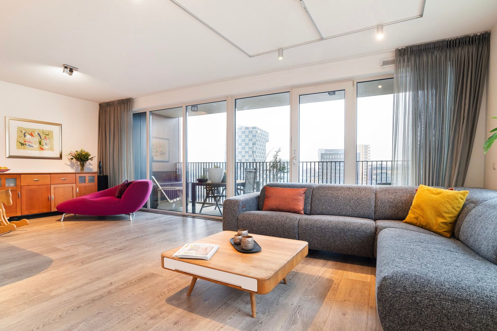 Woonkamer (1) ca. 48m²; royale en heel lichte leefruimte met grote raampartijen aan 2 zijden. Spectaculair zicht over onder andere de stad, maar ook de haven.