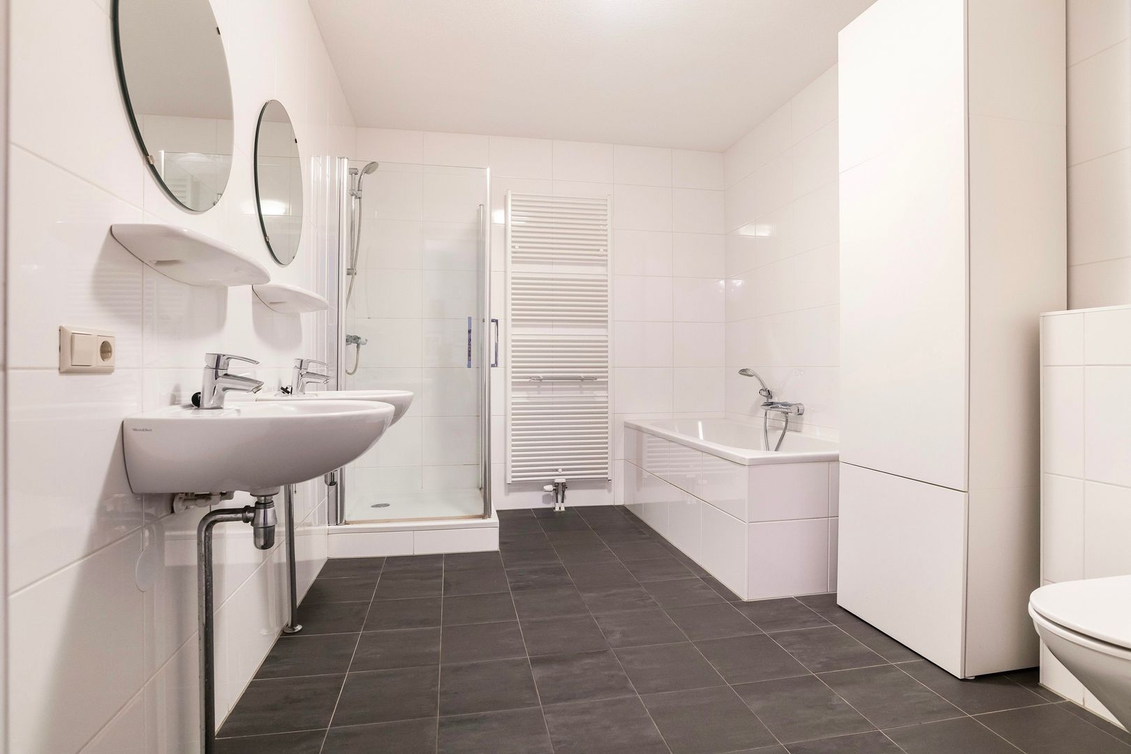 Badkamer (ècht groot!) met dubbele wastafel, ligbad, douche en 2e wc.