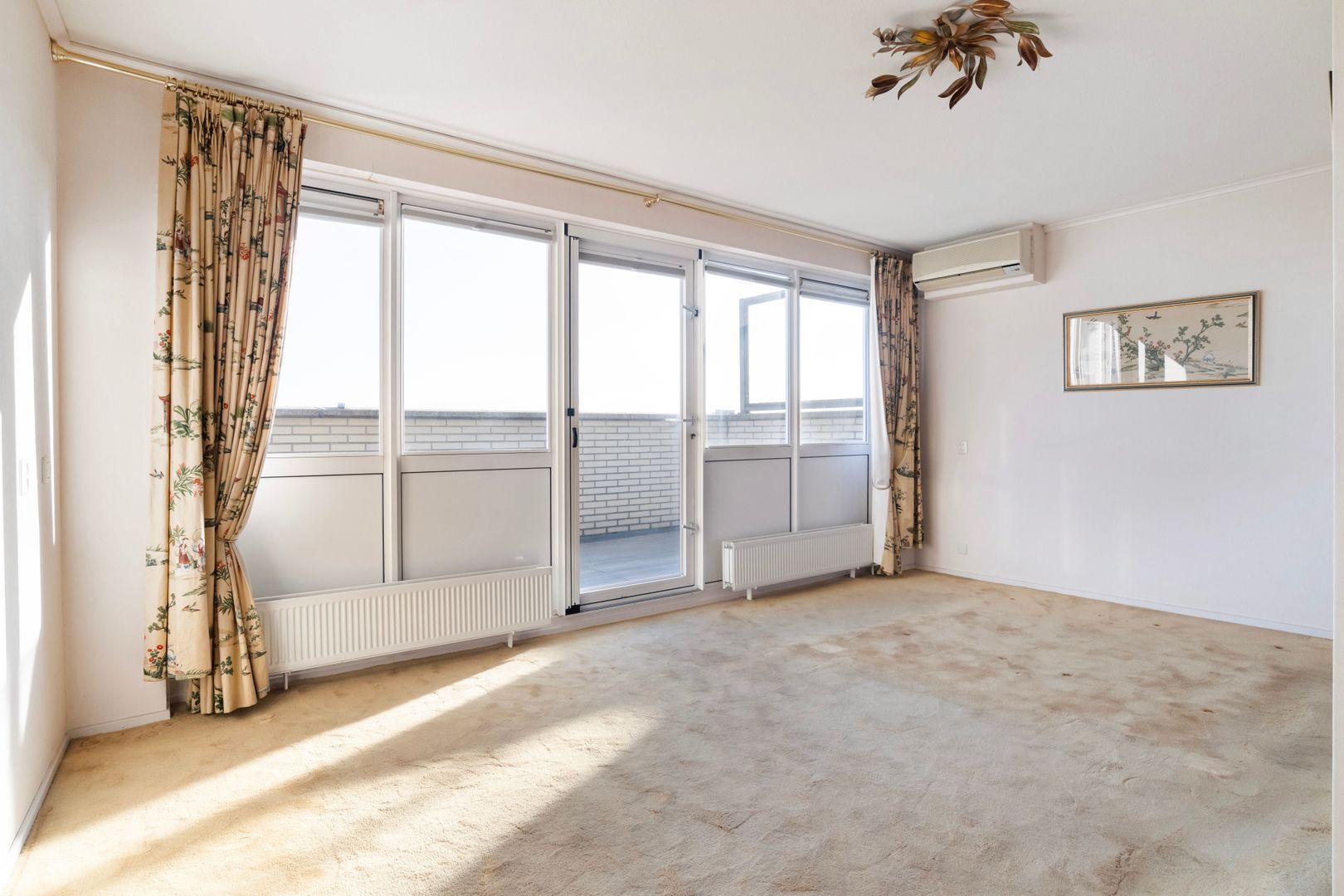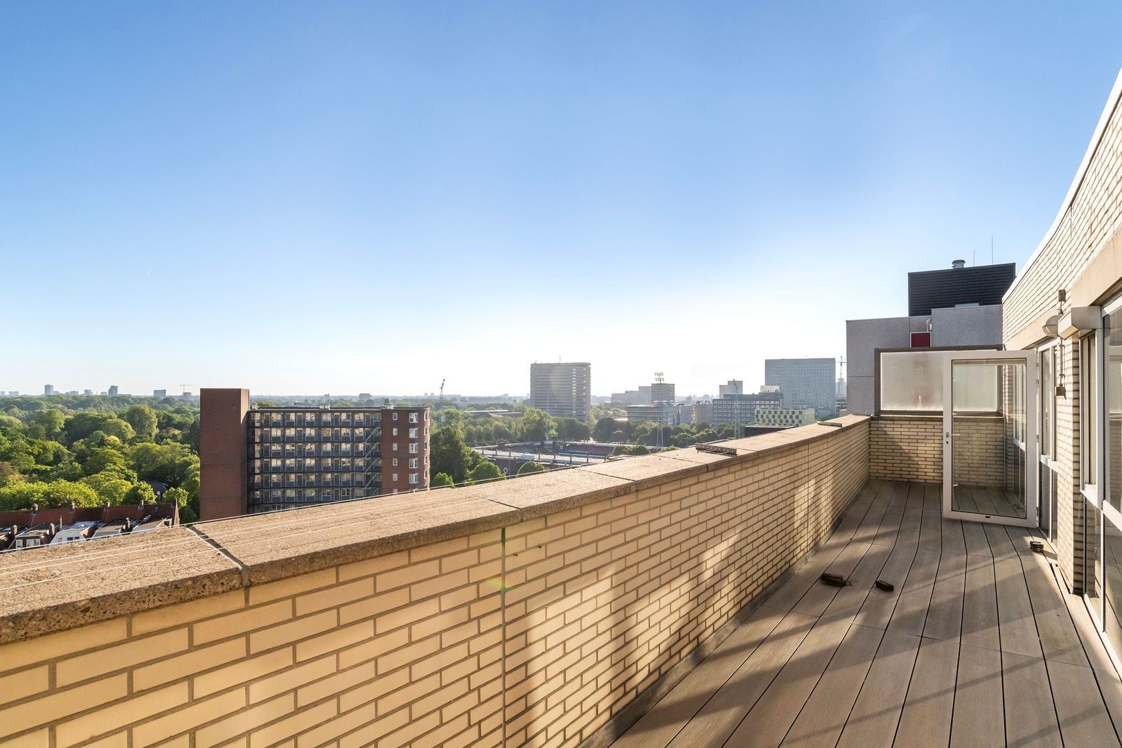 Slaapkamer (3) ca. 20 m², aan de rustige zijde van Kralingen, met toegang tot het tweede terras (ca. 25 m²). Dit terras biedt de mogelijkheid om op ‘te warme’ dagen te vluchten voor de zon. Er is een heerlijk zicht over Arboretum Trompenburg en de daken van Kralingsche villa’s……