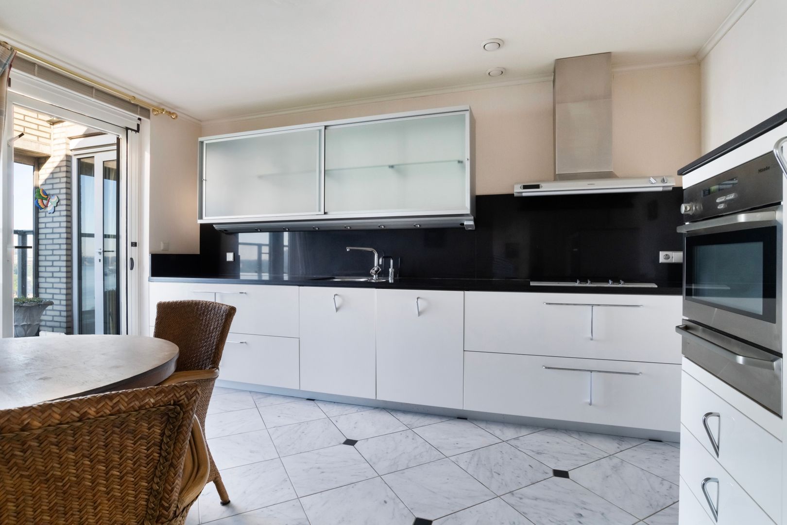 Grote (leef)keukenruimte ca. 10m² met een moderne keuken en voorzien van diverse inbouwapparatuur, waaronder een halogeen kookplaat van Gaggenau, oven, warmhoudlade, vaatwasser (alle drie van Miele) en een inbouwkoelkast.