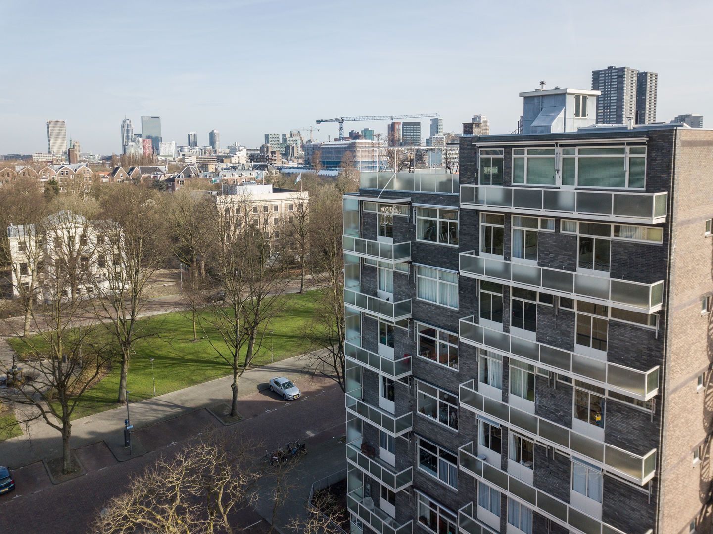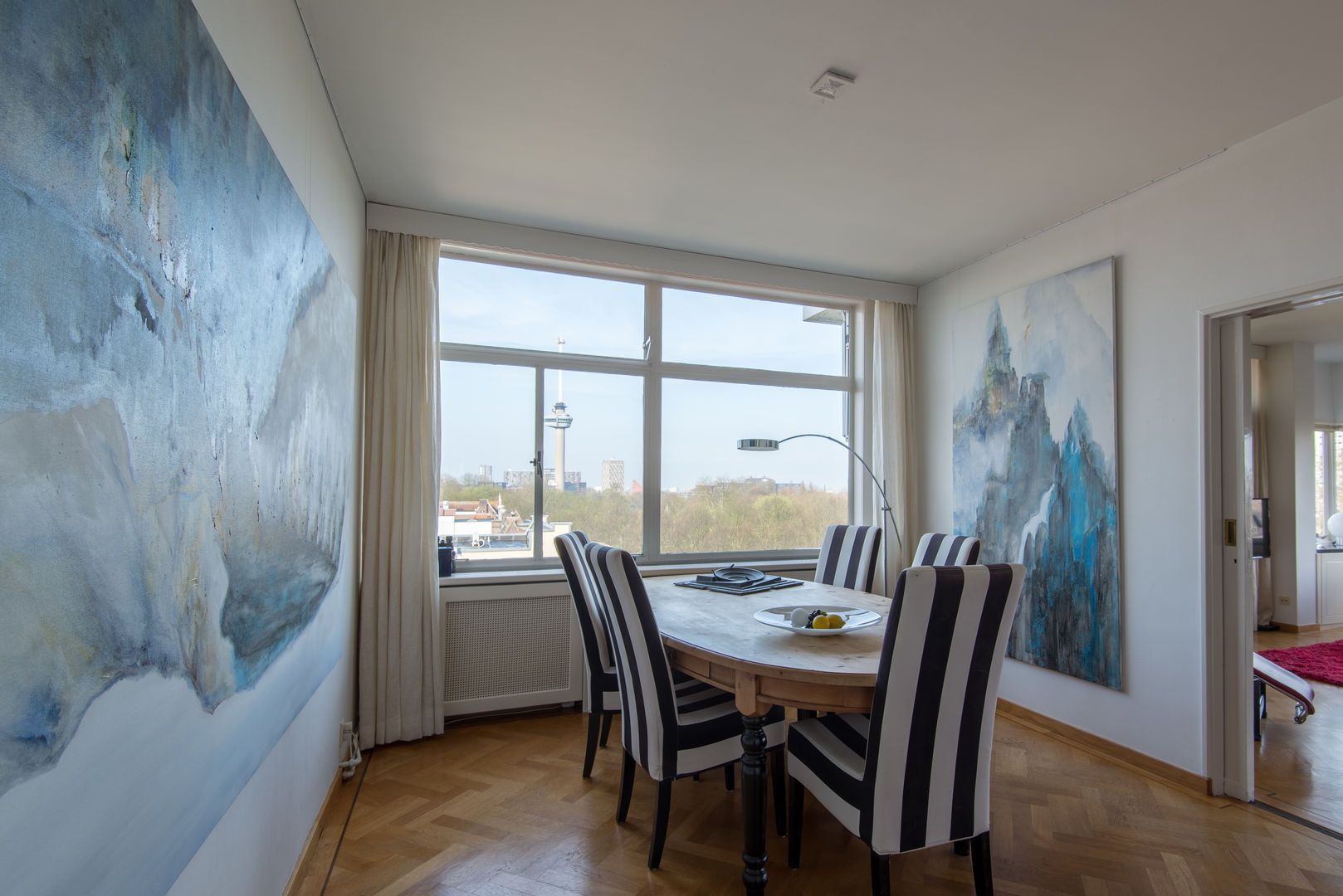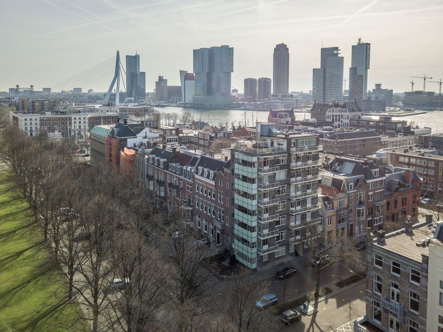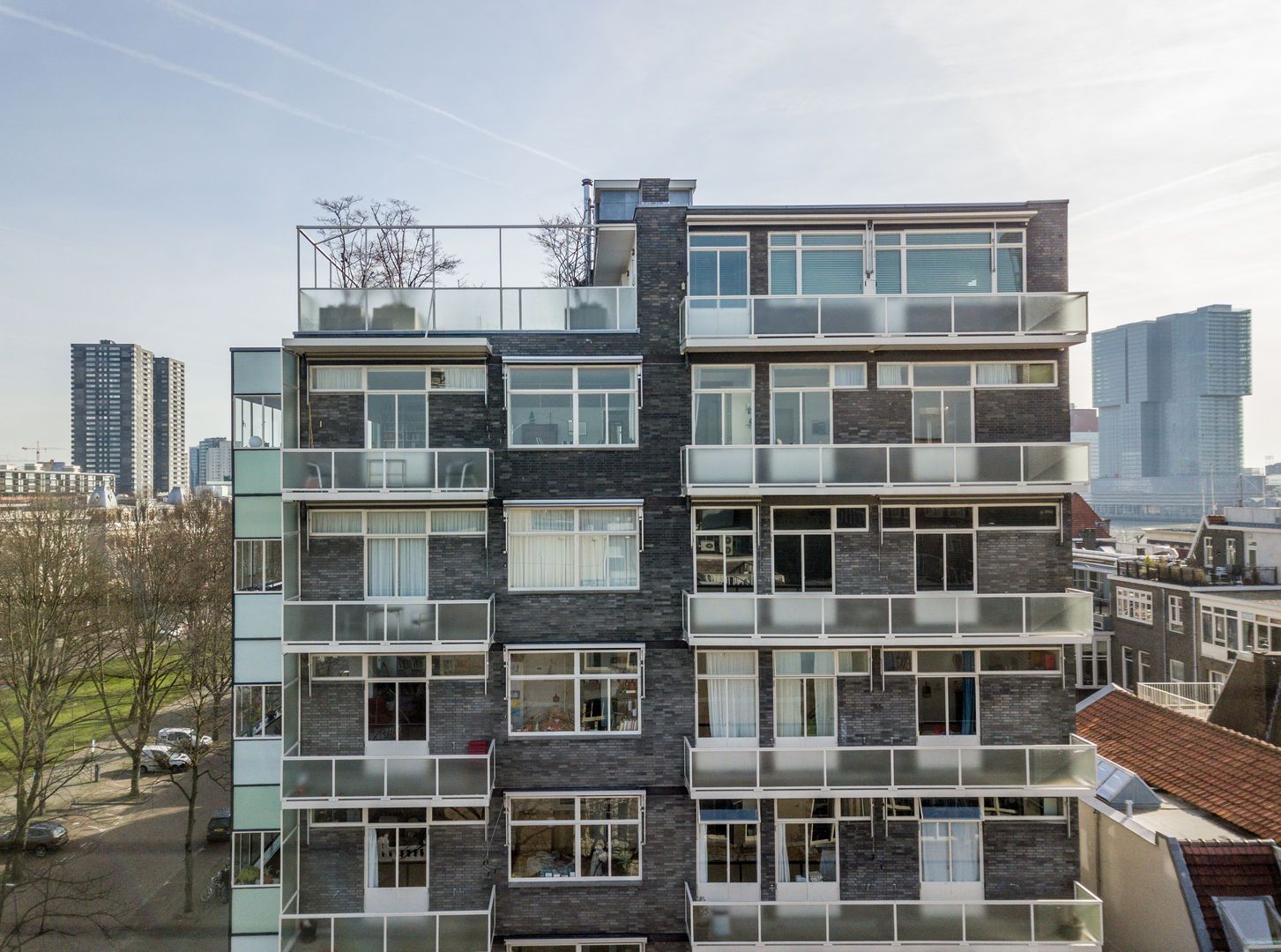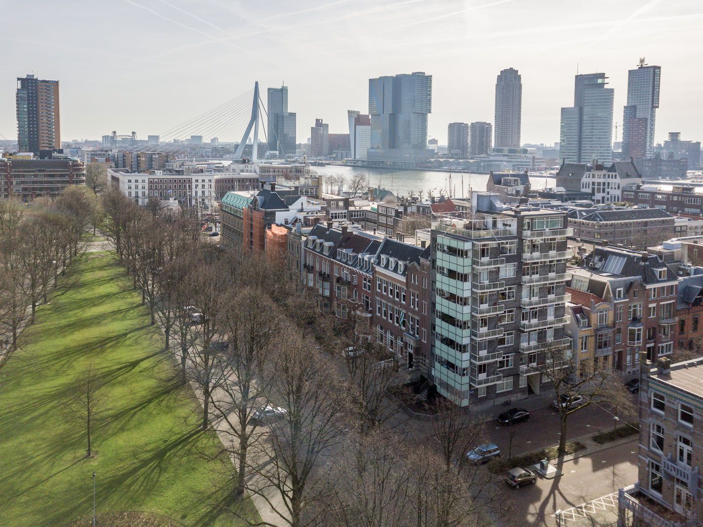 Op de 6e verdieping van het schitterende rijksmonument “Parklaanflat’ (1933, Architect W. van Tijen), geheel vrij gelegen 5 - KAMER APPARTEMENT (ca. 150m2) met 2 ruime BALCONS en een blijvend vrij uitzicht ‘over’ de bomen van de Parklaan op de Rotterdams stadse horizon. Gebouw ‘Flatgebouw Parklaan’ en het appartement bevinden zich in het blijvend rustigere deel van het Scheepvaartkwartier; een unieke ligging op een steenworp afstand van Het Park, de Veerhaven, diverse gewaardeerde restaurants en overige stadse faciliteiten, waaronder een landelijk bekende kruidenier. Het Scheepvaartkwartier heeft via de Maasboulevard, de Maastunnel en de Erasmusbrug snelle aansluitingen op de Ring van Rotterdam. Haltes voor tram, bus, watertaxi en het metrostation Leuvehaven (aansluiting naar Rotterdam CS) bevinden zich op loopafstand. De kleinschalige Parklaanflat herbergt slechts 8, over het algemeen, verdiepingsgrote appartementen. Samen met een professionele administrateur regisseren de eigenaren een secure en zorgvuldige Vereniging van Eigenaren. Lift en eigen berging in de onderbouw. Het gebouw heeft een draagconstructie van stalen kolommen en balken waardoor alle binnenwanden verwijderd kunnen worden. Het wordt dan mogelijk een vrij indeelbare loft van 150 m2 te maken. Indeling: (Onderstaande kamernummering verwijst naar de plattegrond) Begane grond: Afgesloten centrale entree. Prachtig ‘draaiend’ trappenhuis. 6e verdieping: Entree, ruime hal met eiken visgraat parketvloer, twee vaste kasten, royale toiletruimte. Videofoon. Fantastische woonkamer (1) ca. 50m2, met huisbrede raampartij met blijvend vrij uitzicht ‘over’ de bomen van de Parklaan op de Rotterdams’ stadse horizon. Een eiken visgraatparket, open haard, schouw en openslaande deuren naar Balcon op het Westen. Schuifdeur naar: Eetkamer (2) ca. 14m2, met eiken visgraatparket. Keukenruimte ca. 9m2, met op maat gemaakte keuken in Engelse stijl met een hardstenen aanrechtblad en voorzien van alle wenselijke apparatuur. Openslaande deuren naar het 2e BALCON op het Westen. Lange dagverlichte gang met kastenwand. Ouderslaapkamer (3) ca. 17,5m2 met ingebouwde kasten, openslaande deuren naar het 2e BALCON en aansluitend een fraaie badkamer voorzien van bubbelbad, douche, dubbele wastafel en watercloset. Deur naar (vlucht)balcon. Slaapkamer (4) ca. 10m2 met wastafel, ingebouwde kast en openslaande deuren naar het 2e BALCON. Studeer-/werkkamer (ook te gebruiken als slaapkamer) (5) ca. 8m2 met ingebouwde kast. Bijzonderheden: - Bouwjaar 1933. - In de periode 1993 - 1995 is het gebouw volledig gerenoveerd. - De Parklaanflat is aangewezen als Rijksmonument. - Onderdeel beschermd Stads- en/of Dorpsgezicht. - Gelegen op eigen grond. - Woonoppervlak ca. 150m2. - Verwarming door middel van stadsverwarming. - Warm water door middel van boiler. - Videophone en alarminstallatie. - Zonneschermen. - Bijdrage V.v.E. € 223,51 per maand (exclusief voorschot stookkosten).