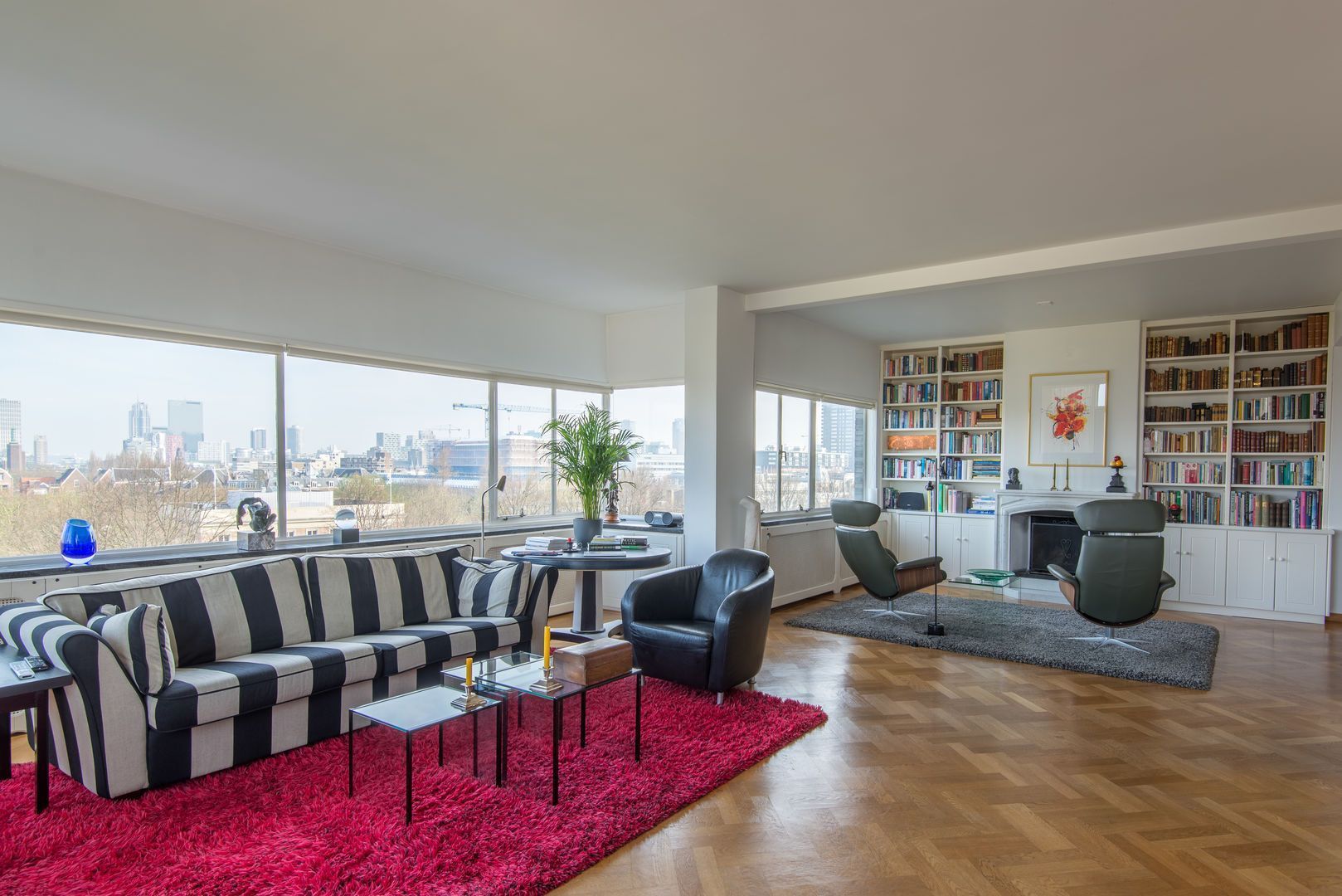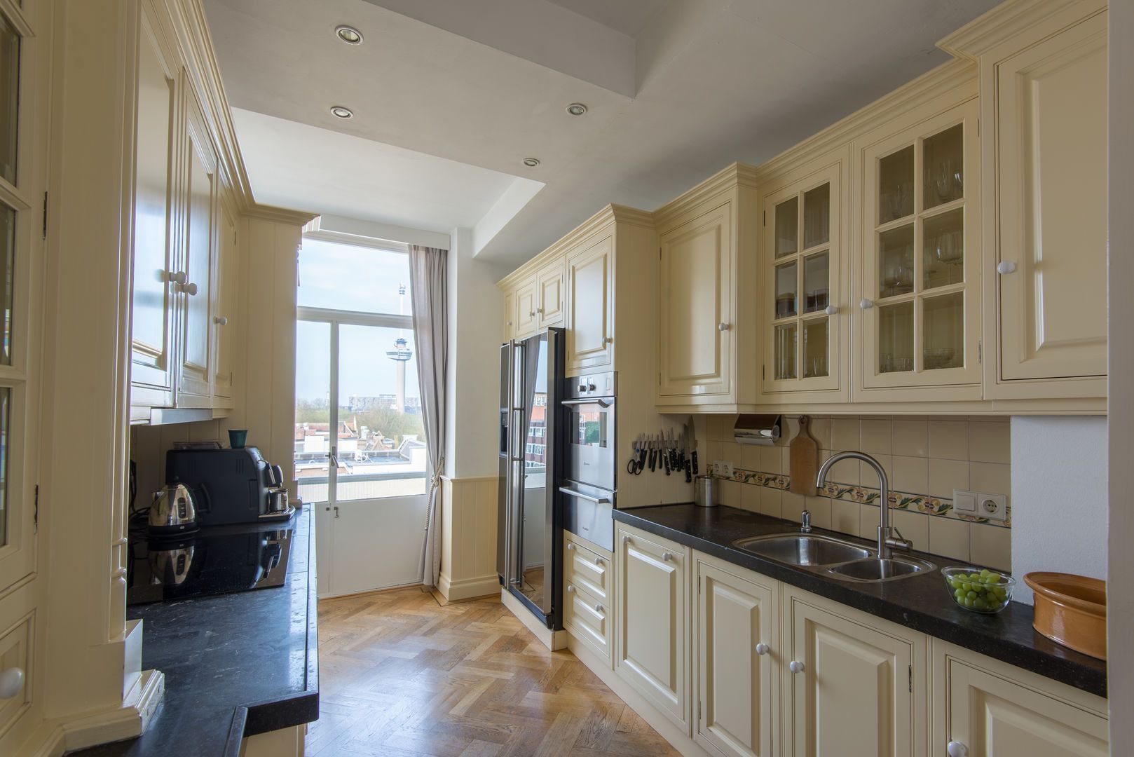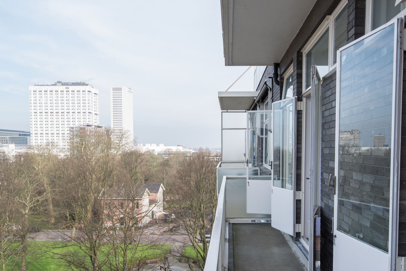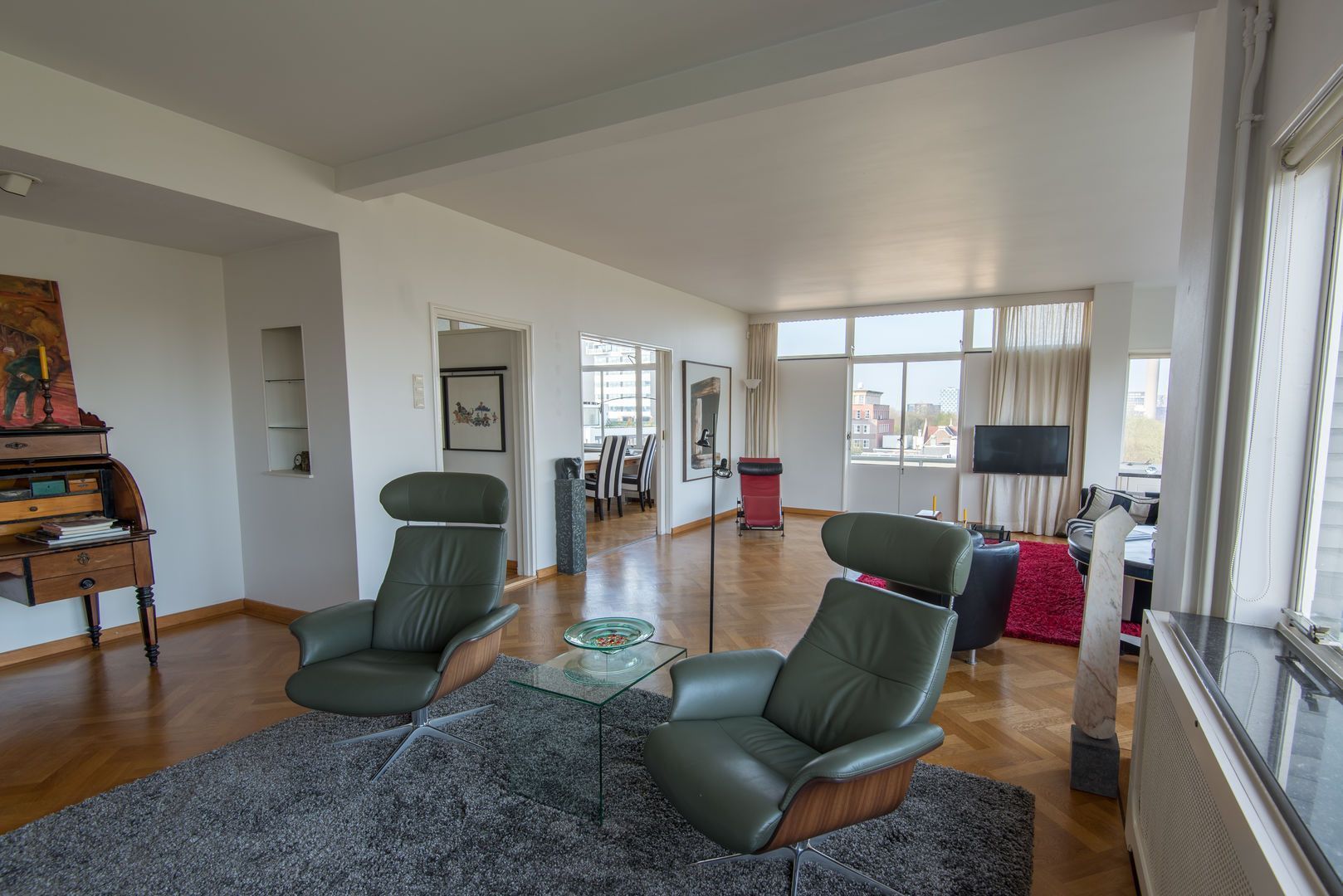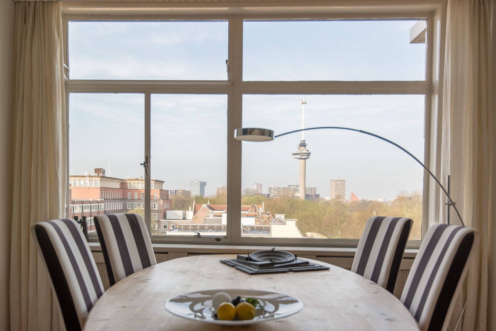 Op de 6e verdieping van het schitterende rijksmonument “Parklaanflat’ (1933, Architect W. van Tijen), geheel vrij gelegen 5 - KAMER APPARTEMENT (ca. 150m2) met 2 ruime BALCONS en een blijvend vrij uitzicht ‘over’ de bomen van de Parklaan op de Rotterdams stadse horizon. Gebouw ‘Flatgebouw Parklaan’ en het appartement bevinden zich in het blijvend rustigere deel van het Scheepvaartkwartier; een unieke ligging op een steenworp afstand van Het Park, de Veerhaven, diverse gewaardeerde restaurants en overige stadse faciliteiten, waaronder een landelijk bekende kruidenier. Het Scheepvaartkwartier heeft via de Maasboulevard, de Maastunnel en de Erasmusbrug snelle aansluitingen op de Ring van Rotterdam. Haltes voor tram, bus, watertaxi en het metrostation Leuvehaven (aansluiting naar Rotterdam CS) bevinden zich op loopafstand. De kleinschalige Parklaanflat herbergt slechts 8, over het algemeen, verdiepingsgrote appartementen. Samen met een professionele administrateur regisseren de eigenaren een secure en zorgvuldige Vereniging van Eigenaren. Lift en eigen berging in de onderbouw. Het gebouw heeft een draagconstructie van stalen kolommen en balken waardoor alle binnenwanden verwijderd kunnen worden. Het wordt dan mogelijk een vrij indeelbare loft van 150 m2 te maken. Indeling: (Onderstaande kamernummering verwijst naar de plattegrond) Begane grond: Afgesloten centrale entree. Prachtig ‘draaiend’ trappenhuis. 6e verdieping: Entree, ruime hal met eiken visgraat parketvloer, twee vaste kasten, royale toiletruimte. Videofoon. Fantastische woonkamer (1) ca. 50m2, met huisbrede raampartij met blijvend vrij uitzicht ‘over’ de bomen van de Parklaan op de Rotterdams’ stadse horizon. Een eiken visgraatparket, open haard, schouw en openslaande deuren naar Balcon op het Westen. Schuifdeur naar: Eetkamer (2) ca. 14m2, met eiken visgraatparket. Keukenruimte ca. 9m2, met op maat gemaakte keuken in Engelse stijl met een hardstenen aanrechtblad en voorzien van alle wenselijke apparatuur. Openslaande deuren naar het 2e BALCON op het Westen. Lange dagverlichte gang met kastenwand. Ouderslaapkamer (3) ca. 17,5m2 met ingebouwde kasten, openslaande deuren naar het 2e BALCON en aansluitend een fraaie badkamer voorzien van bubbelbad, douche, dubbele wastafel en watercloset. Deur naar (vlucht)balcon. Slaapkamer (4) ca. 10m2 met wastafel, ingebouwde kast en openslaande deuren naar het 2e BALCON. Studeer-/werkkamer (ook te gebruiken als slaapkamer) (5) ca. 8m2 met ingebouwde kast. Bijzonderheden: - Bouwjaar 1933. - In de periode 1993 - 1995 is het gebouw volledig gerenoveerd. - De Parklaanflat is aangewezen als Rijksmonument. - Onderdeel beschermd Stads- en/of Dorpsgezicht. - Gelegen op eigen grond. - Woonoppervlak ca. 150m2. - Verwarming door middel van stadsverwarming. - Warm water door middel van boiler. - Videophone en alarminstallatie. - Zonneschermen. - Bijdrage V.v.E. € 223,51 per maand (exclusief voorschot stookkosten).
