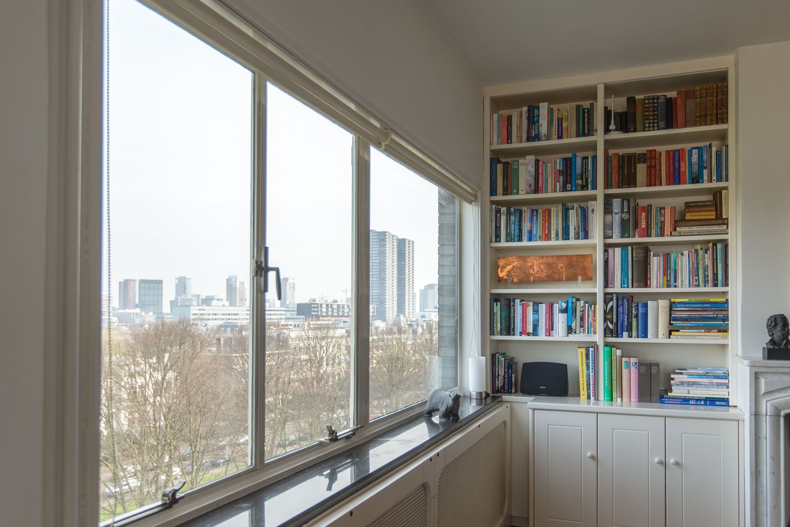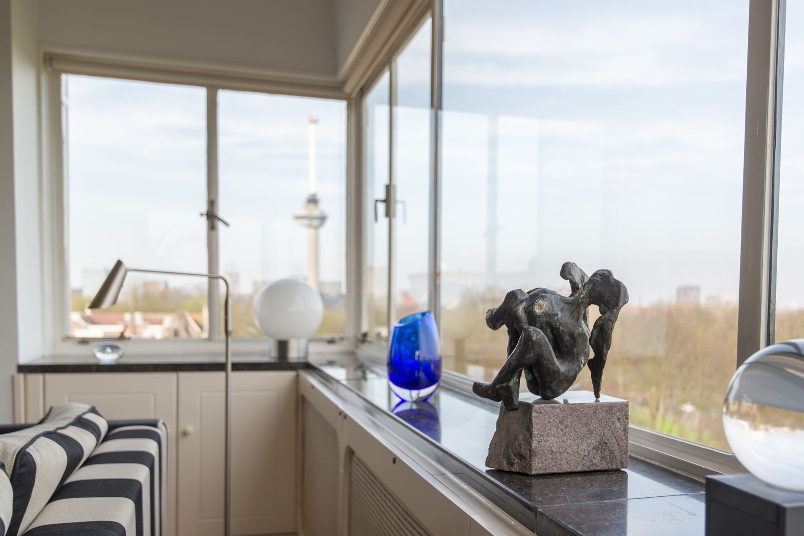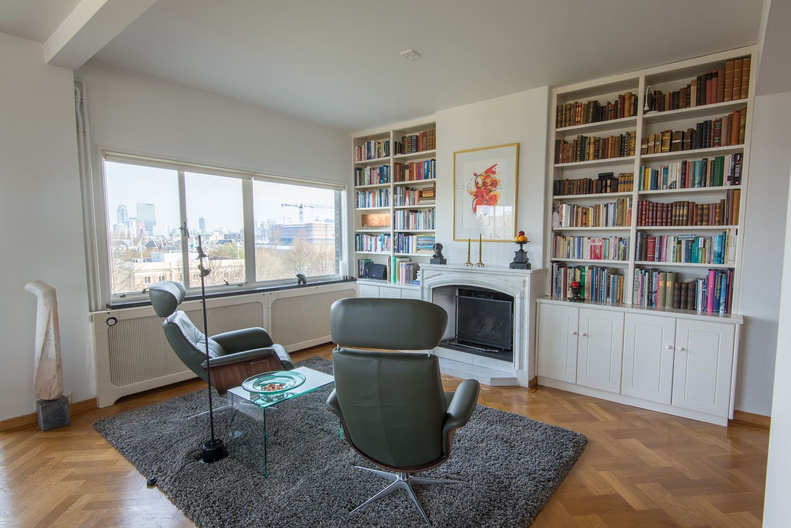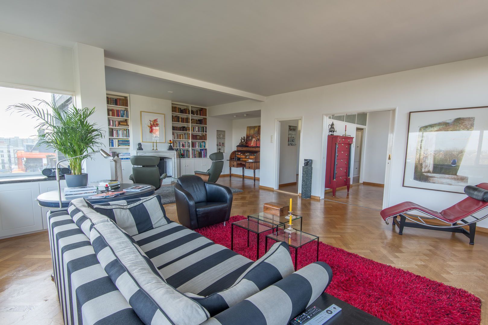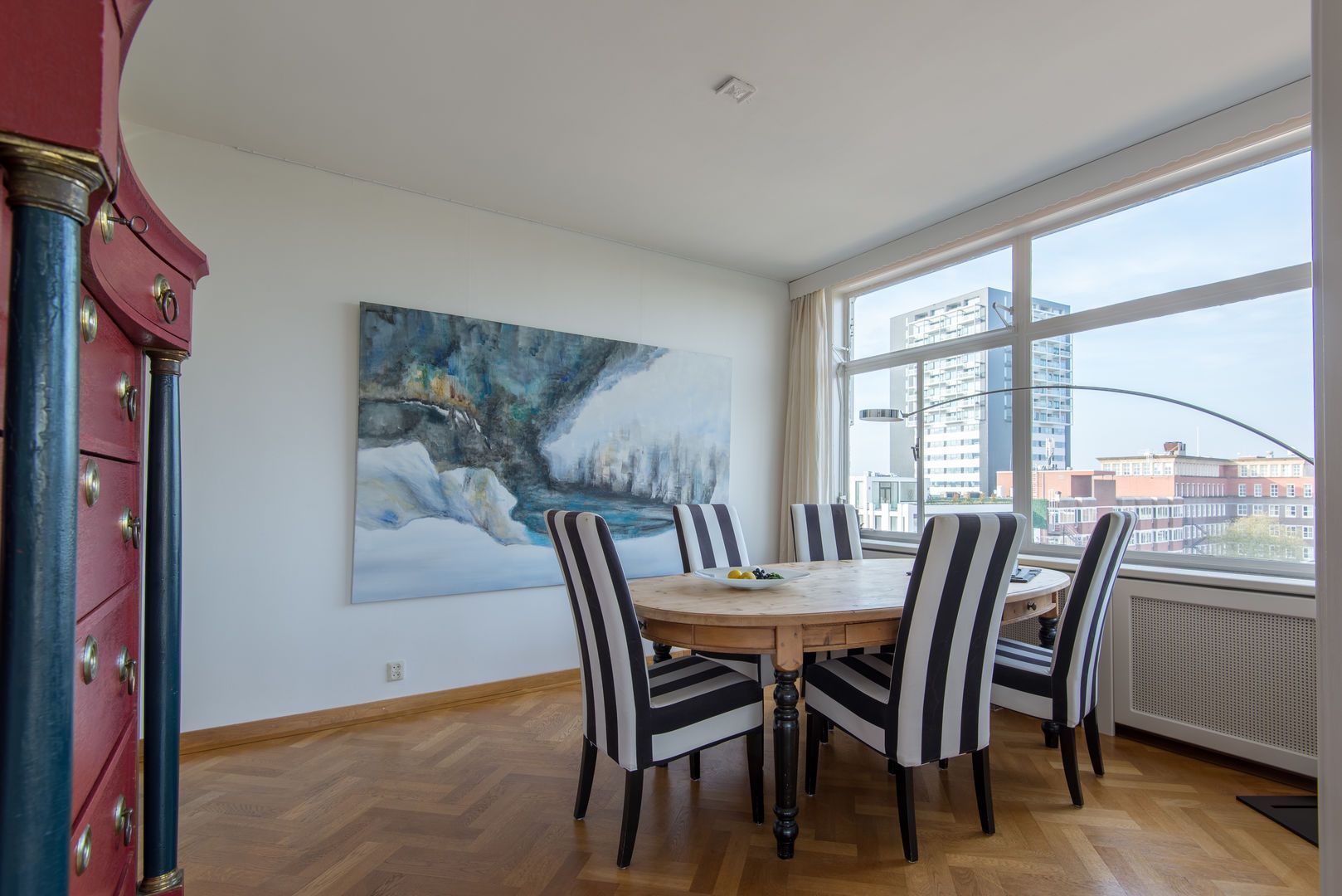 Op de 6e verdieping van het schitterende rijksmonument “Parklaanflat’ (1933, Architect W. van Tijen), geheel vrij gelegen 5 - KAMER APPARTEMENT (ca. 150m2) met 2 ruime BALCONS en een blijvend vrij uitzicht ‘over’ de bomen van de Parklaan op de Rotterdams stadse horizon. Gebouw ‘Flatgebouw Parklaan’ en het appartement bevinden zich in het blijvend rustigere deel van het Scheepvaartkwartier; een unieke ligging op een steenworp afstand van Het Park, de Veerhaven, diverse gewaardeerde restaurants en overige stadse faciliteiten, waaronder een landelijk bekende kruidenier. Het Scheepvaartkwartier heeft via de Maasboulevard, de Maastunnel en de Erasmusbrug snelle aansluitingen op de Ring van Rotterdam. Haltes voor tram, bus, watertaxi en het metrostation Leuvehaven (aansluiting naar Rotterdam CS) bevinden zich op loopafstand. De kleinschalige Parklaanflat herbergt slechts 8, over het algemeen, verdiepingsgrote appartementen. Samen met een professionele administrateur regisseren de eigenaren een secure en zorgvuldige Vereniging van Eigenaren. Lift en eigen berging in de onderbouw. Het gebouw heeft een draagconstructie van stalen kolommen en balken waardoor alle binnenwanden verwijderd kunnen worden. Het wordt dan mogelijk een vrij indeelbare loft van 150 m2 te maken. Indeling: (Onderstaande kamernummering verwijst naar de plattegrond) Begane grond: Afgesloten centrale entree. Prachtig ‘draaiend’ trappenhuis. 6e verdieping: Entree, ruime hal met eiken visgraat parketvloer, twee vaste kasten, royale toiletruimte. Videofoon. Fantastische woonkamer (1) ca. 50m2, met huisbrede raampartij met blijvend vrij uitzicht ‘over’ de bomen van de Parklaan op de Rotterdams’ stadse horizon. Een eiken visgraatparket, open haard, schouw en openslaande deuren naar Balcon op het Westen. Schuifdeur naar: Eetkamer (2) ca. 14m2, met eiken visgraatparket. Keukenruimte ca. 9m2, met op maat gemaakte keuken in Engelse stijl met een hardstenen aanrechtblad en voorzien van alle wenselijke apparatuur. Openslaande deuren naar het 2e BALCON op het Westen. Lange dagverlichte gang met kastenwand. Ouderslaapkamer (3) ca. 17,5m2 met ingebouwde kasten, openslaande deuren naar het 2e BALCON en aansluitend een fraaie badkamer voorzien van bubbelbad, douche, dubbele wastafel en watercloset. Deur naar (vlucht)balcon. Slaapkamer (4) ca. 10m2 met wastafel, ingebouwde kast en openslaande deuren naar het 2e BALCON. Studeer-/werkkamer (ook te gebruiken als slaapkamer) (5) ca. 8m2 met ingebouwde kast. Bijzonderheden: - Bouwjaar 1933. - In de periode 1993 - 1995 is het gebouw volledig gerenoveerd. - De Parklaanflat is aangewezen als Rijksmonument. - Onderdeel beschermd Stads- en/of Dorpsgezicht. - Gelegen op eigen grond. - Woonoppervlak ca. 150m2. - Verwarming door middel van stadsverwarming. - Warm water door middel van boiler. - Videophone en alarminstallatie. - Zonneschermen. - Bijdrage V.v.E. € 223,51 per maand (exclusief voorschot stookkosten).