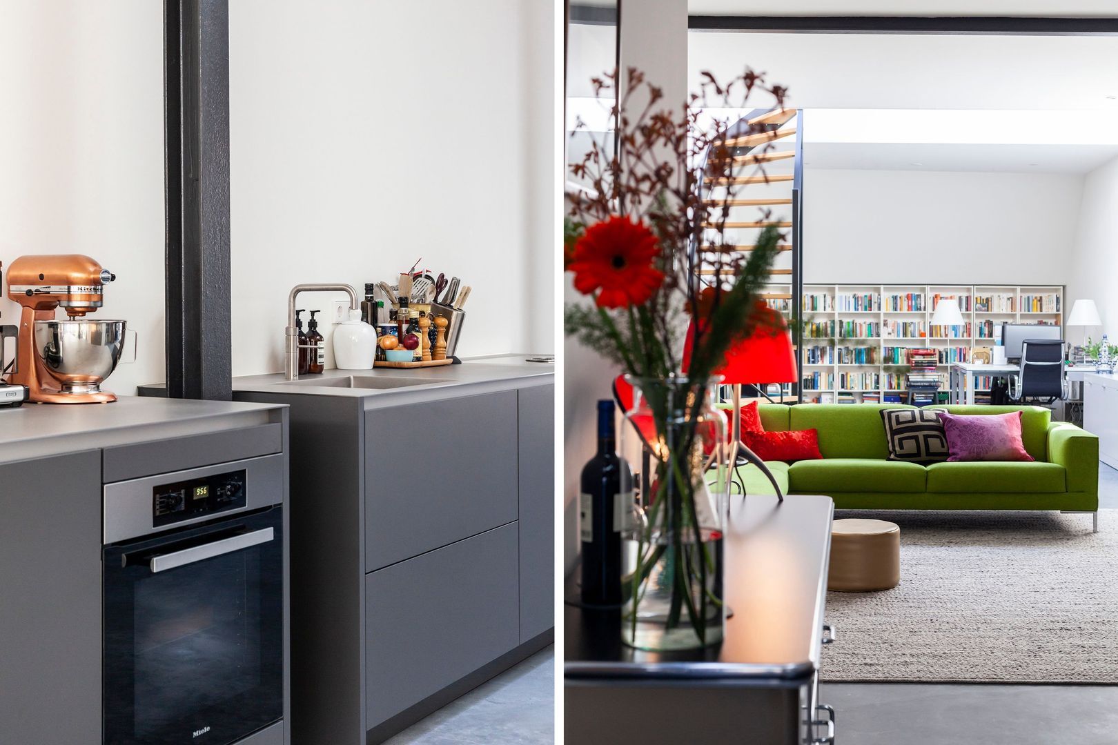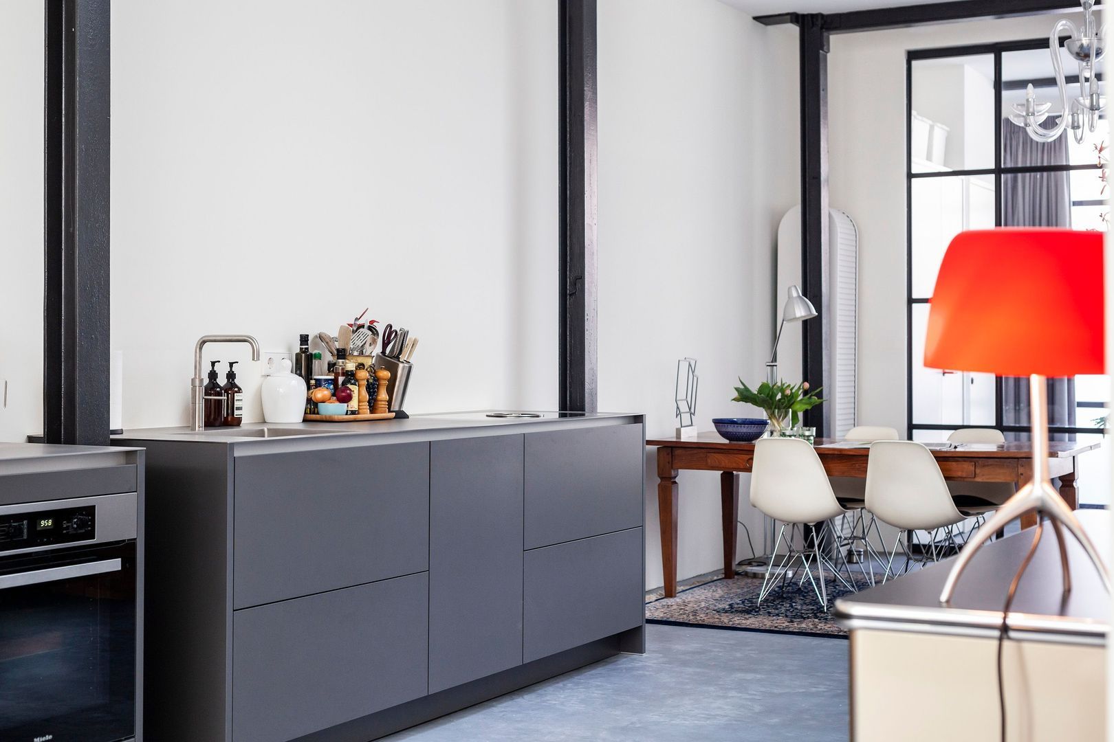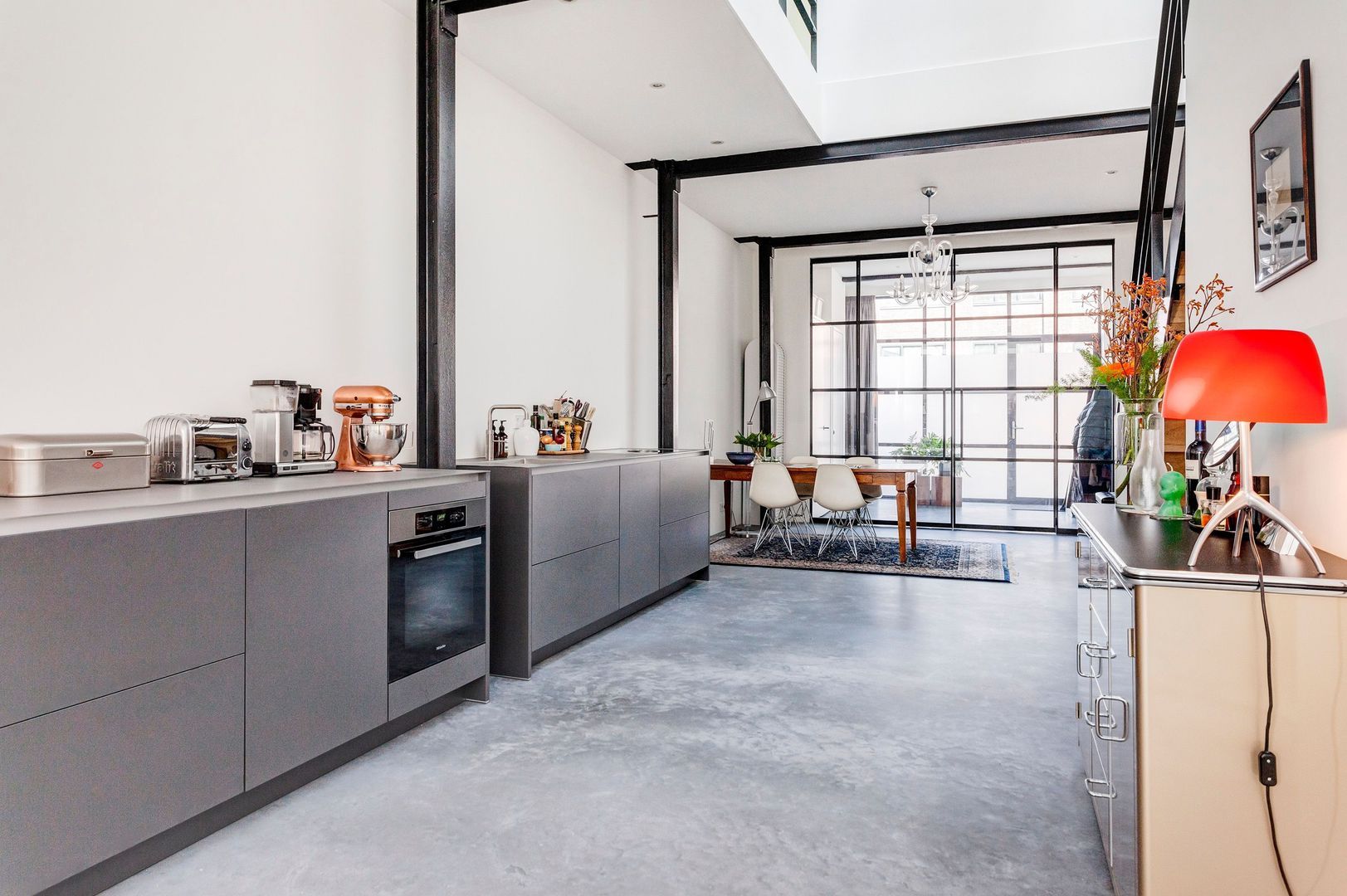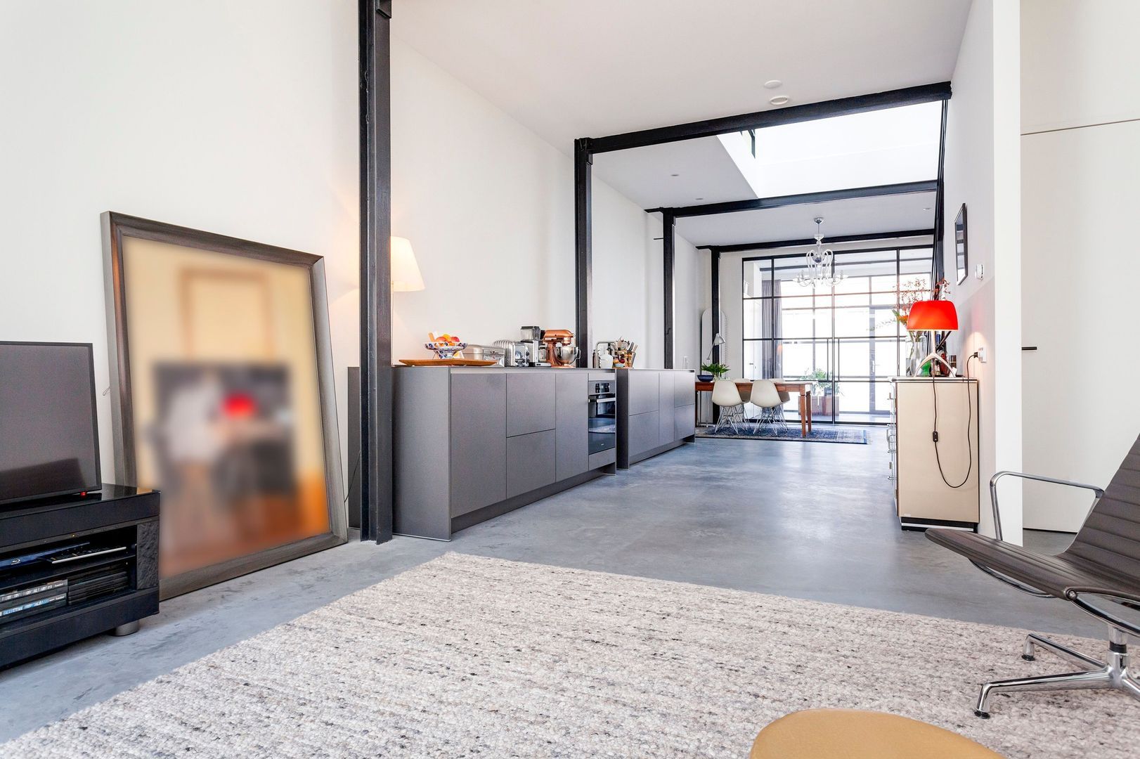 Huisbrede LEEFRUIMTE ca. 80m2, momenteel bestaande uit een eetgedeelte met moderne luxe keukenopstelling (Poggenpohl) met alle wenselijke inbouwapparatuur, een doorloop naar het zitgedeelte met een trap naar dakterras (ca. 15m2, zuid..) en een werkgedeelte.