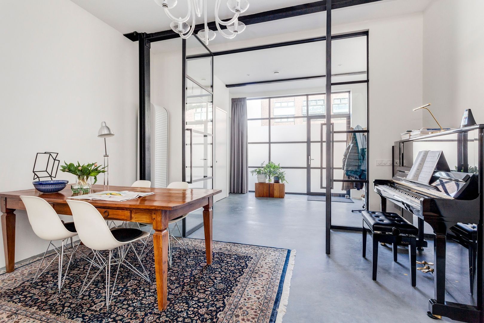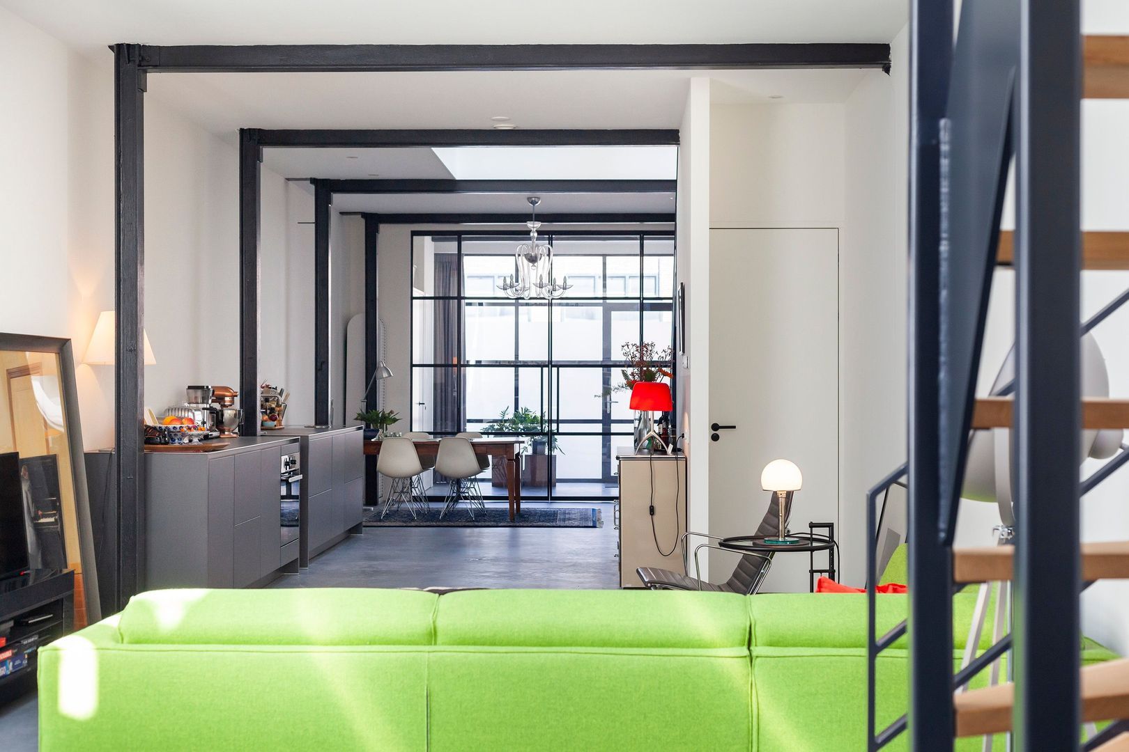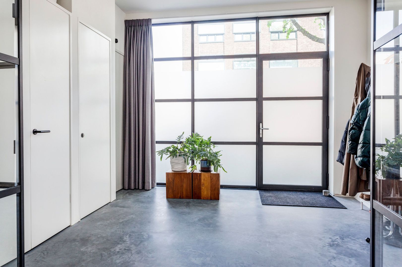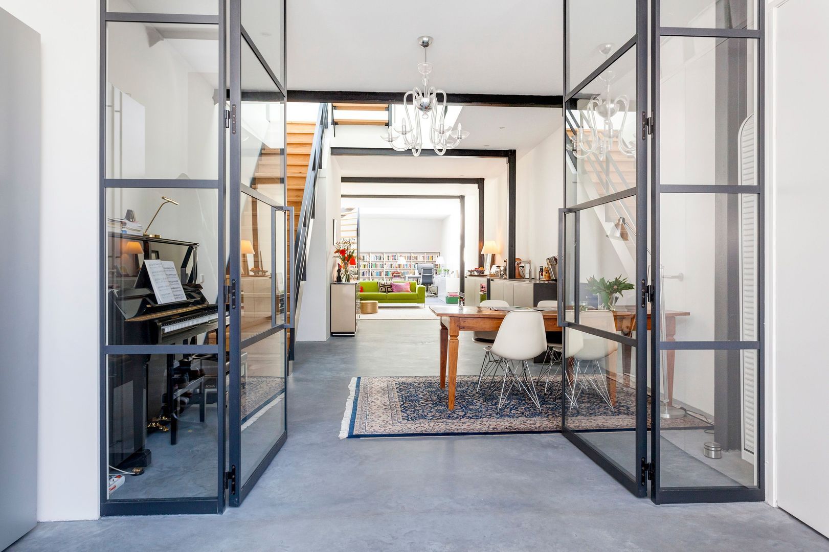 Interne zwartstalen gevel met dubbele deuren naar de ….