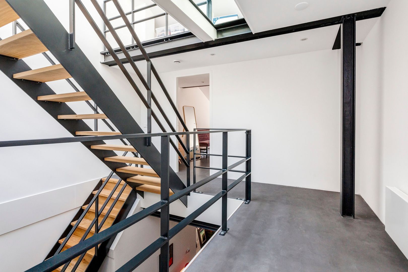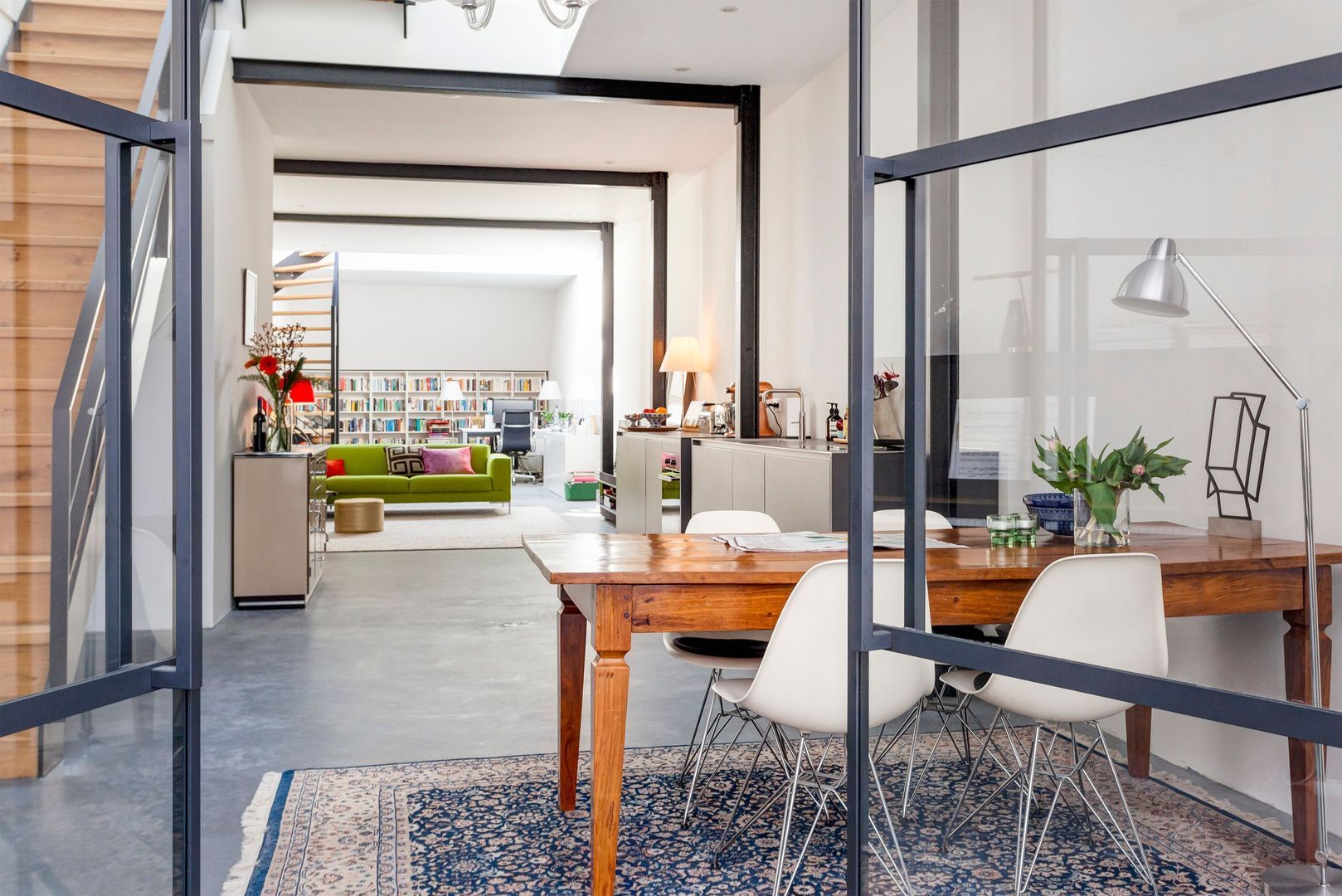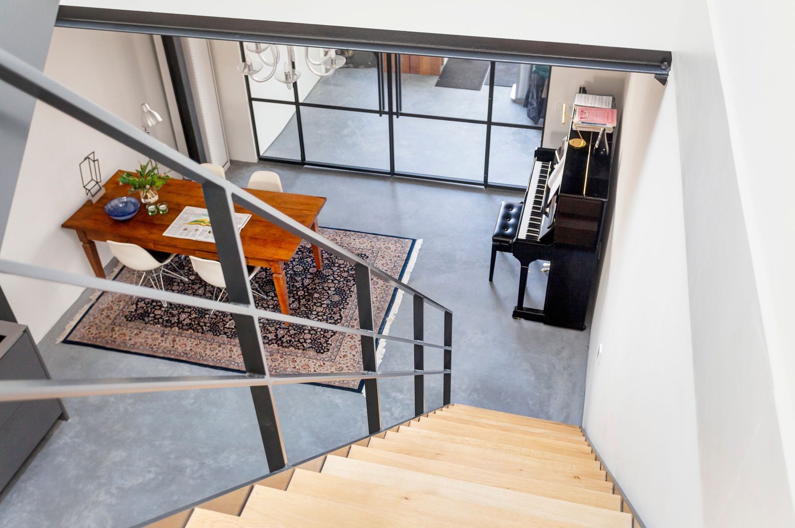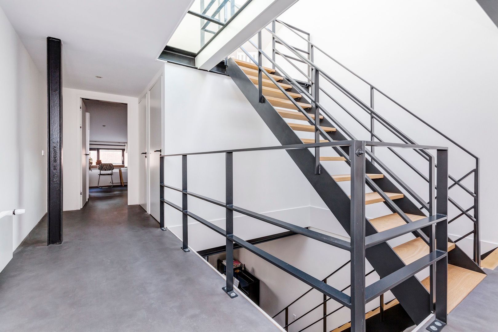Interne zwartstalen gevel met dubbele deuren naar de ….