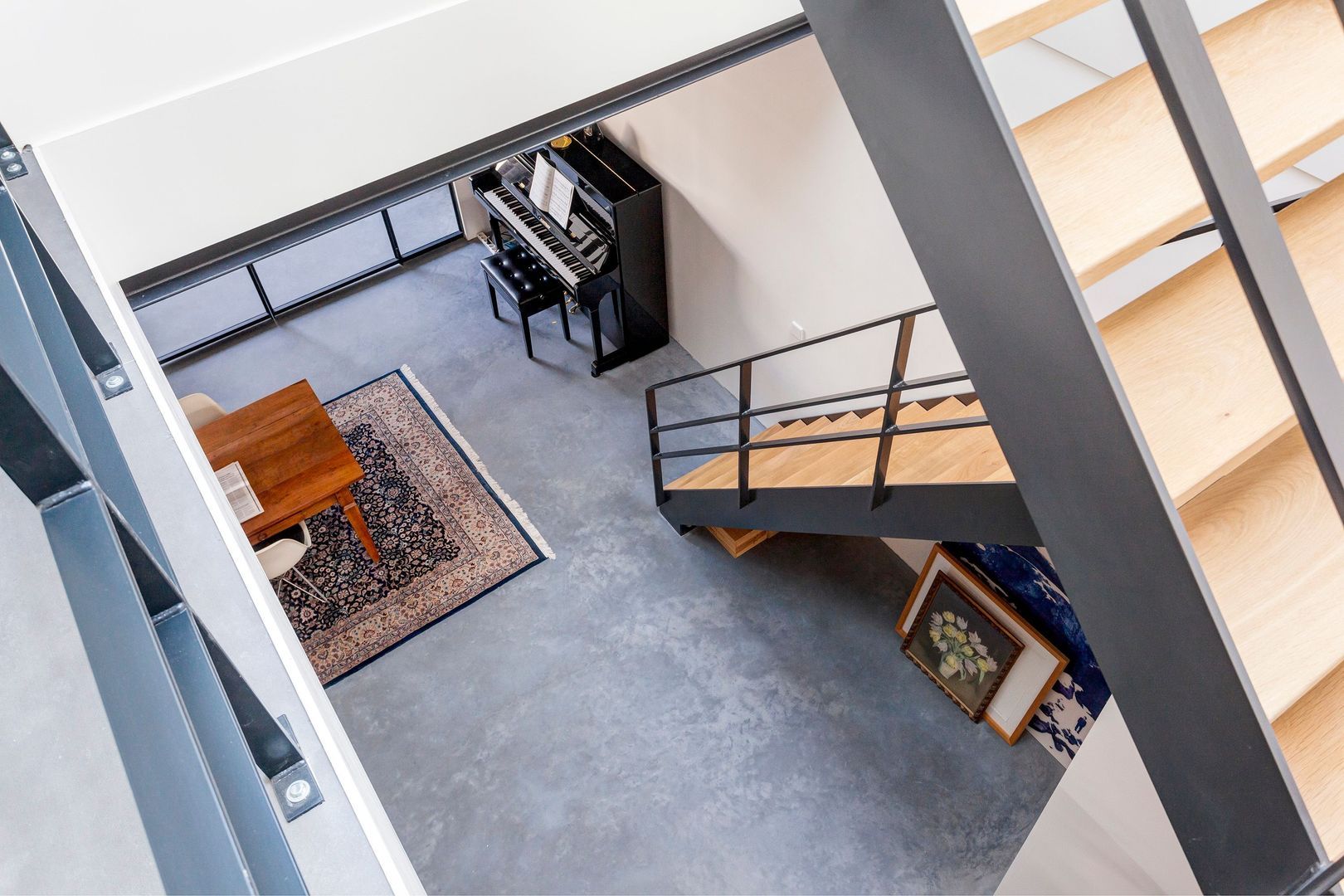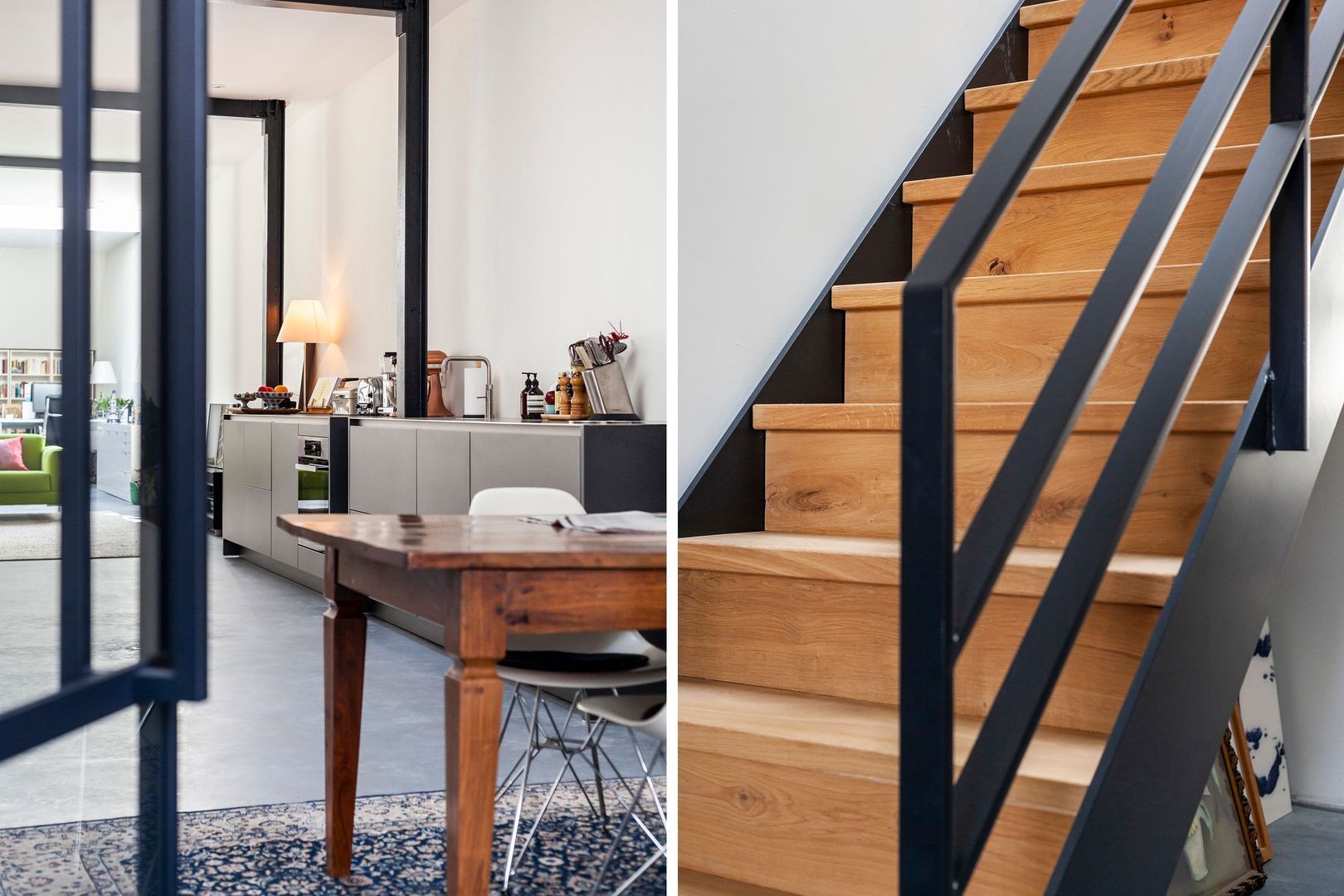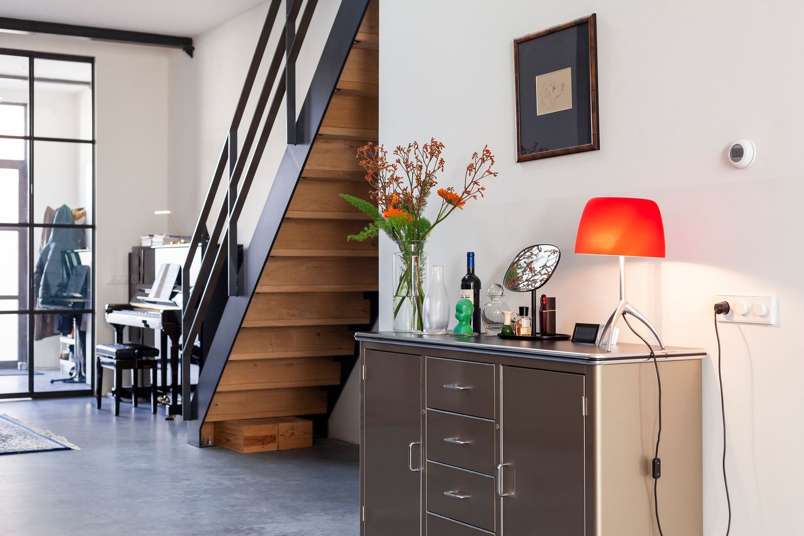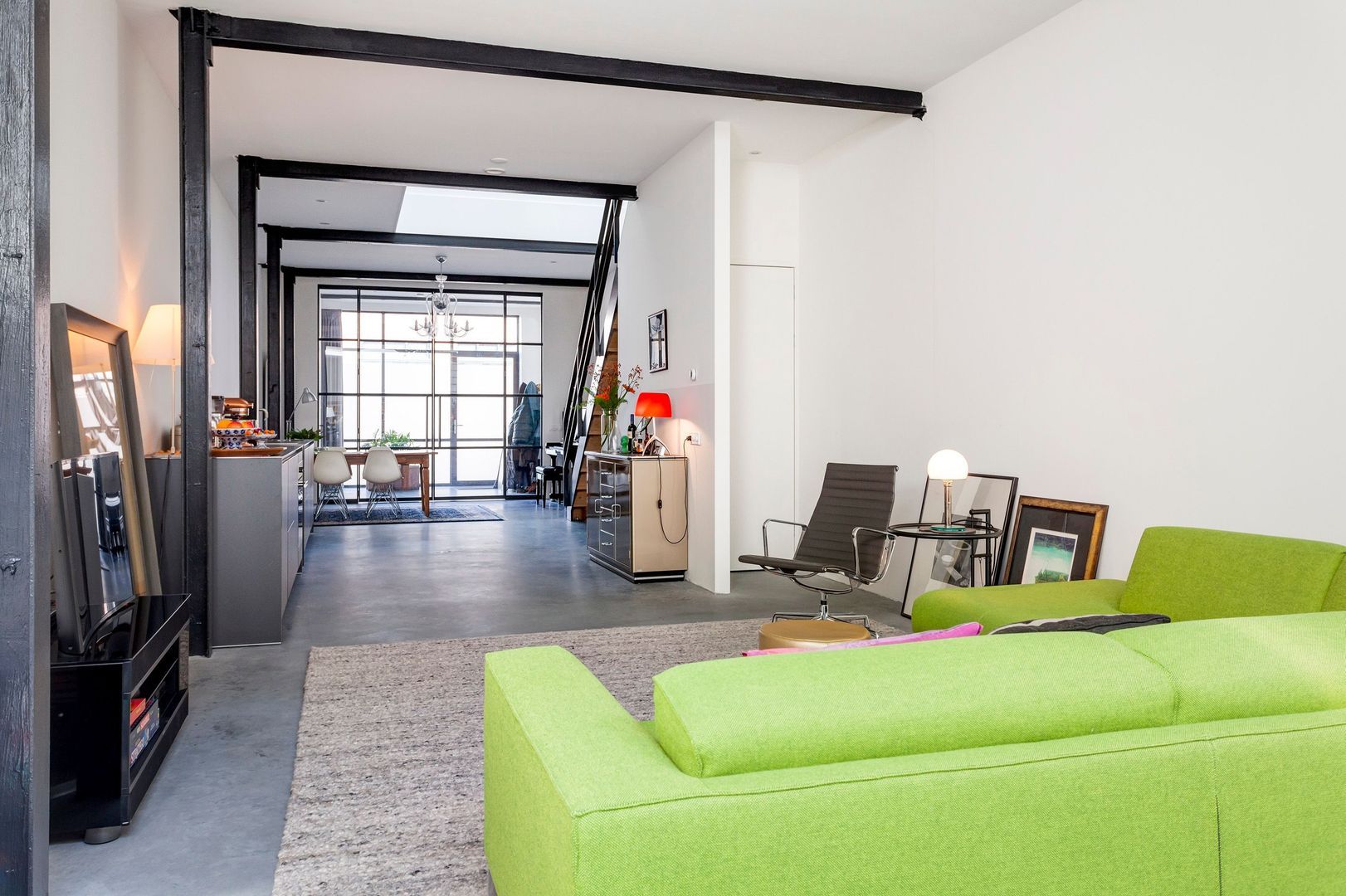 Interne zwartstalen gevel met dubbele deuren naar de ….