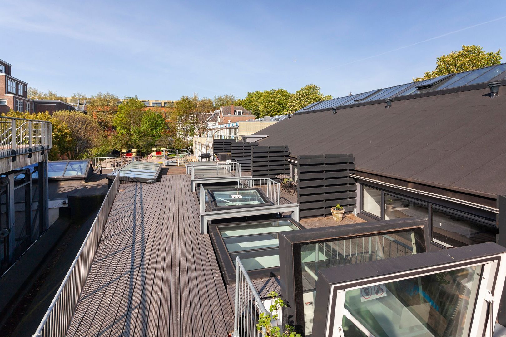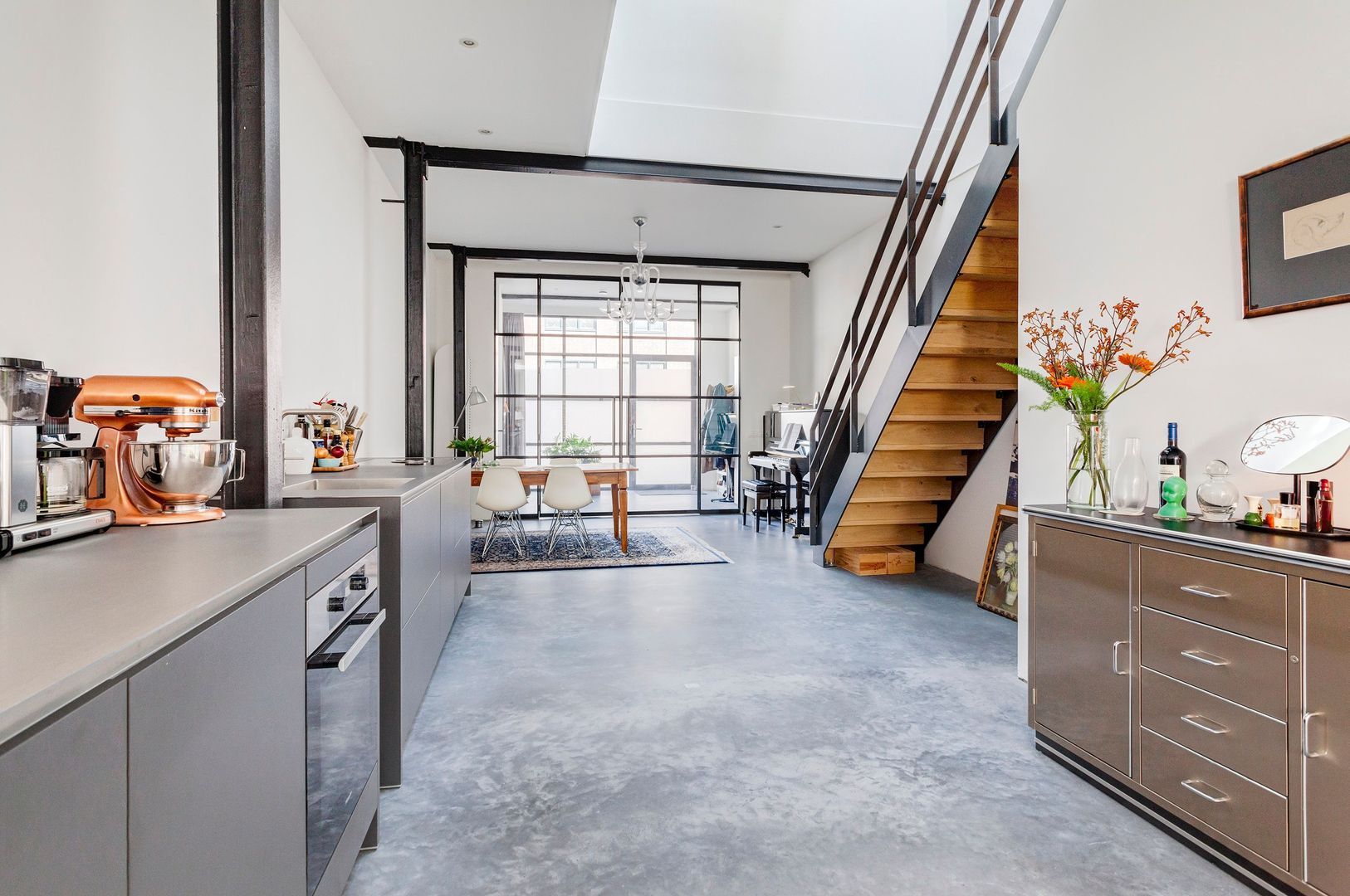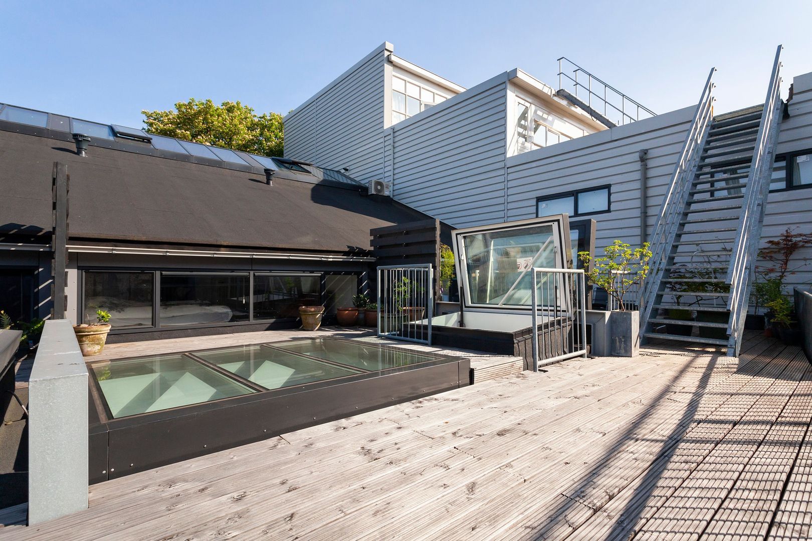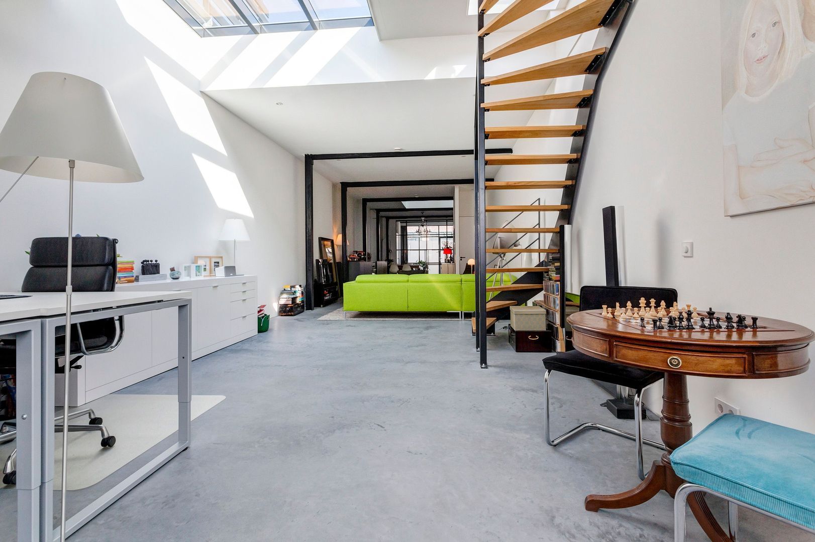 De hoge en open woonruimte op de begane grond, van bijna 80m2, voelt aan als een LOFT (dus toekomstbestendig wonen…) met een gemakkelijke eigen stalen trap naar het dakterras op het zuiden.