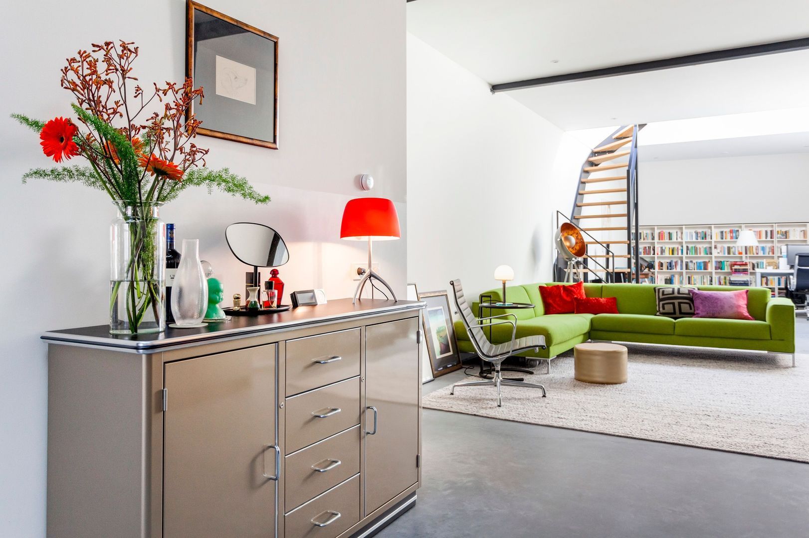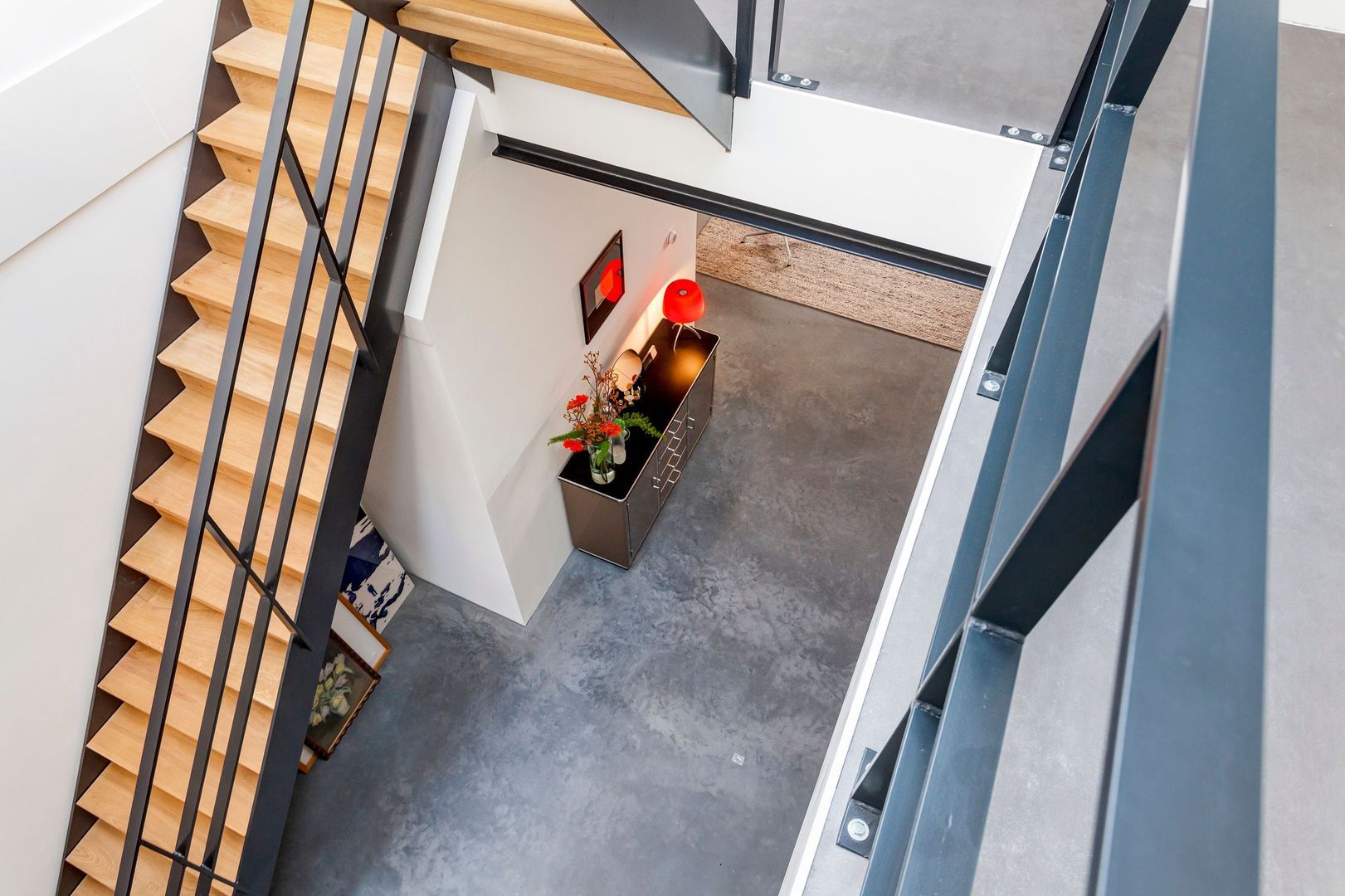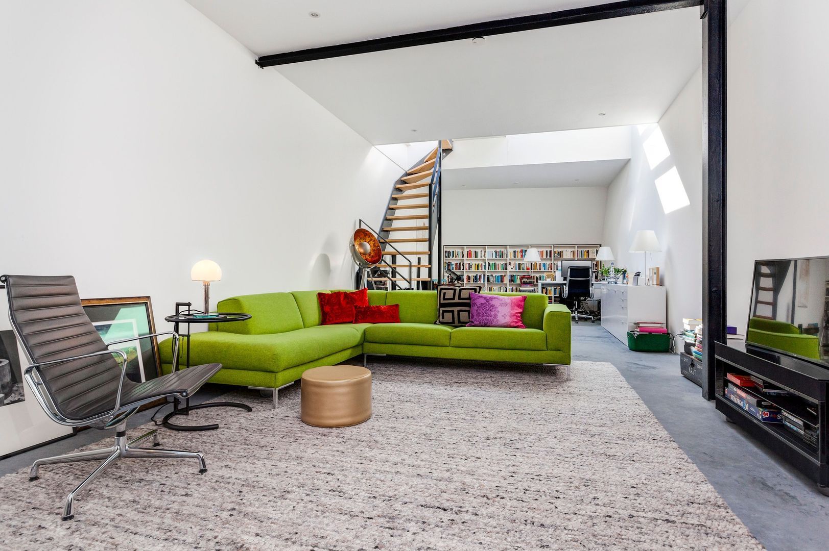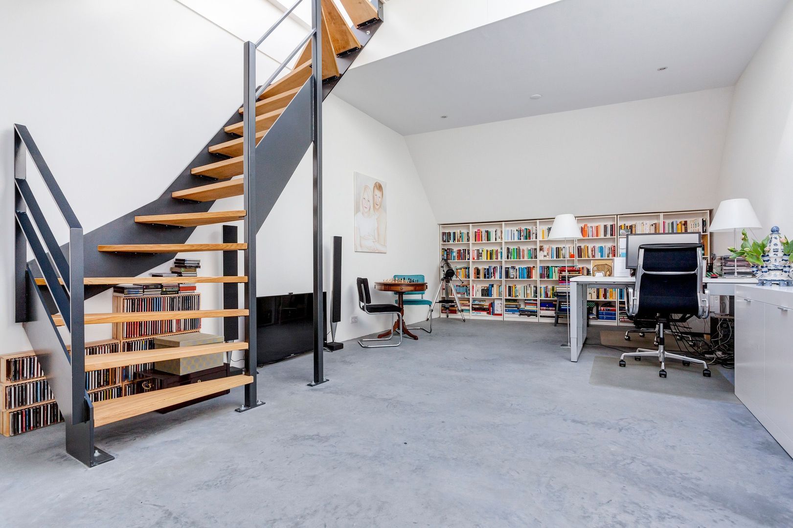 De hoge en open woonruimte op de begane grond, van bijna 80m2, voelt aan als een LOFT (dus toekomstbestendig wonen…) met een gemakkelijke eigen stalen trap naar het dakterras op het zuiden.